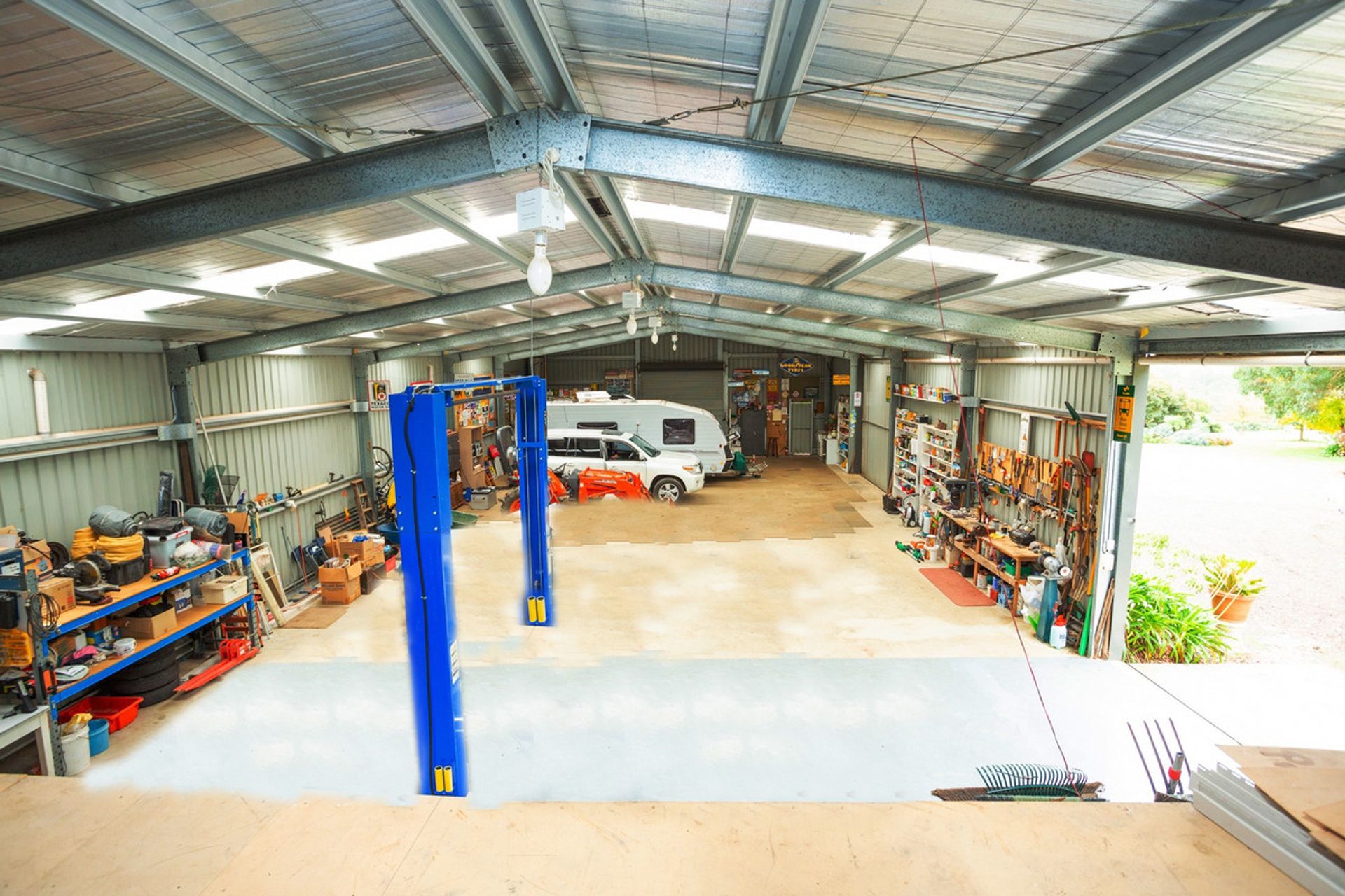 Excellent 40'x90' Colorbond machinery/work shed with mains power plus solar panels, concrete floor, two sliding access doors, mezzanine storage level and shower & toilet facilities. Plus additional Colorbond open machinery/wood shed.
