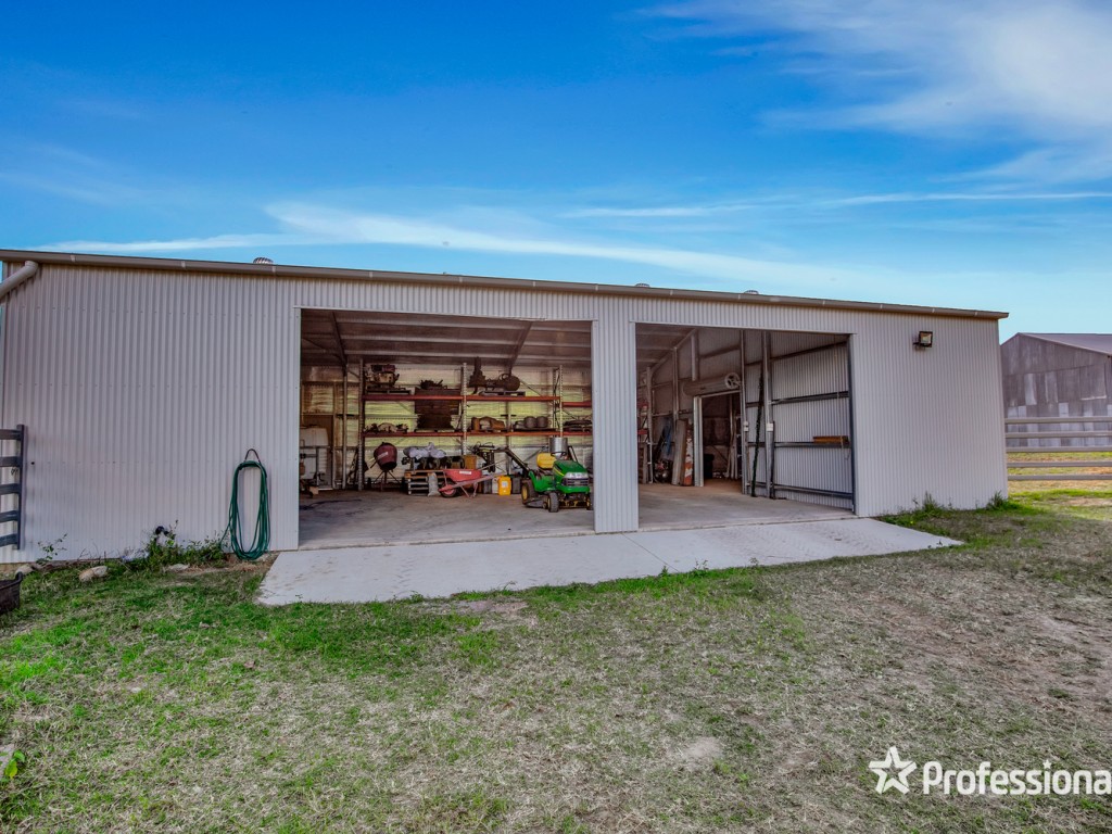 Sheds include a 9m x 8m hay shed, 12m x 11m open front machinery shed and a near new 16m x 9m steel framed shed with concrete floor and power connected, storage and work area.