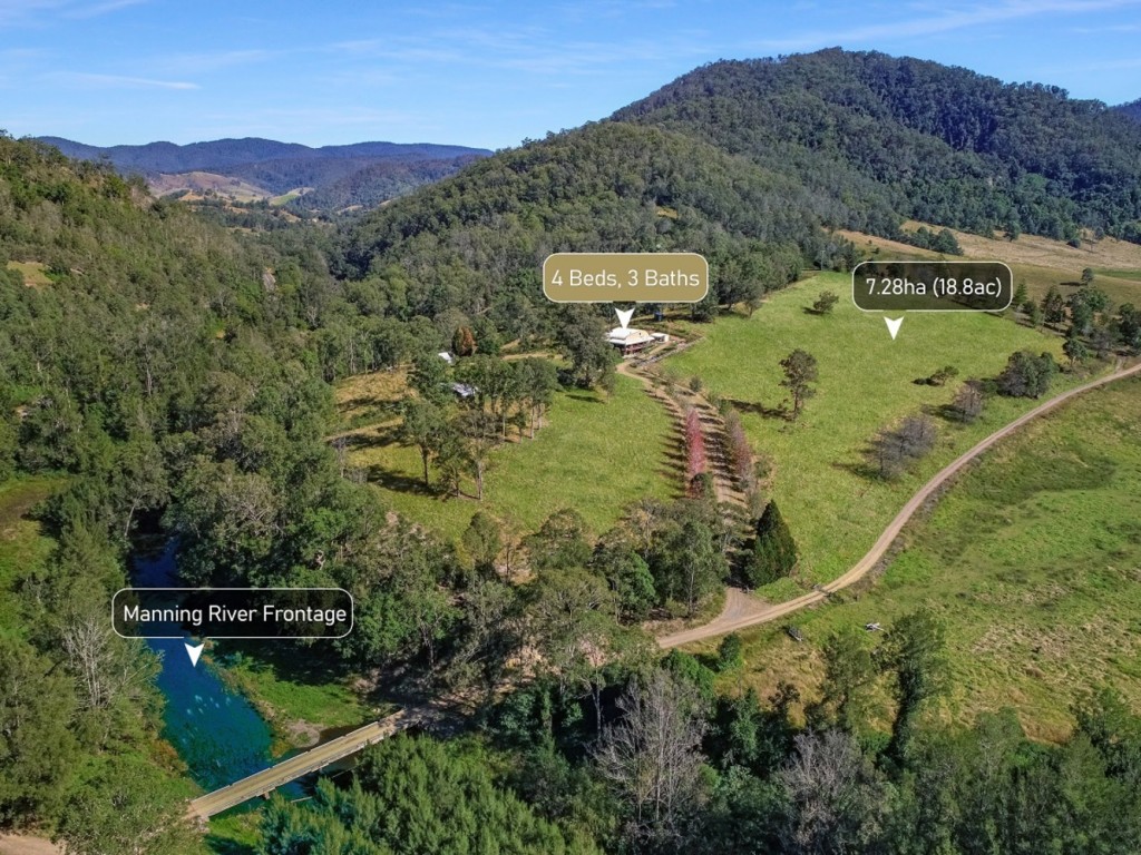 If ‘bliss’ were an image, it would be this delightful 7.28ha (18.8ac) boutique rural lifestyle property Located in Tibbuc. With a tranquil rural setting, breathtaking valley and hill views and a full kilometre of the Manning River frontage meandering along one boundary, there is much to offer buyers seeking a relaxed, more self-sufficient lifestyle in a sought-after location. The craftsman built split level Colourbond home is designed and sited to offer an indoor/outdoor lifestyle that maximises its aspect. Nestled into a gentle hill, the ground level offers a double bedroom, well-appointed bathroom and spacious rumpus room making this area ideal as a teenager’s retreat, guest accommodation or excellent home office. There is also a spacious laundry with external access. A wide, covered front verandah and spacious double carport/caravan space or additional entertainment area make this a very versatile space.
