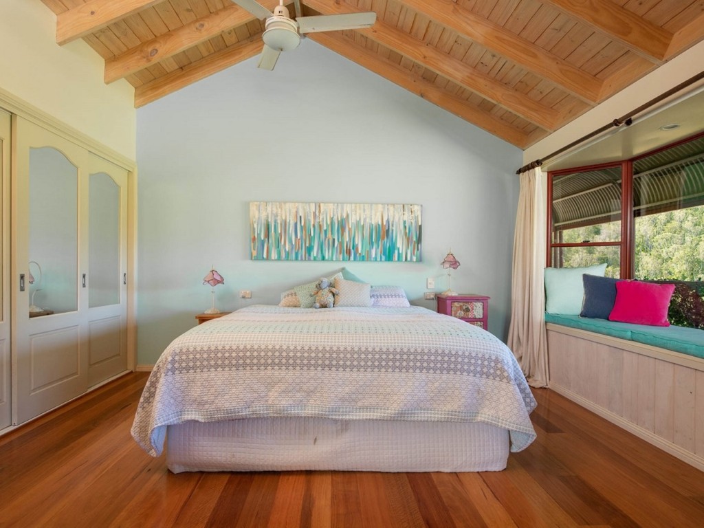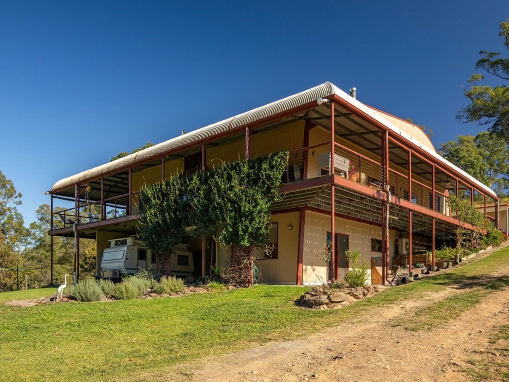Atop the internal staircase is the heart of the home. Soaring cathedral ceilings, beautiful polished hardwood floorboards and a light-filled interior that merges the home with its stunning surroundings deliver superb living. Accessible from every room, verandahs on three sides offer plenty of year-round relaxation and alfresco dining spaces. Free-flowing living and dining areas flow to the bespoke kitchen which is an entertainer’s dream. Beautiful timber cabinetry, sweeping bench space including island bench, Agga-style range with gas cooktop and electric oven, butler’s sink, dishwasher and pull out wall pantry will bring out the master chef in every cook. The sophisticated Master suite boasts BIR, stylish ensuite and French doors to the verandah. Two further queen-size bedrooms each with BIR share a modern, centrally located family bathroom with vanity, bath, shower, and toilet. With its lovely views and dual access to the verandah, a spacious craft/games room/study is a very appealing space. Irrigation to low maintenance garden beds and manicured lawns gently rolling to a delightful rock-bordered fishpond make for lovely play spaces. Additional features include reverse-cycle air-conditioning, slow combustion heating, ceiling fans, enviro-cycle waste-management system, 30000lt rainwater tank, front gate mail delivery, and cute ranch-style tin shed with glass sliding doors to a small deck. An artist’s studio or potential self-contained B&B being possible options.