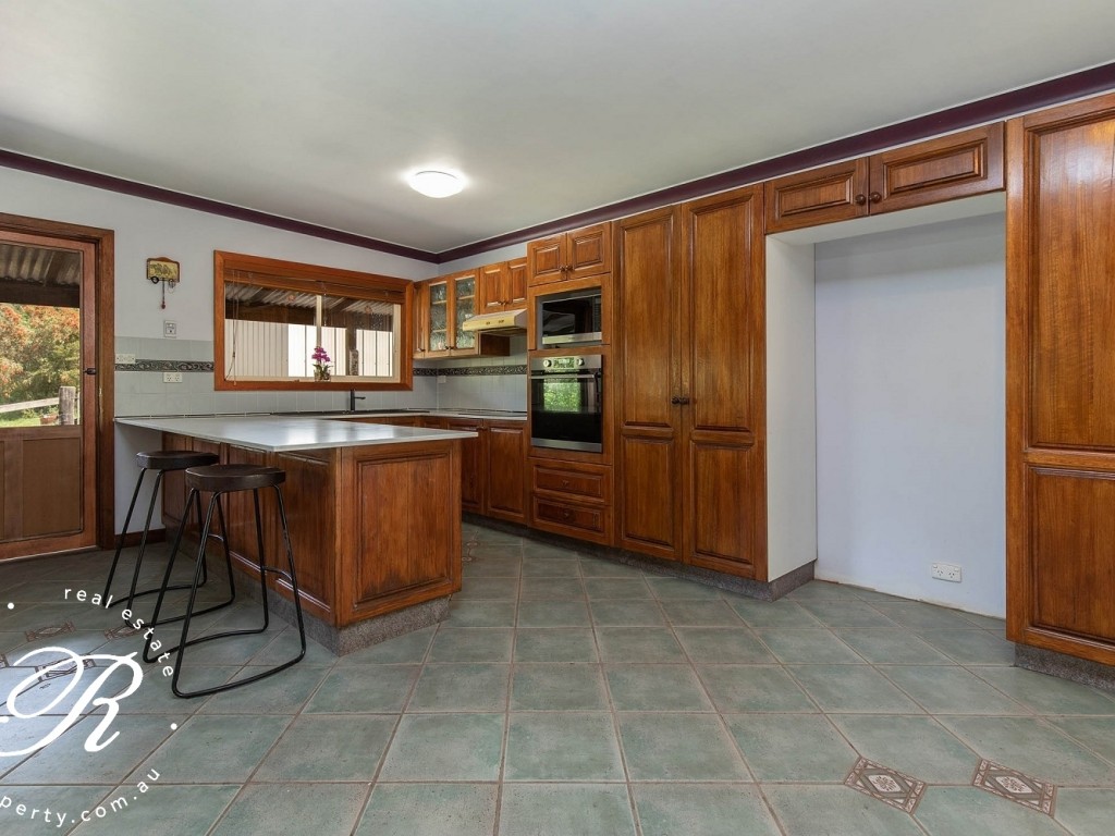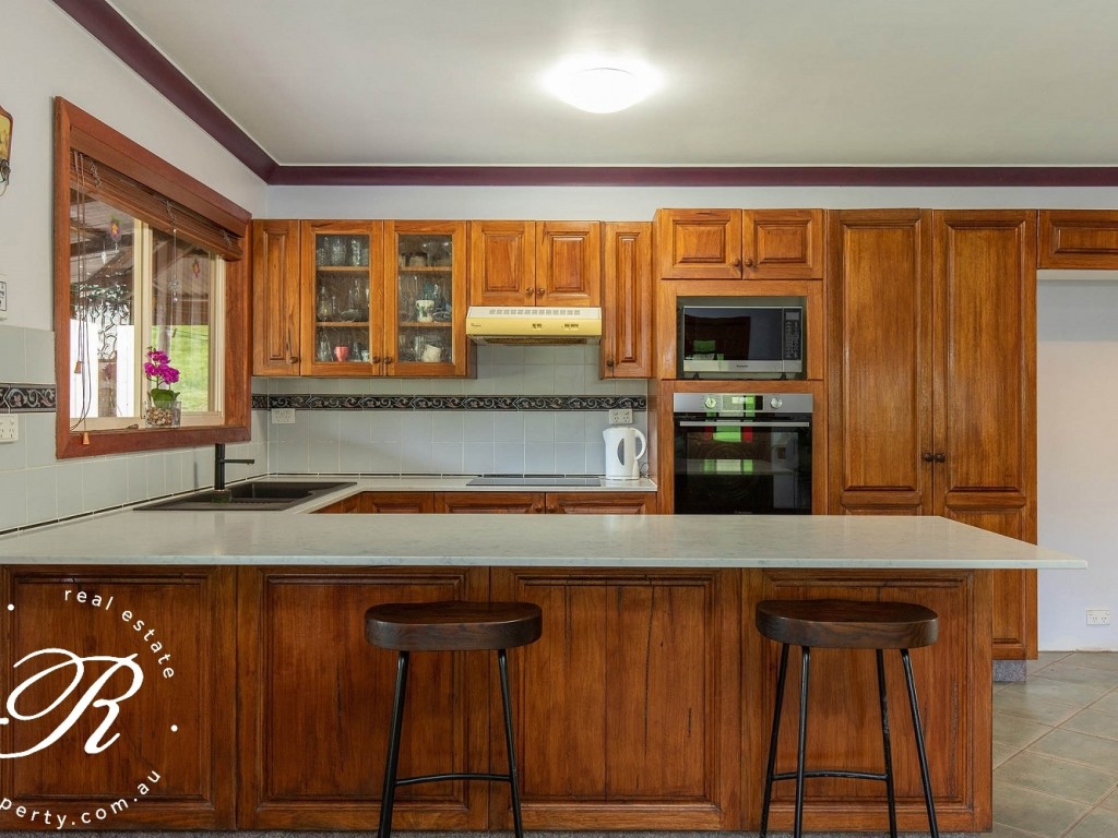 Surrounded by sweeping lawns and set within a delightful 4.49ha (11ac) parcel of native timber, this western red cedar cottage-style home is the perfect permanent or weekend country retreat. A north-facing aspect provides for energy-saving passive solar benefits. Step from the wide, covered verandah to a spacious open-plan living and dining space, the all-white palette contrasting beautifully with the timber beams and detail. Continuing the theme, the kitchen boasts timber cabinetry, sweeping stone benchtops, touch-control electric cooktop, wall oven, built-in microwave space and large pantry. A breakfast bar delivers a relaxed casual eating spot. Easy-care floor tiles throughout the family areas enhance the sense of space. Two defining feature of this lovely property are the expansive covered outdoor entertainment area and the in-ground saltwater swimming pool. Fully fenced and with paved pool deck, the solar-heated pool is sure to be popular during our long Summer months. The house garden is fully fenced providing a safe play area for children and pets.