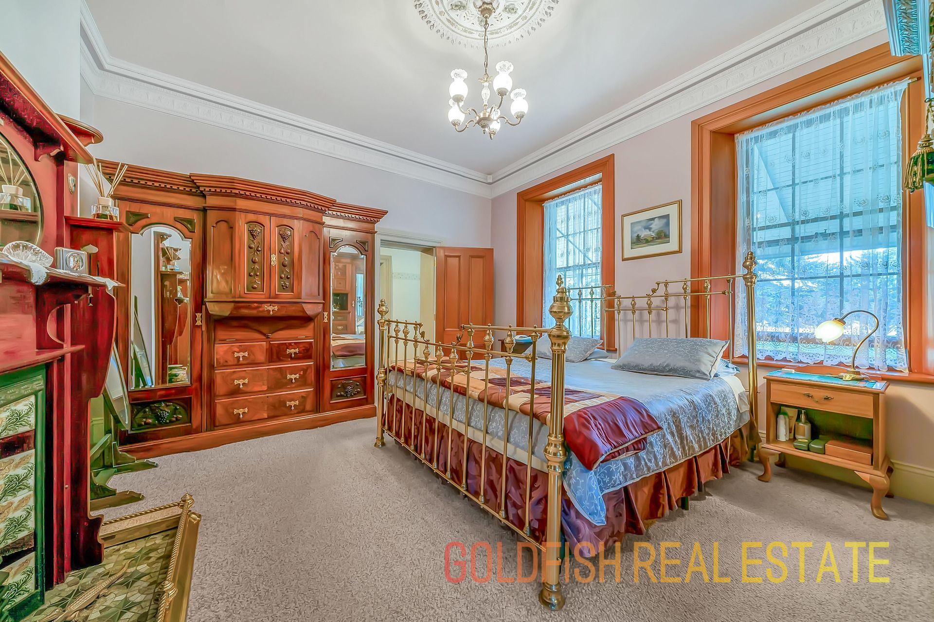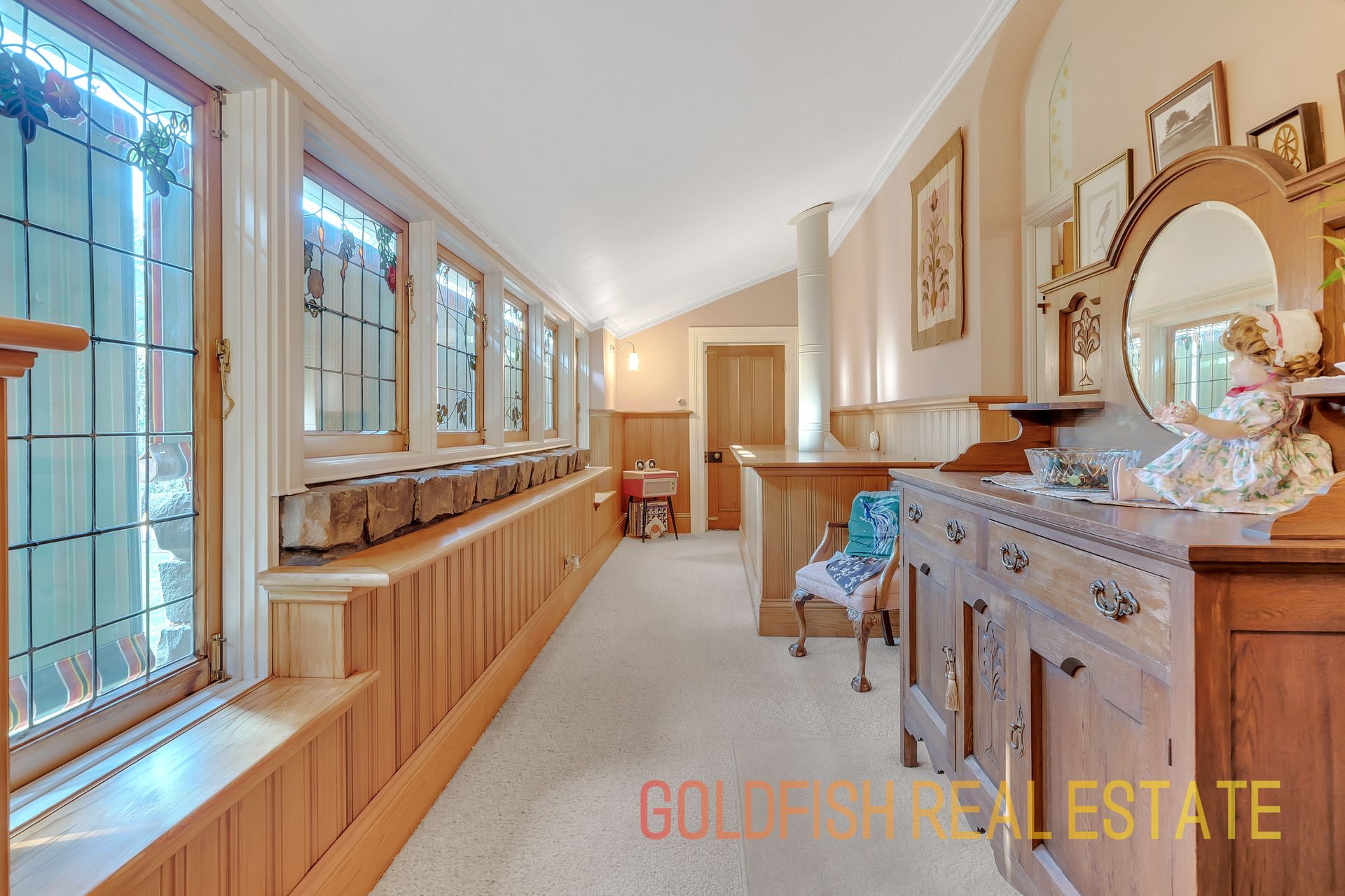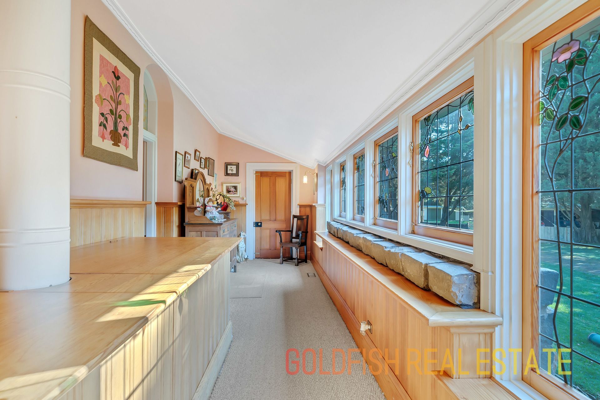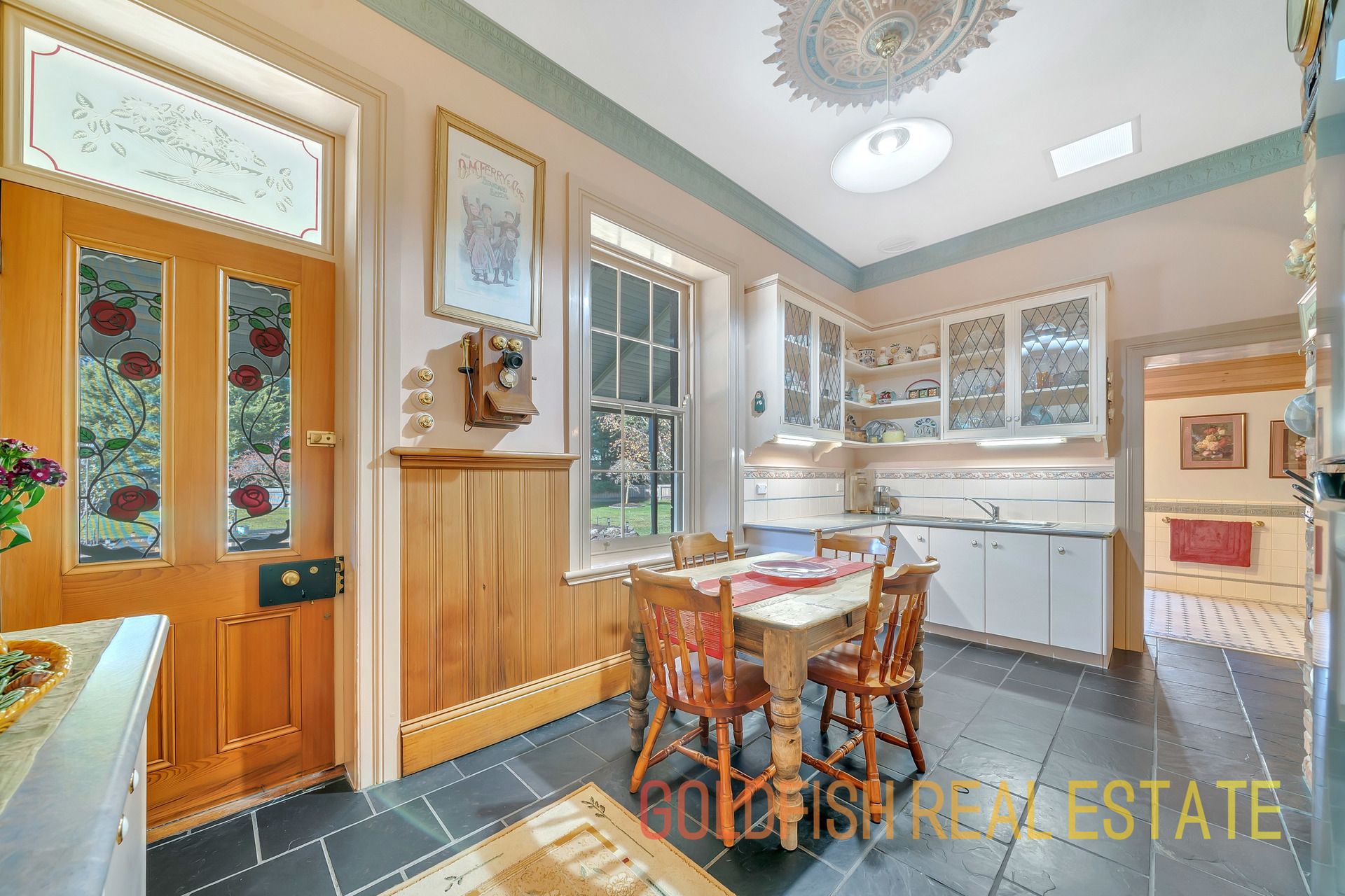 With so much to offer this radiant home has all the wonderful features to make you appreciate nights at home with your family including ceiling roses, an open fireplace, deep skirting boards, and wonderful handmade etched glass & stained window features.