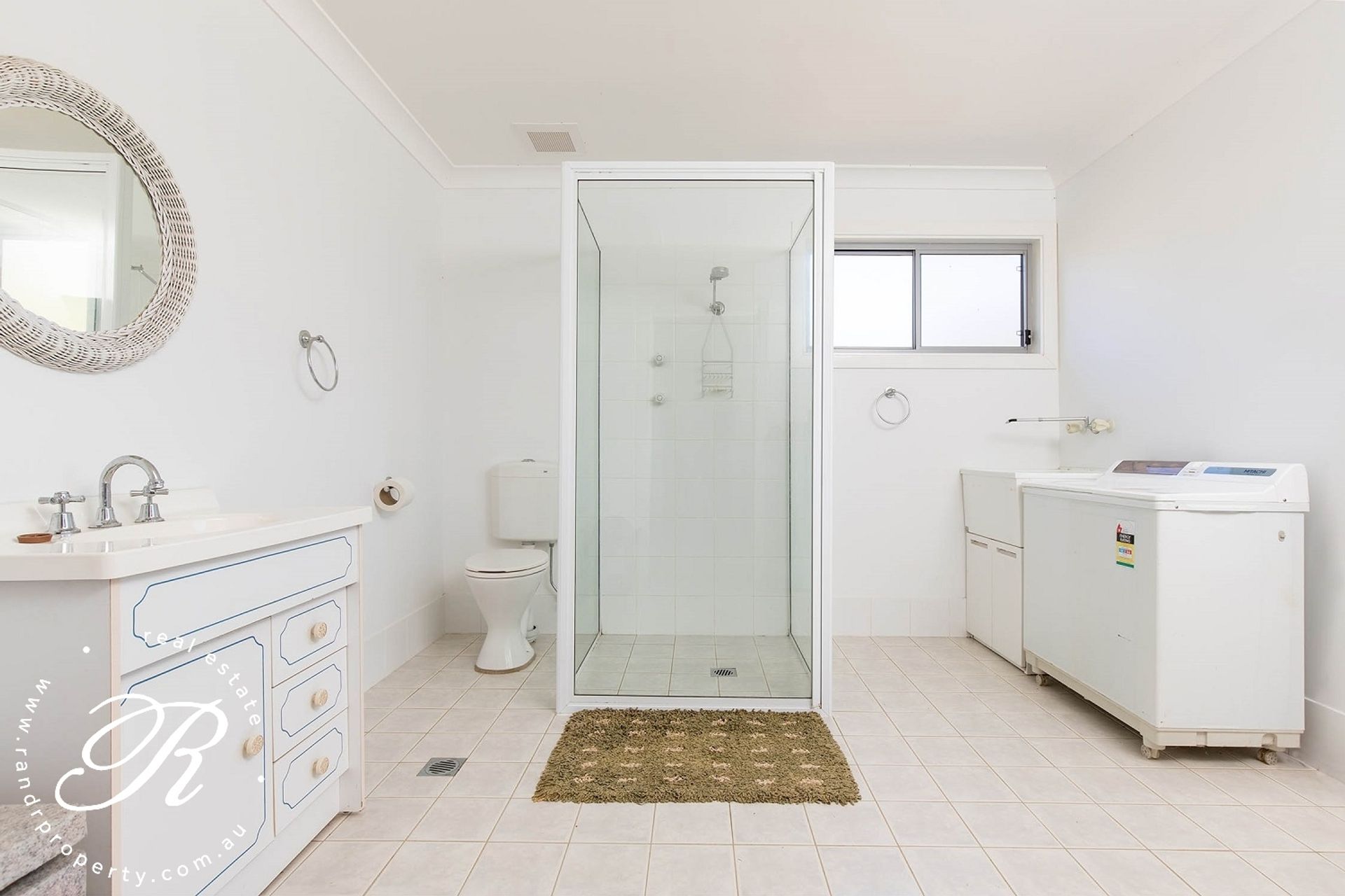 • Combined bathroom/laundry with vanity, shower, toilet, laundry tub