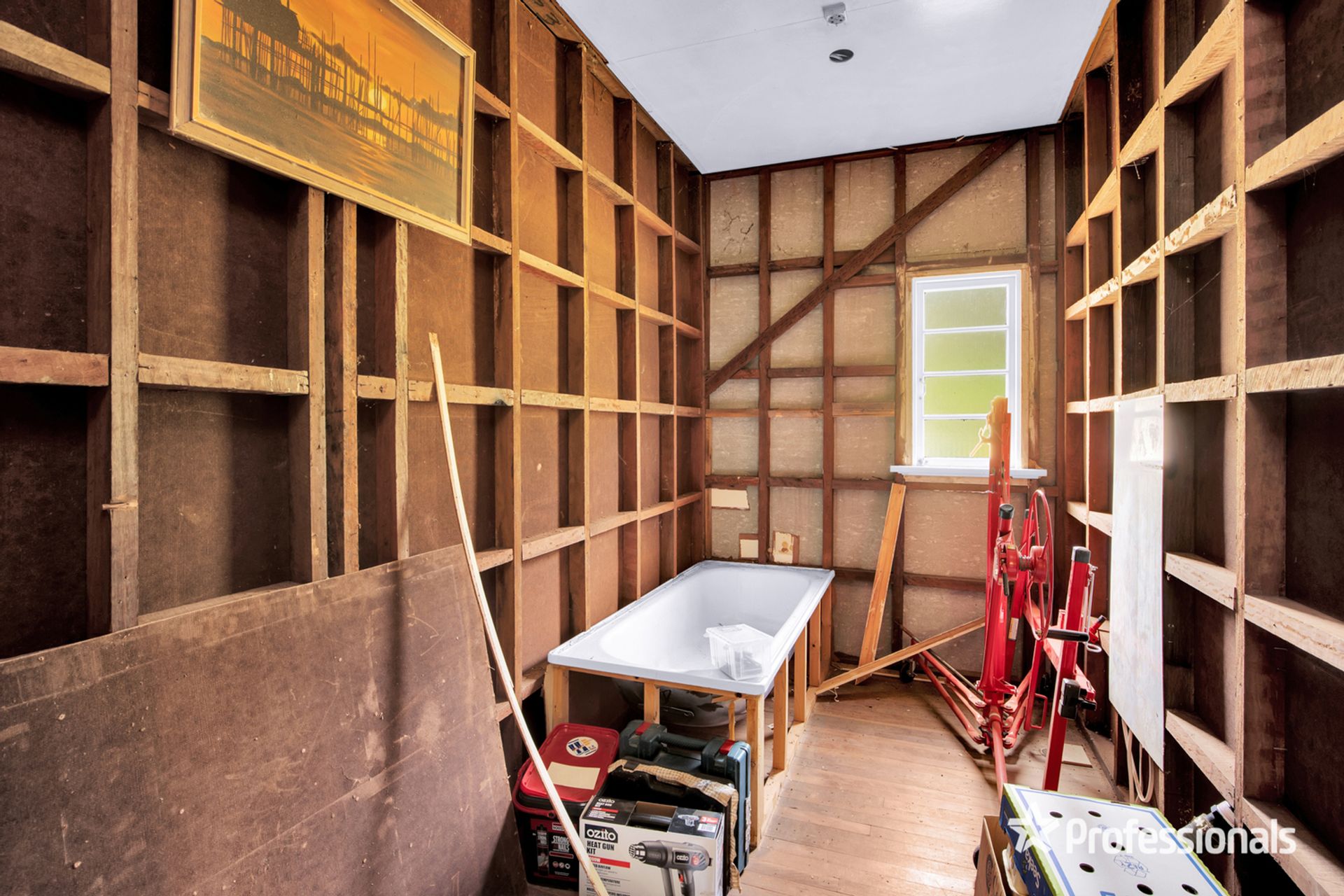 • Two bathrooms, one currently to frame work as pictured, second shower and toilet in use
