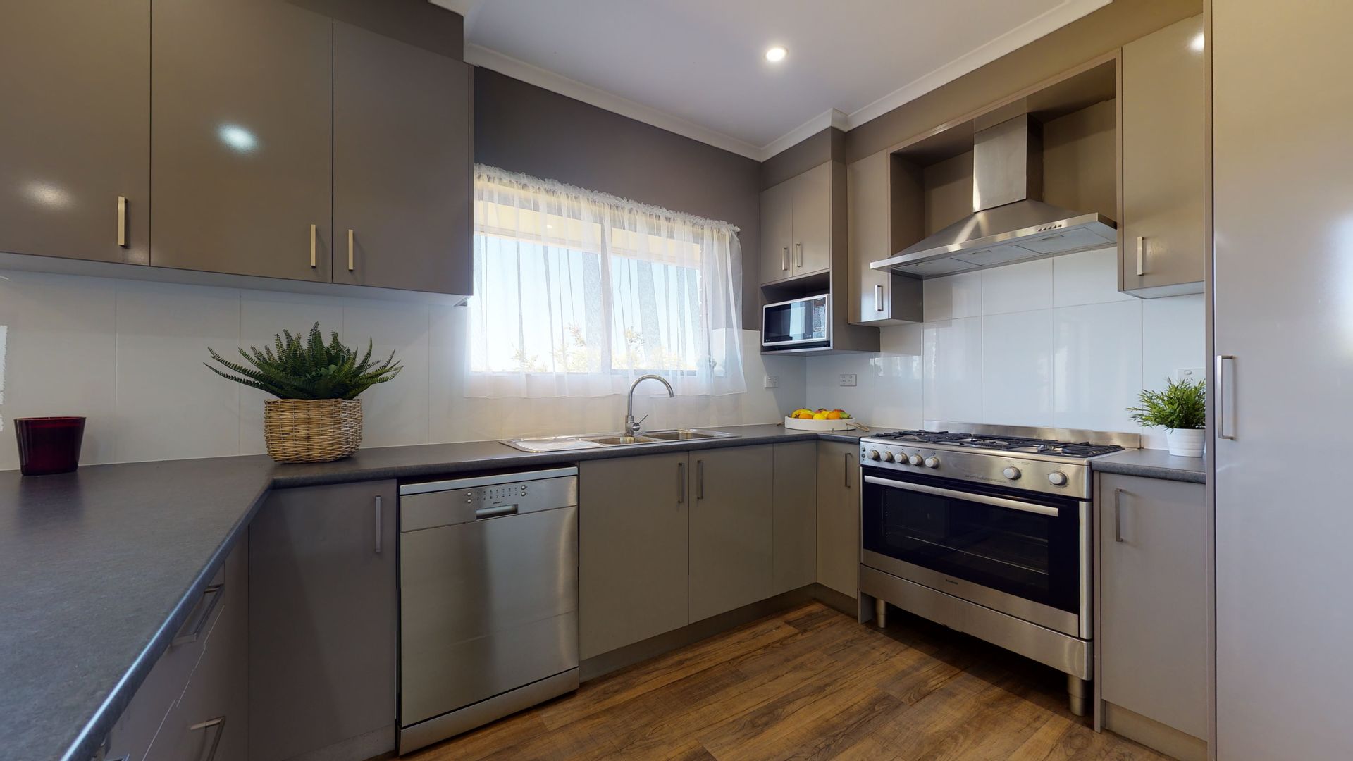 Here, sweeping benchtops and stainless steel appliances will make cooking a pleasure along with the breakfast bar seating, tiled backsplash and generous corner pantry.