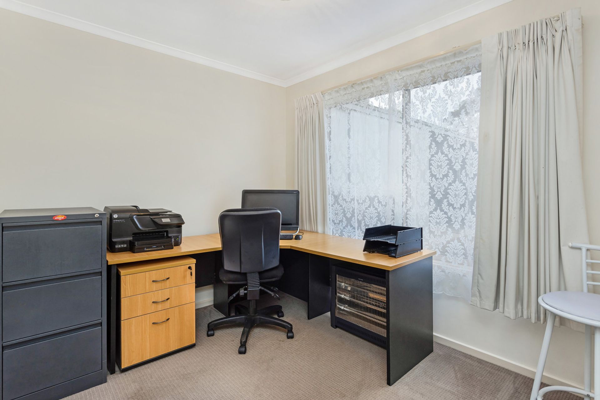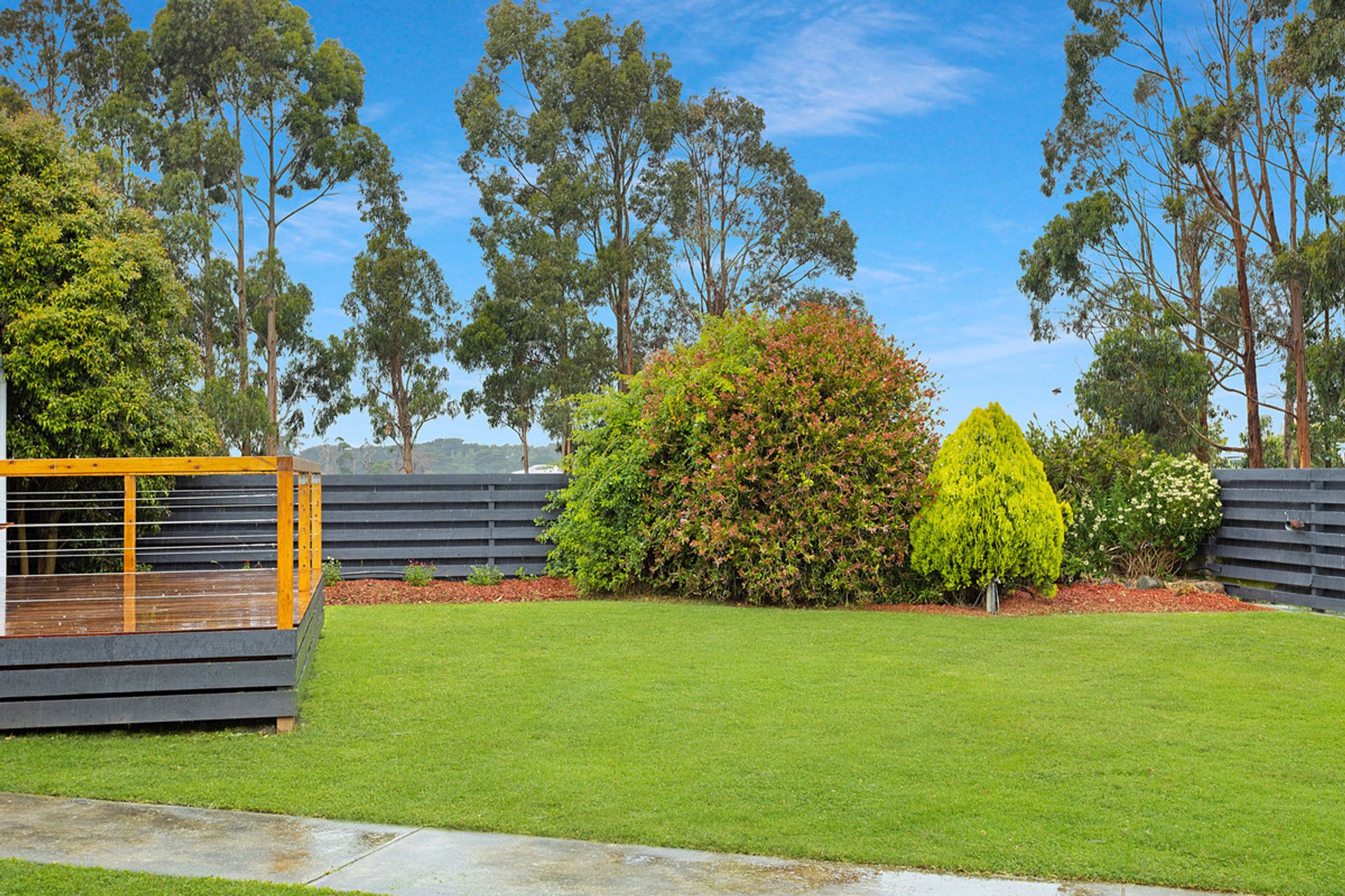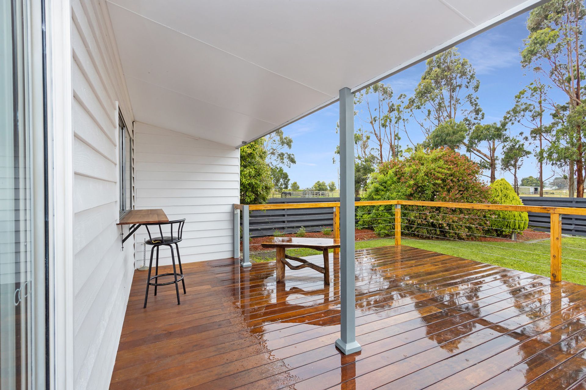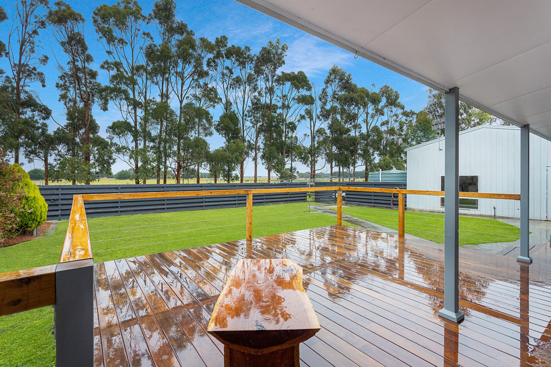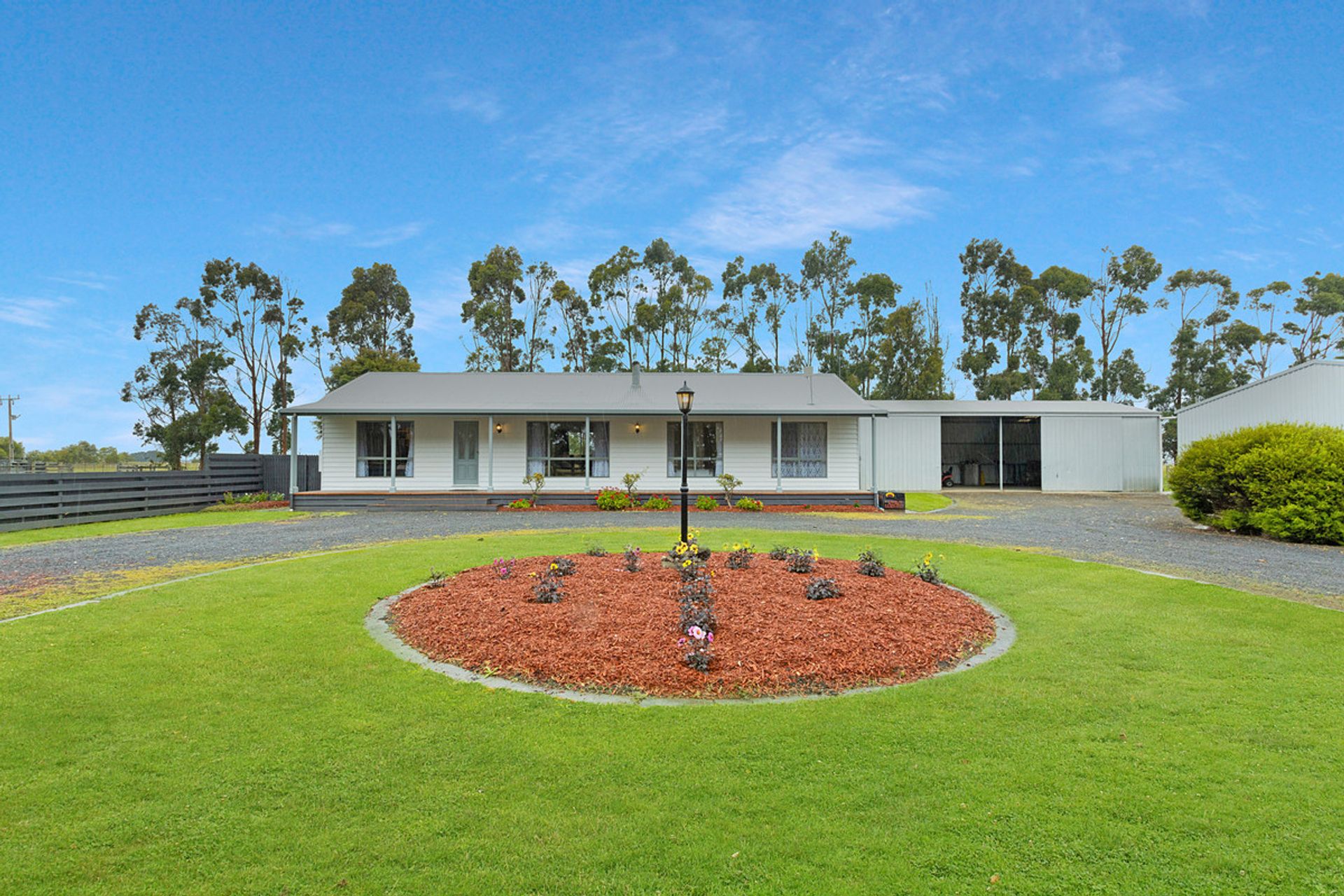 HOME: Immaculately presented 4brm freshly painted (externally and majority internally) weatherboard home set in a manicured easy care garden. North facing ranch style timber decked verandah opens through front door into light and bright lounge carpeted with slow combustion wood heater. Leads to open plan kitchen / meals area. New kitchen with white cabinetry, black splash backs and corner pantry and ample cupboards. New gas cook tops and Westinghouse electric stove, Dishlex dishwasher and dual sinks with double fridge cavity. Laminated benchtops and breakfast bar to seat 3. Kitchen / meals area with large R/C A/C opens onto external large Merbau timber deck. Strategically designed master bedroom – north facing with walk through robe to new large and impressive ensuite which features ceiling to floor tiles. 3 bedrooms – 2 of which are used as a study. All have BIRs. Easy access to family bathroom with separate bath and shower, and separate toilet. Ample sized laundry with access to rear garden. Large child proof / pet proof rear garden. Adjacent home is all steel fully lockable shed (16x8m) with power and concrete floor, with lined rumpus room and sliding doors at one end.