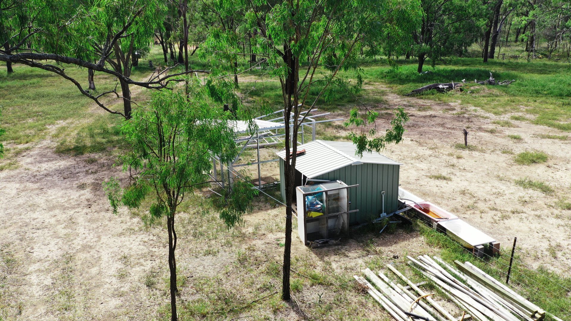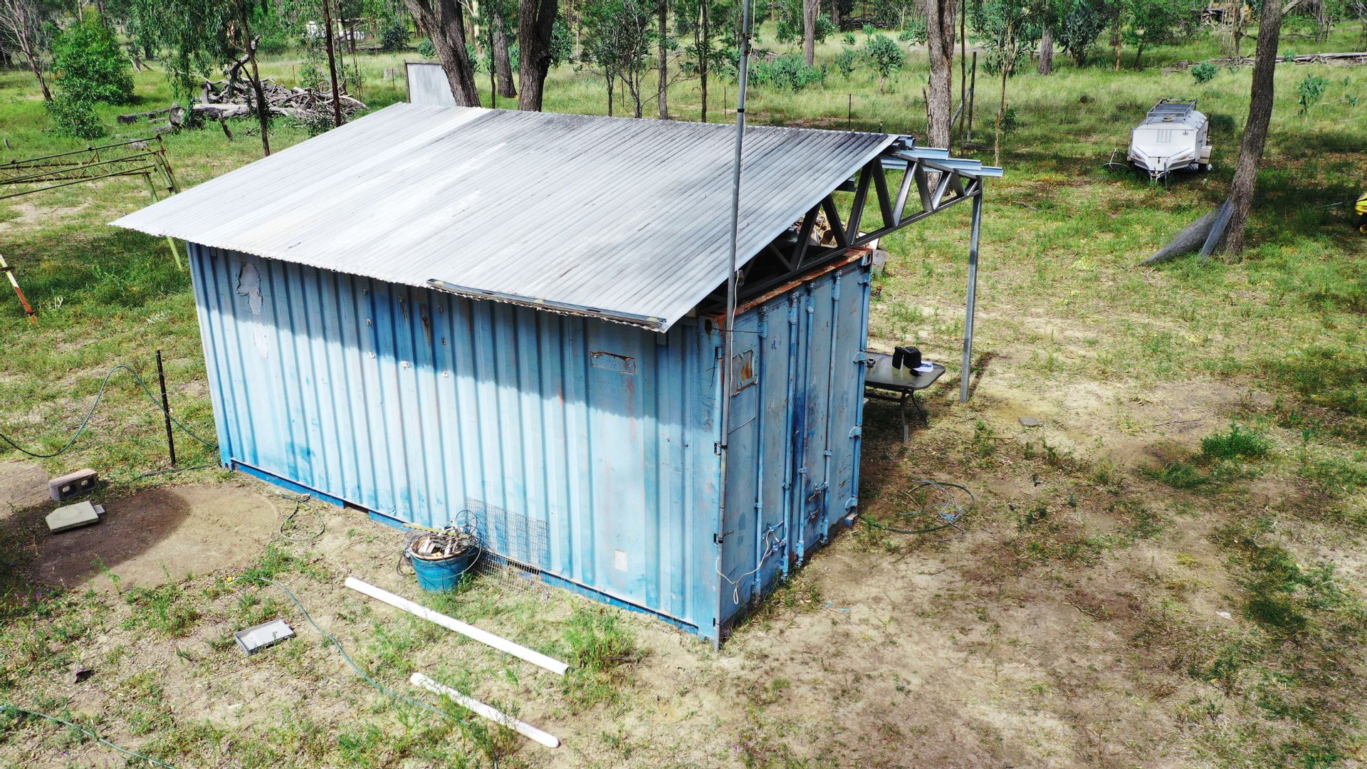 There is a fully lockable 20 foot shipping container with a framed roof partially finished as well as a garden shed, loads of building materials lying around such as concrete blocks and frames. The current owner has left loads of junk lying around that could be useful to the new owners.