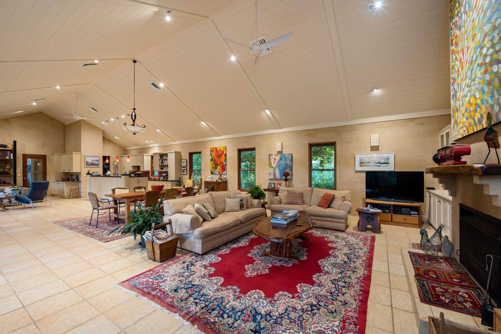 -Generous living areas incorporating large kitchen, dining and lounge with raked ceilings and fireplace