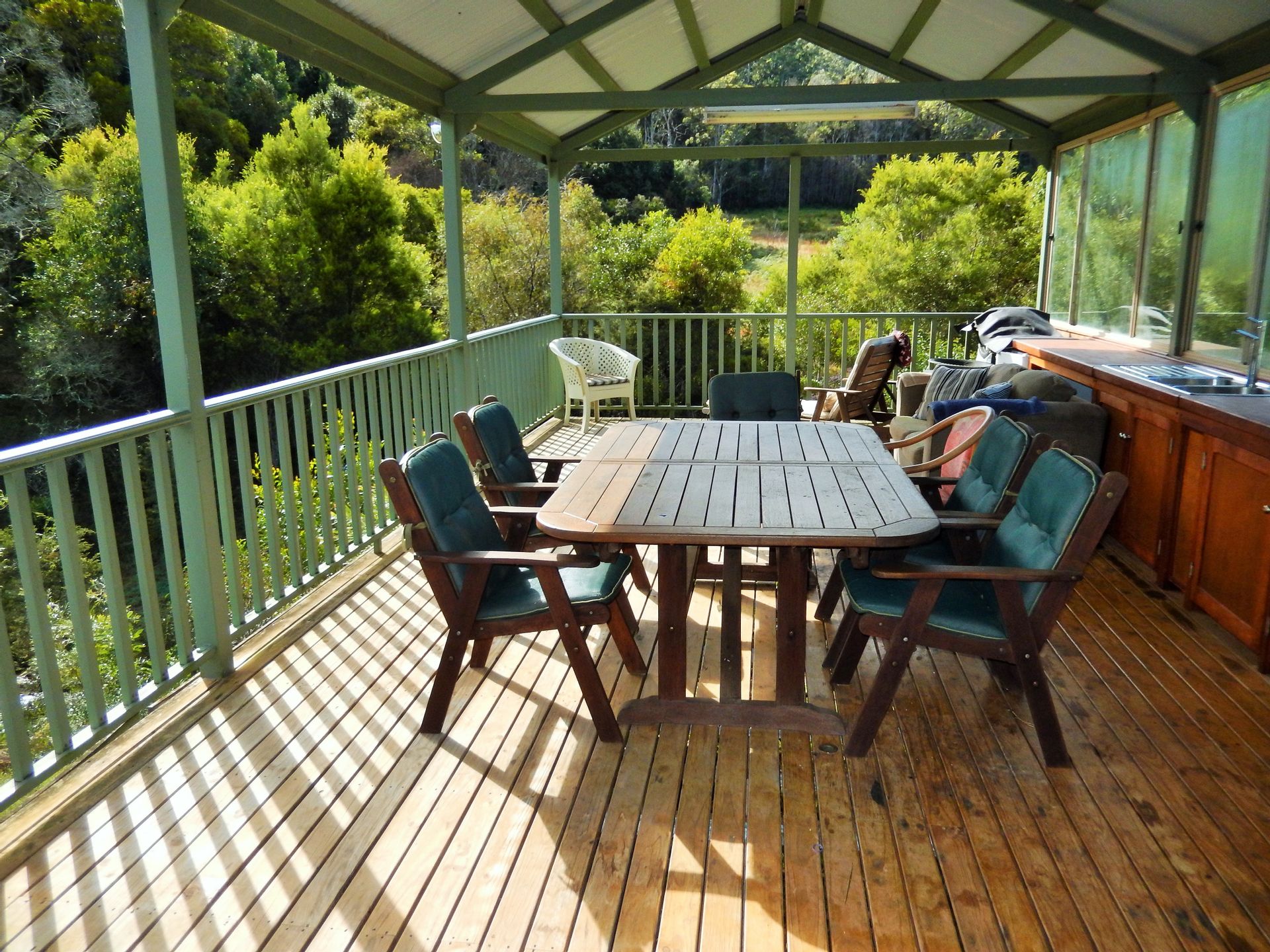4 bedrooms and 2 offices, 3 kitchens, 3 bathrooms, 3 air conditioned living areas & 3 verandas, including a large inviting deck directly overlooking the rapids, a small waterfall and the rainforest and containing a handy 5m* outdoor kitchen.
