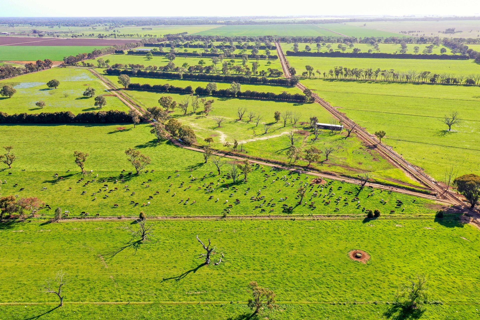 The water entitlement includes 1700 megalitres deep lead bore license plus 62 megalitres of high reliable water share (Goulburn) system, 4.28 delivery shares with 1 main service point only, supplying the modernised pipe and riser system throughout the majority of the farm (250 Hectares) with the balance of land currently dry land cropping with a farm plan able to command this area as well.