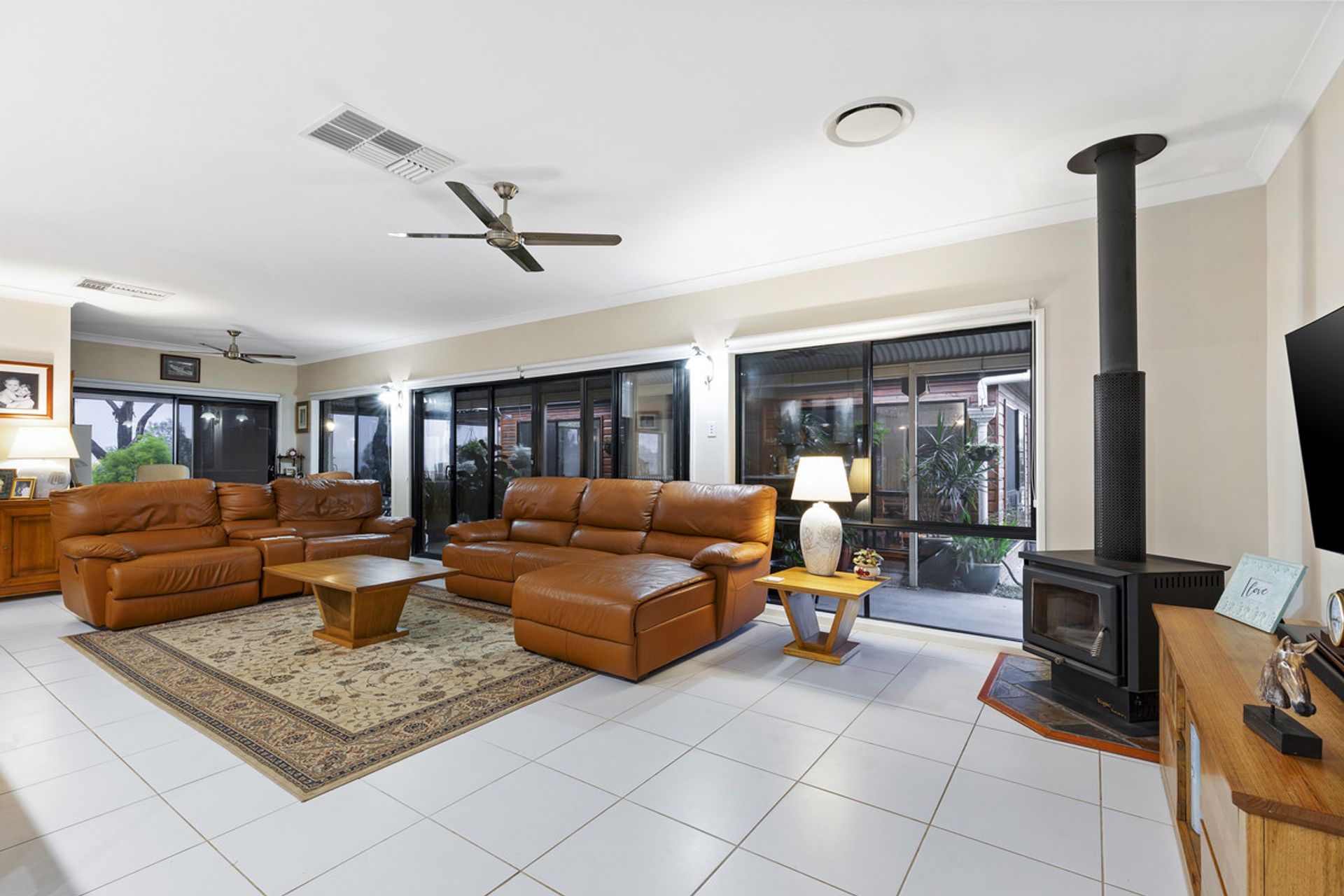 * Fireplace with heat dispersion, ducted evaporative cooler, fans throughout