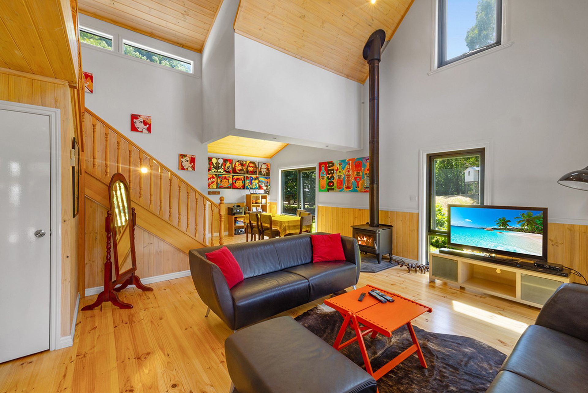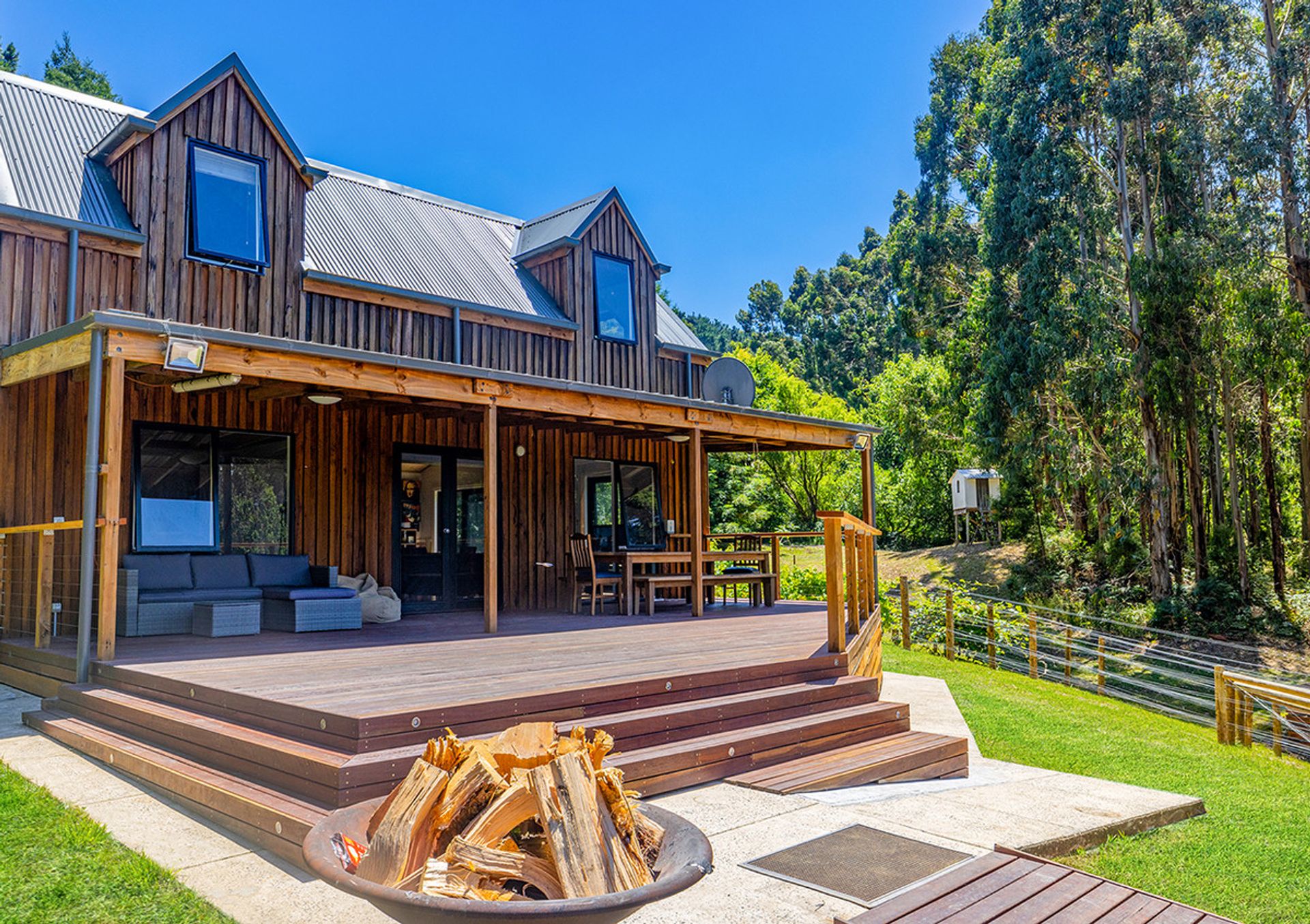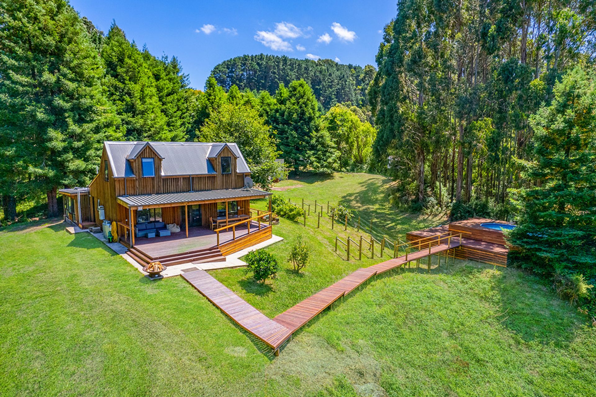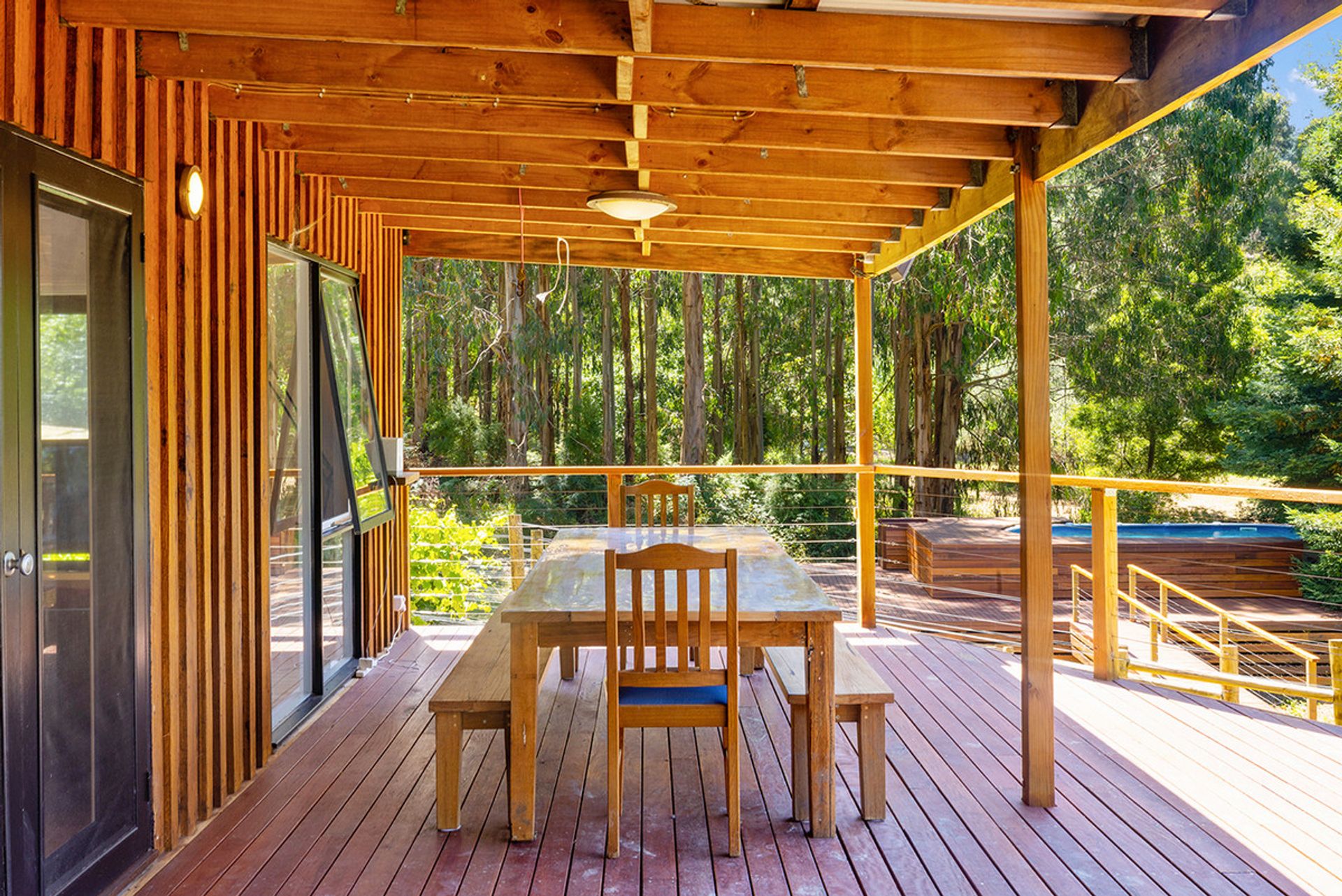 Accommodation includes: 2 generous bedrooms off the main living area 1 down stairs 1 upstairs with the master bedroom separated from the main house with luxurious fixtures featuring polished concreate flooring, open plan layout with a free standing bath looking out into the woodland backdrop. Further features include centrally located family bathroom, Solid wood heater, and high ceilings. Outside you will be amazed by the expansive merbau decking that meanders down past a magnificent spring fed dam to the above ground solar heated swimming pool that is nestled into the surrounding bush land.