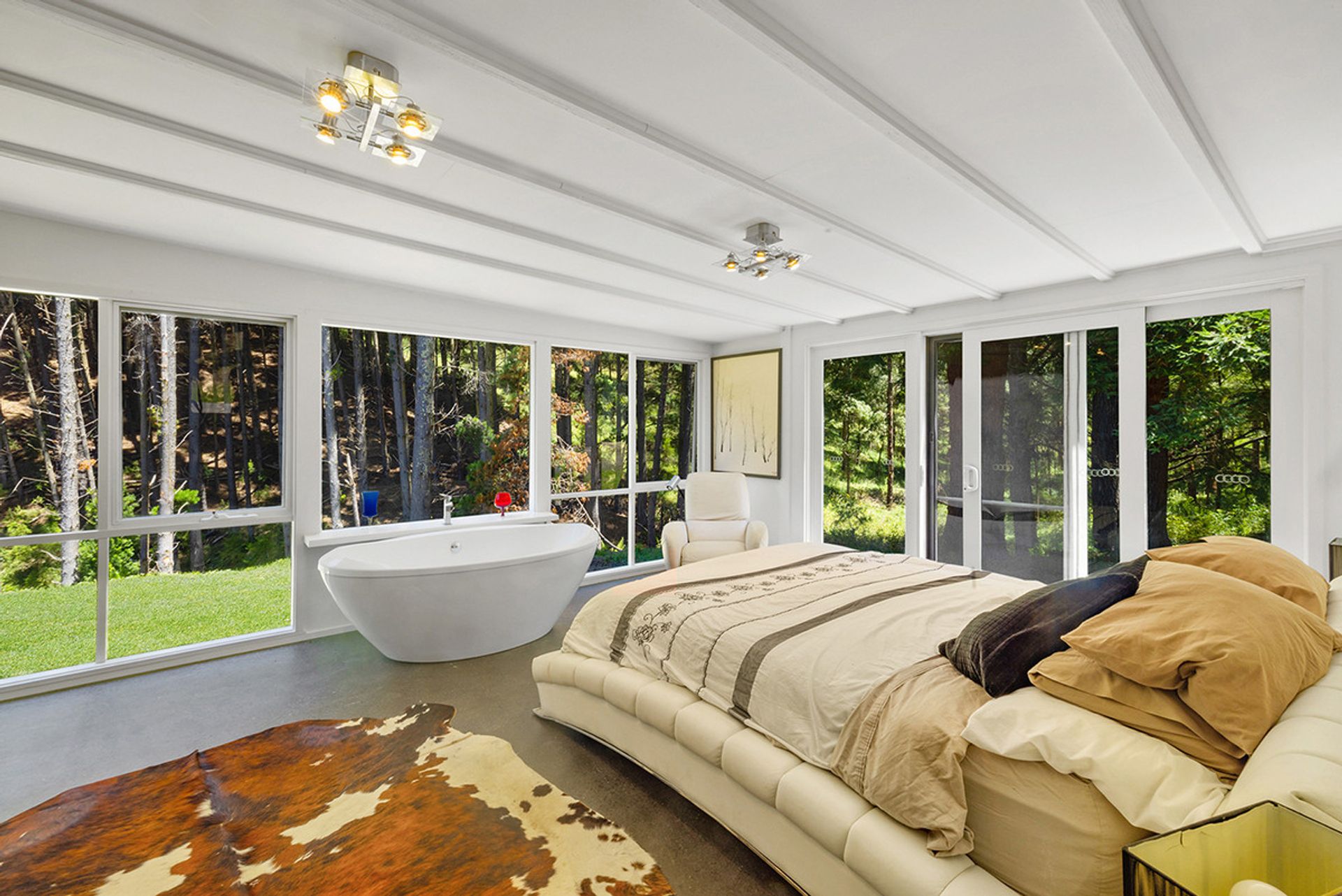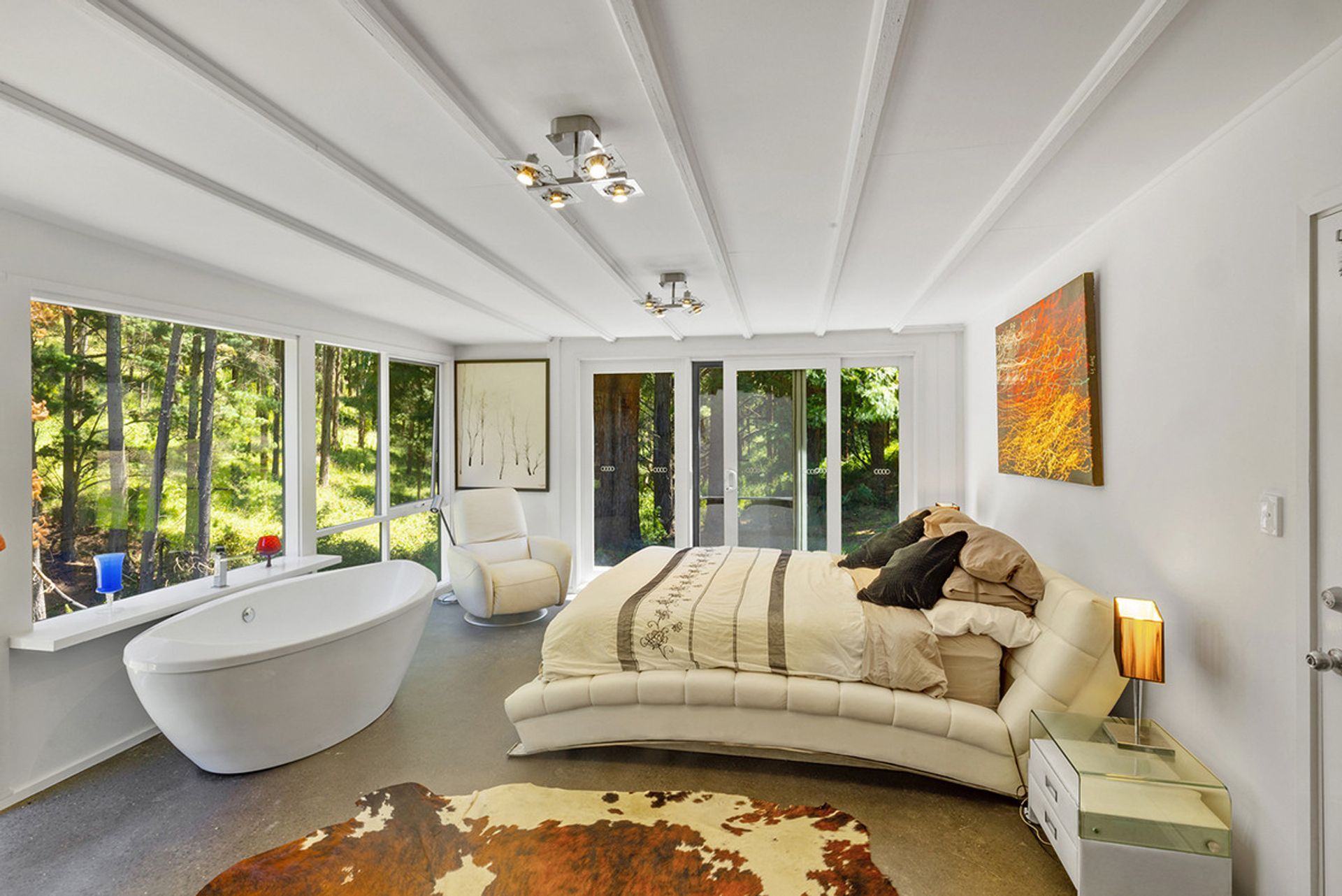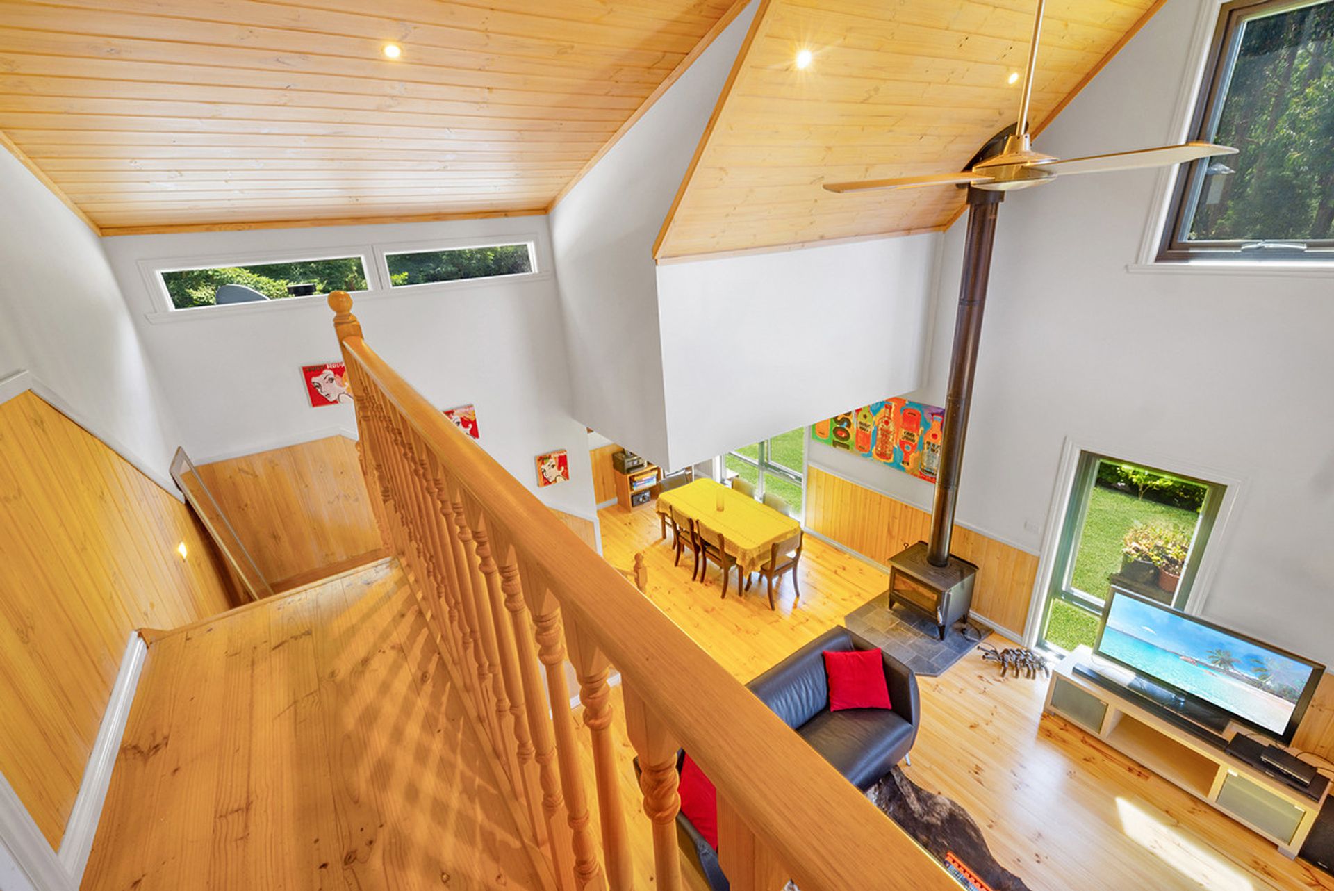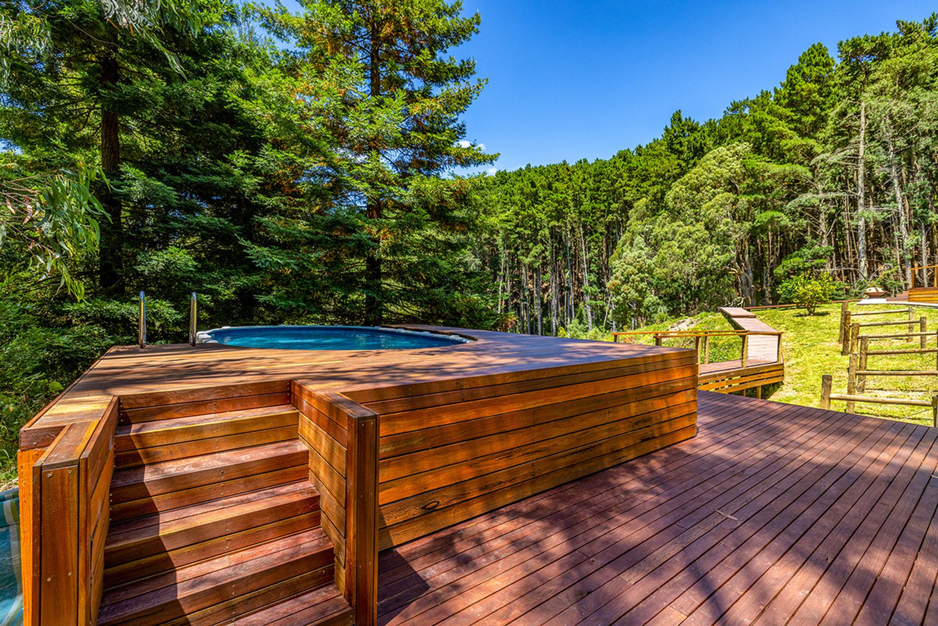 Accommodation includes: 2 generous bedrooms off the main living area 1 down stairs 1 upstairs with the master bedroom separated from the main house with luxurious fixtures featuring polished concreate flooring, open plan layout with a free standing bath looking out into the woodland backdrop. Further features include centrally located family bathroom, Solid wood heater, and high ceilings. Outside you will be amazed by the expansive merbau decking that meanders down past a magnificent spring fed dam to the above ground solar heated swimming pool that is nestled into the surrounding bush land.