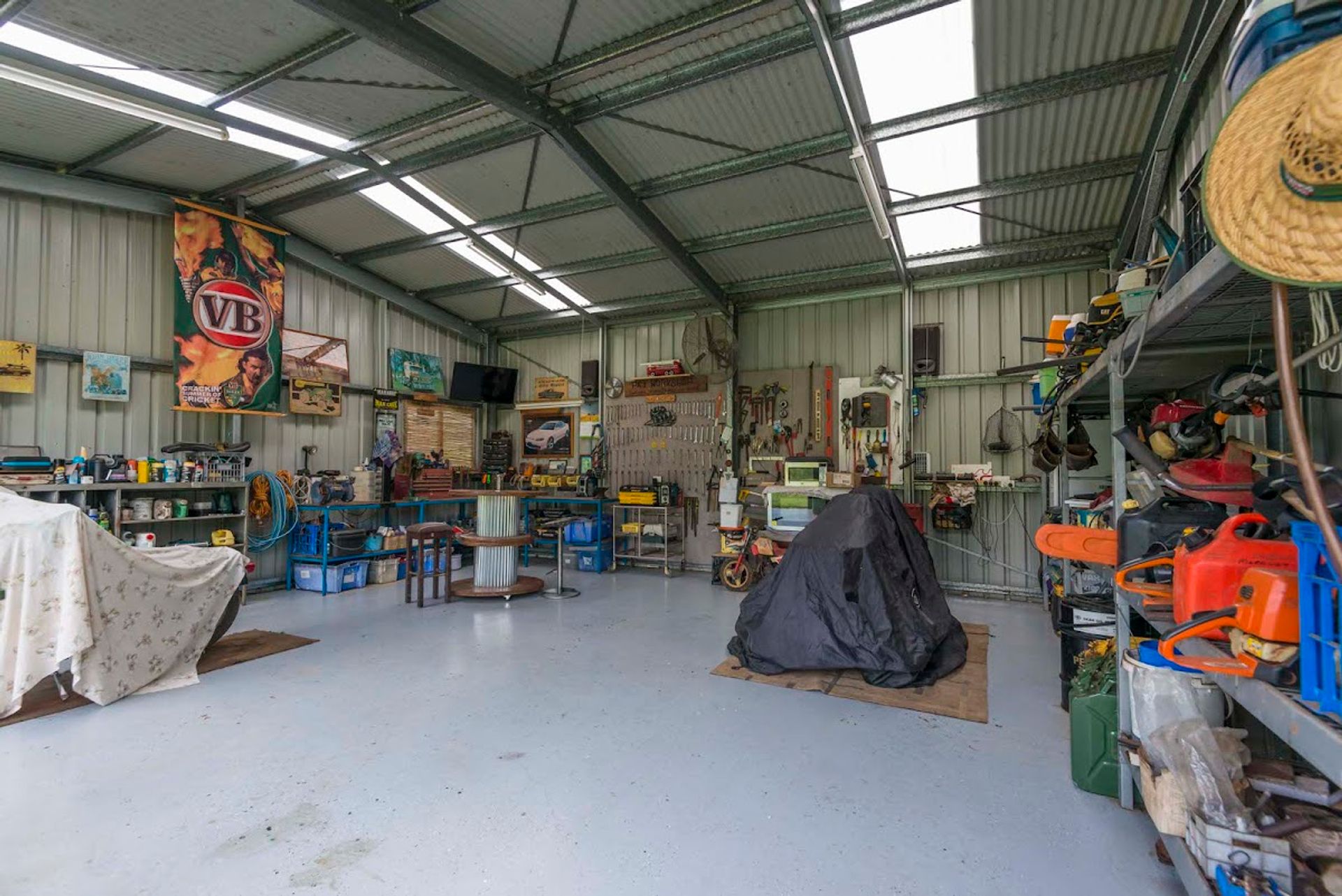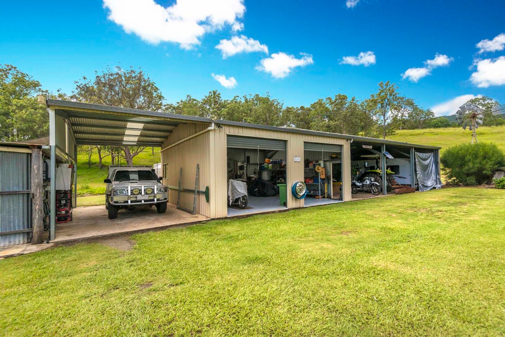 The infrastructure is in tip-top condition. There is a little cabin which is currently used as office space and has a bed + bathroom facilities. The shed has a 5kw solar system installed, which feeds the house during the day. There are 2 open bays, 2 lockable bays, and 1 single wash bay.