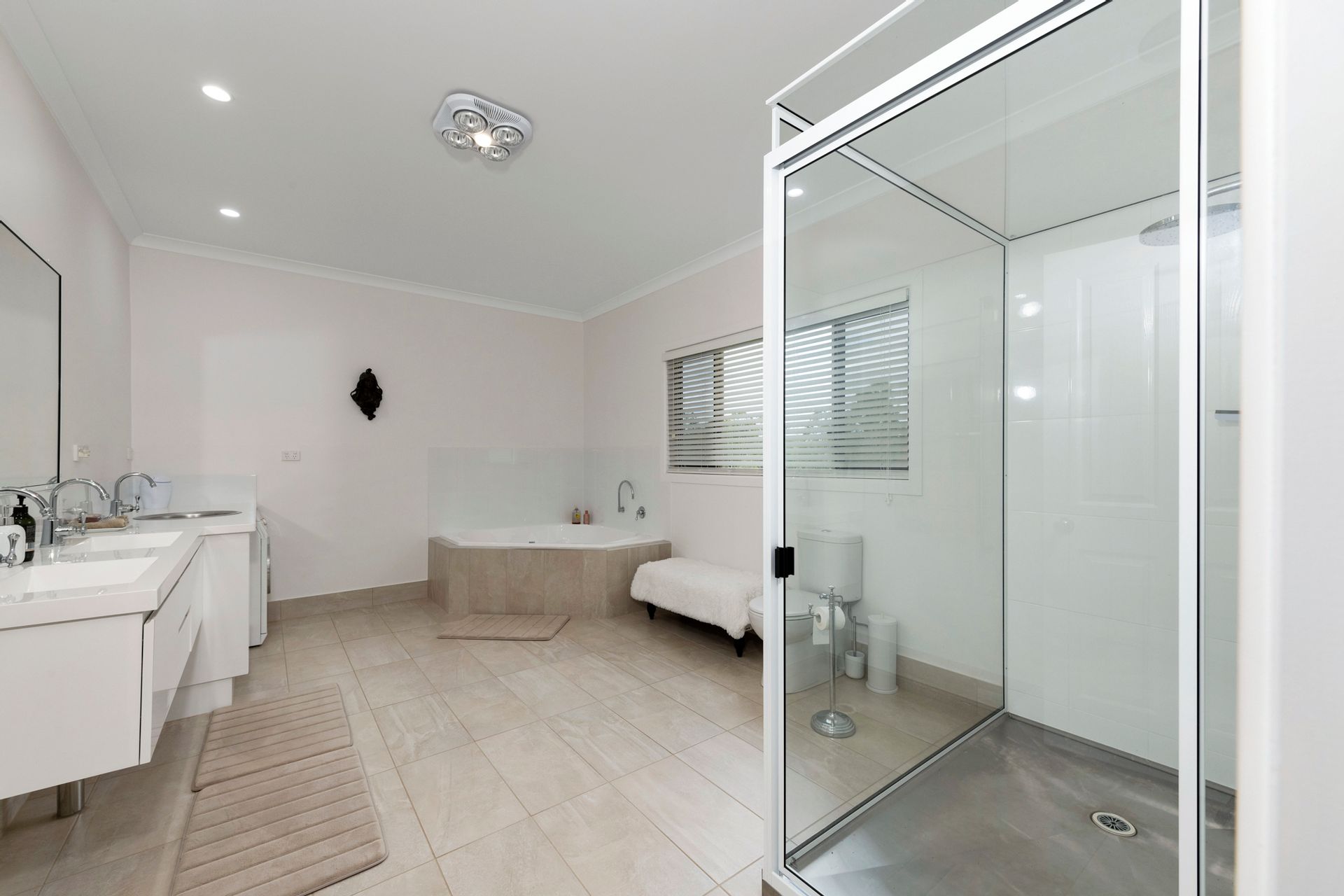 A super spacious, beautiful bathroom is downstairs, a glass of wine relaxing in the spa bath is definitely on the menu.