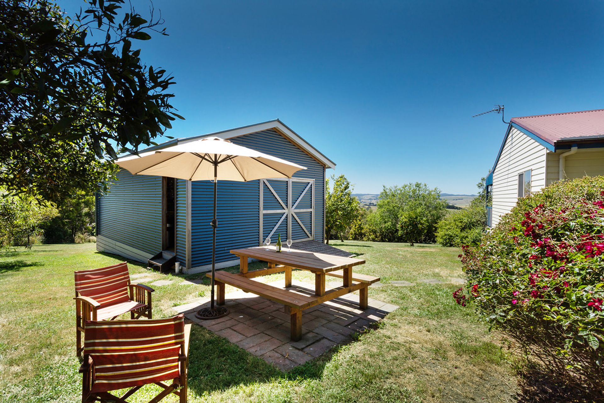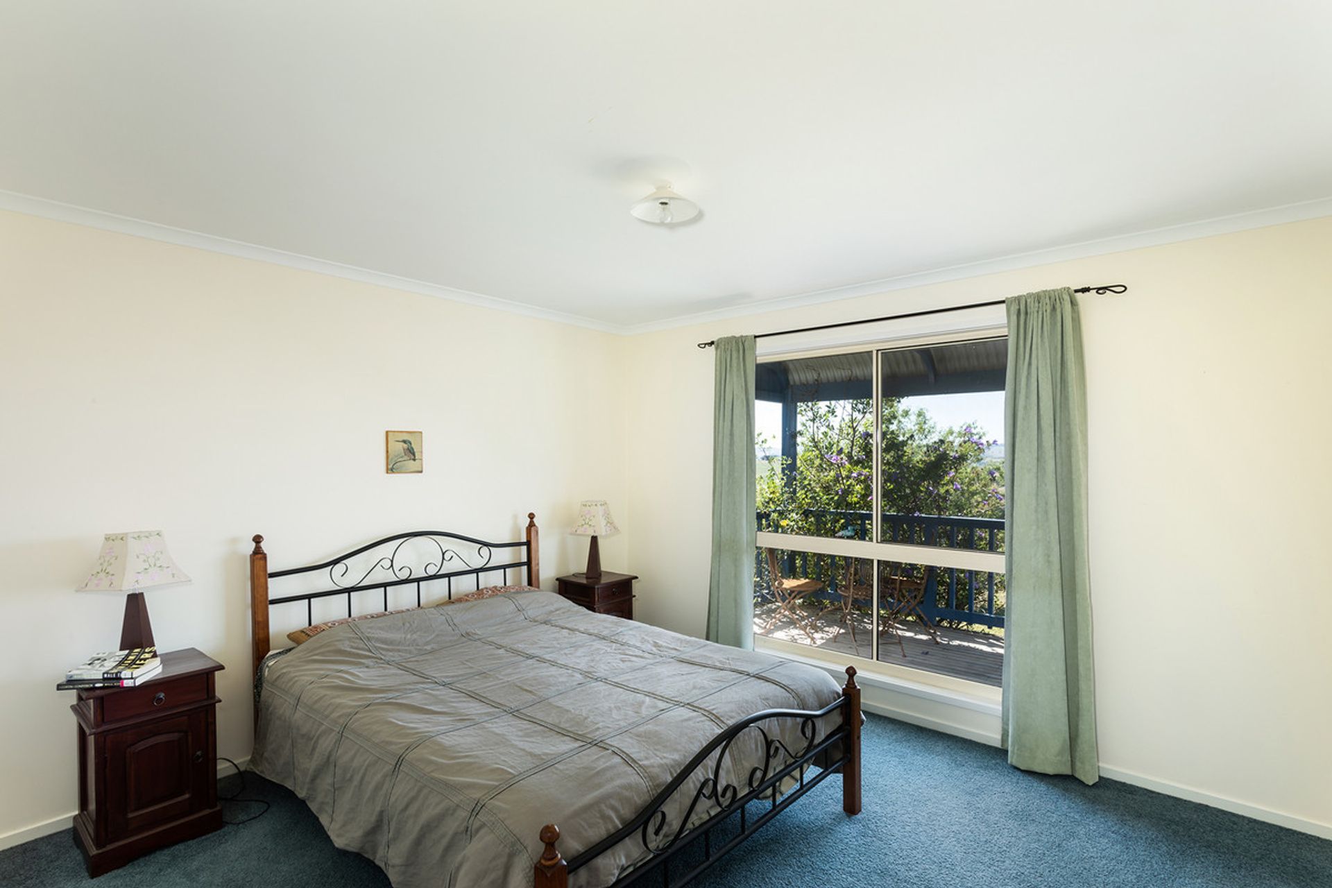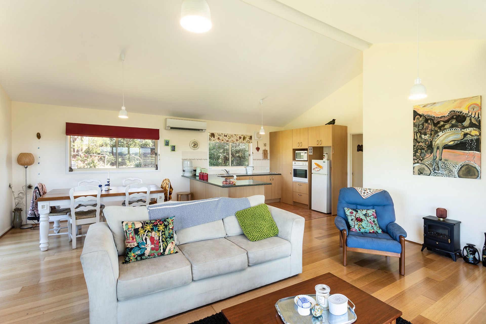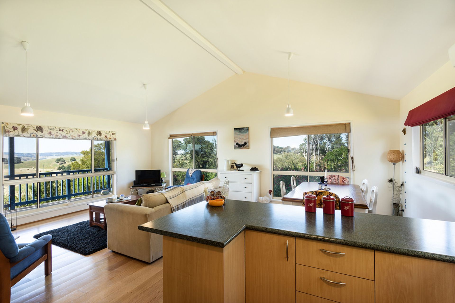 Open plan in design, the spacious kitchen, dining and living area displays beautiful, raked ceilings, hardwood floors and large tinted aluminium windows that capture the exquisite rural vistas whilst flooding the room with natural light. The heart of the home, this relaxing space is the perfect spot to snuggle up by the cosy wood fire and watch the storms roll in on a winter's day.