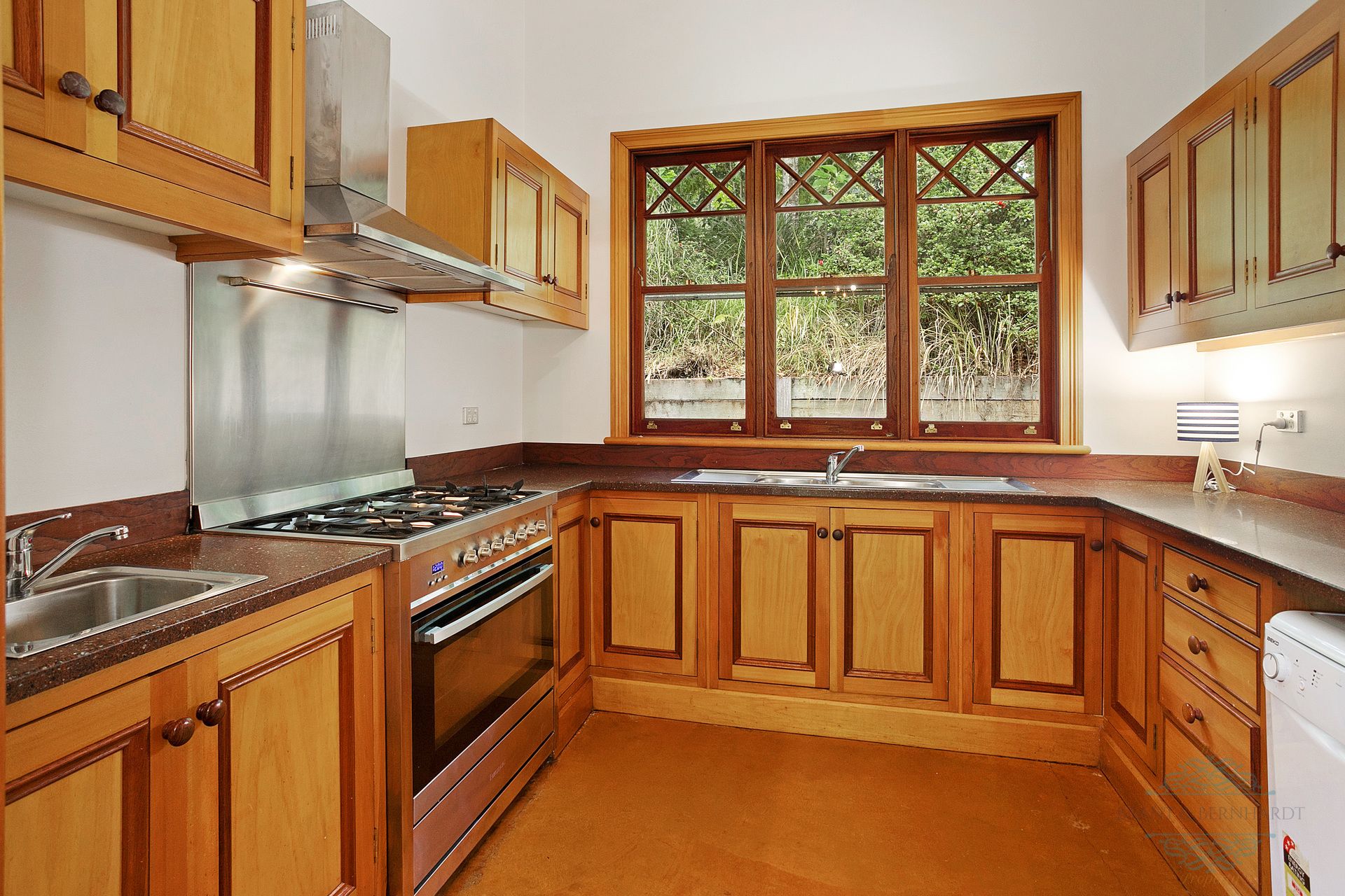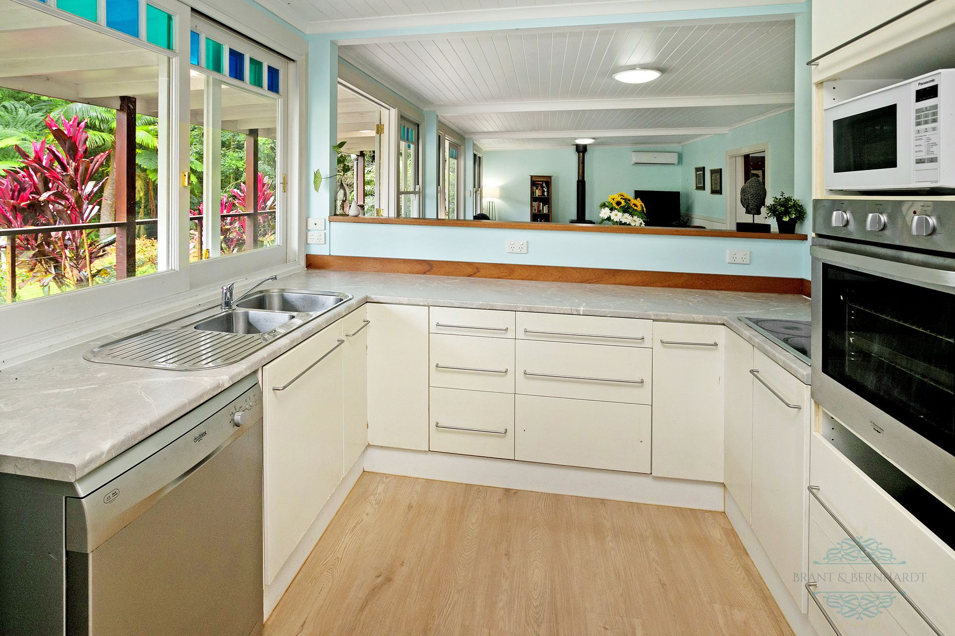 - Kitchen with large walk-in pantry, wall oven, electric cooktop, Dishlex dishwasher, new bench tops, convenient servery to living/dining area plus peaceful views over the lake through coloured glass feature windows
