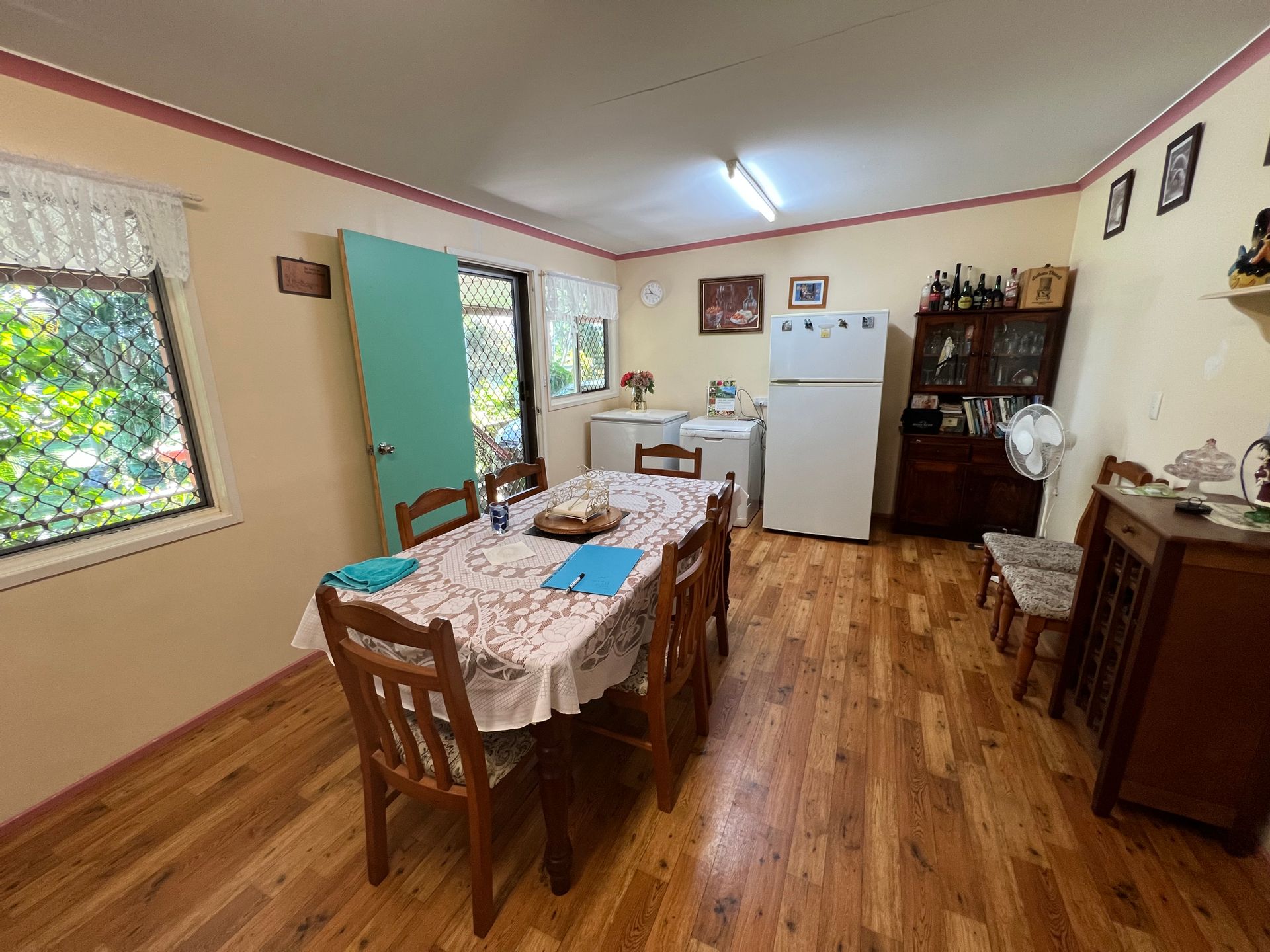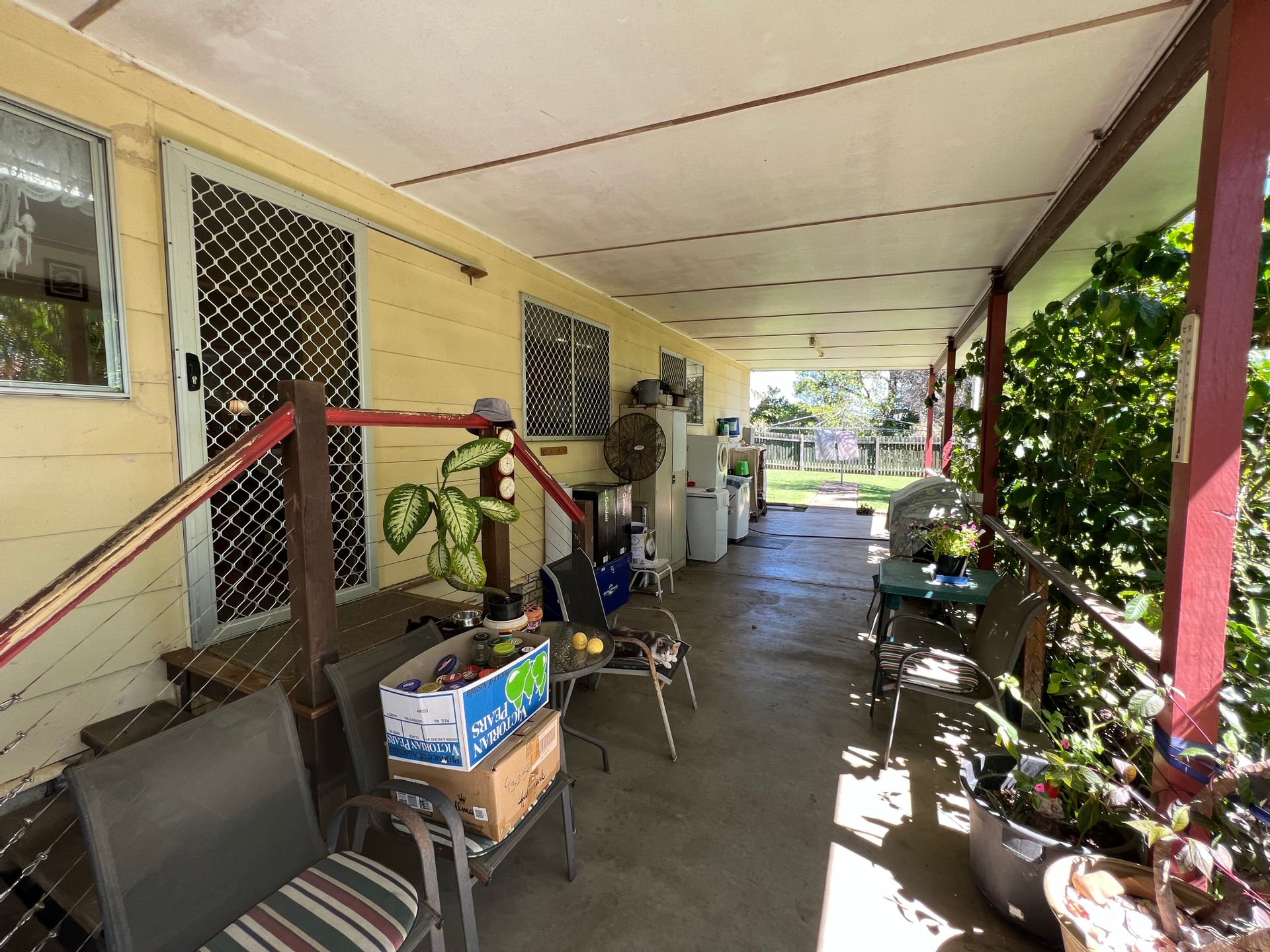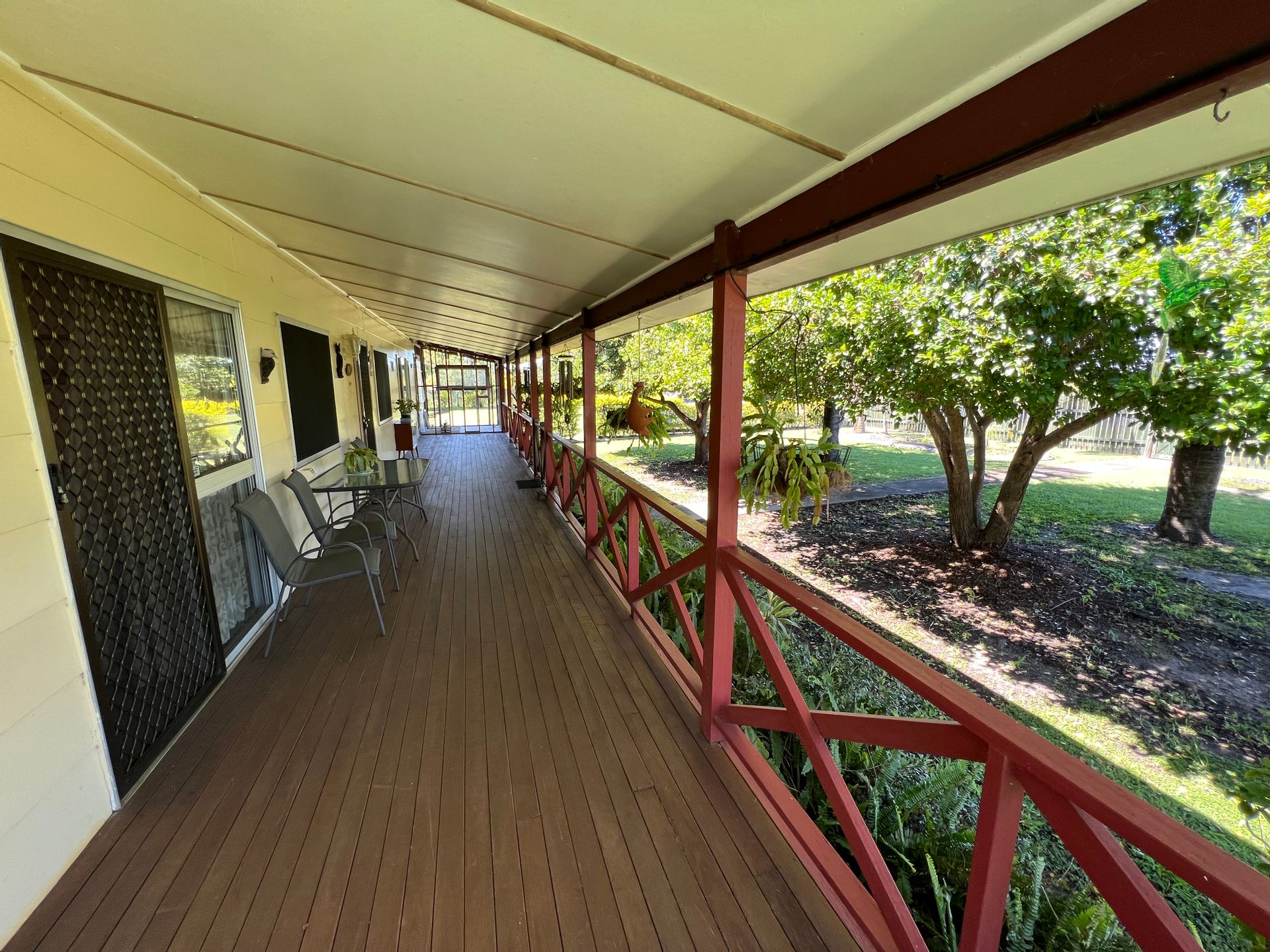 From the dining room you can access the back veranda, which is also huge, this is where the current owners park the car. At the opposite end are laundry facilities. The veranda is shaded by established trees and shrubs.