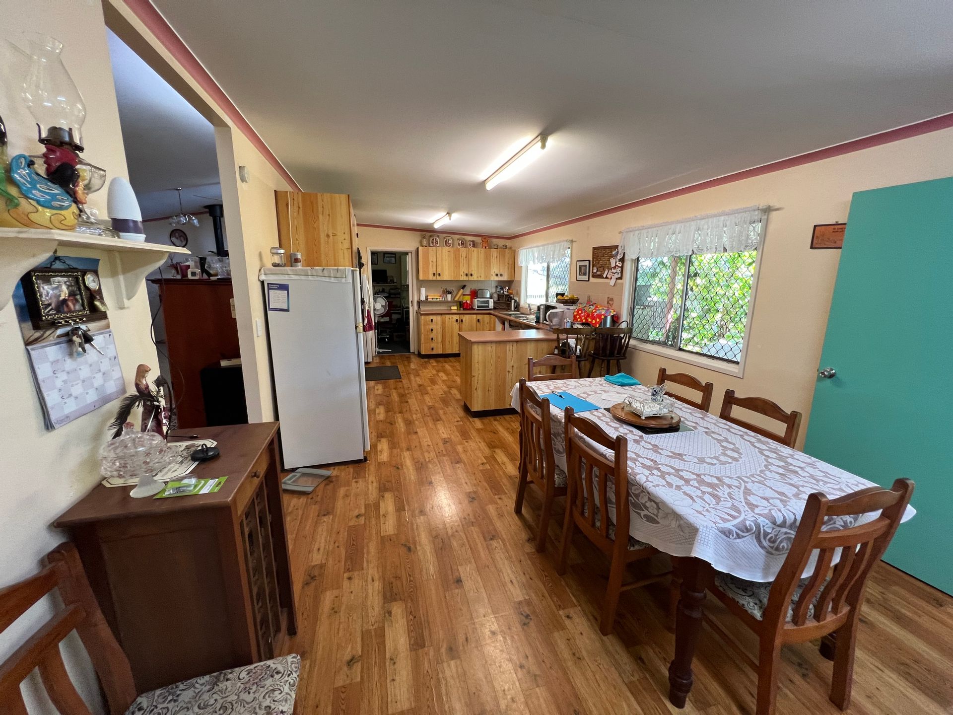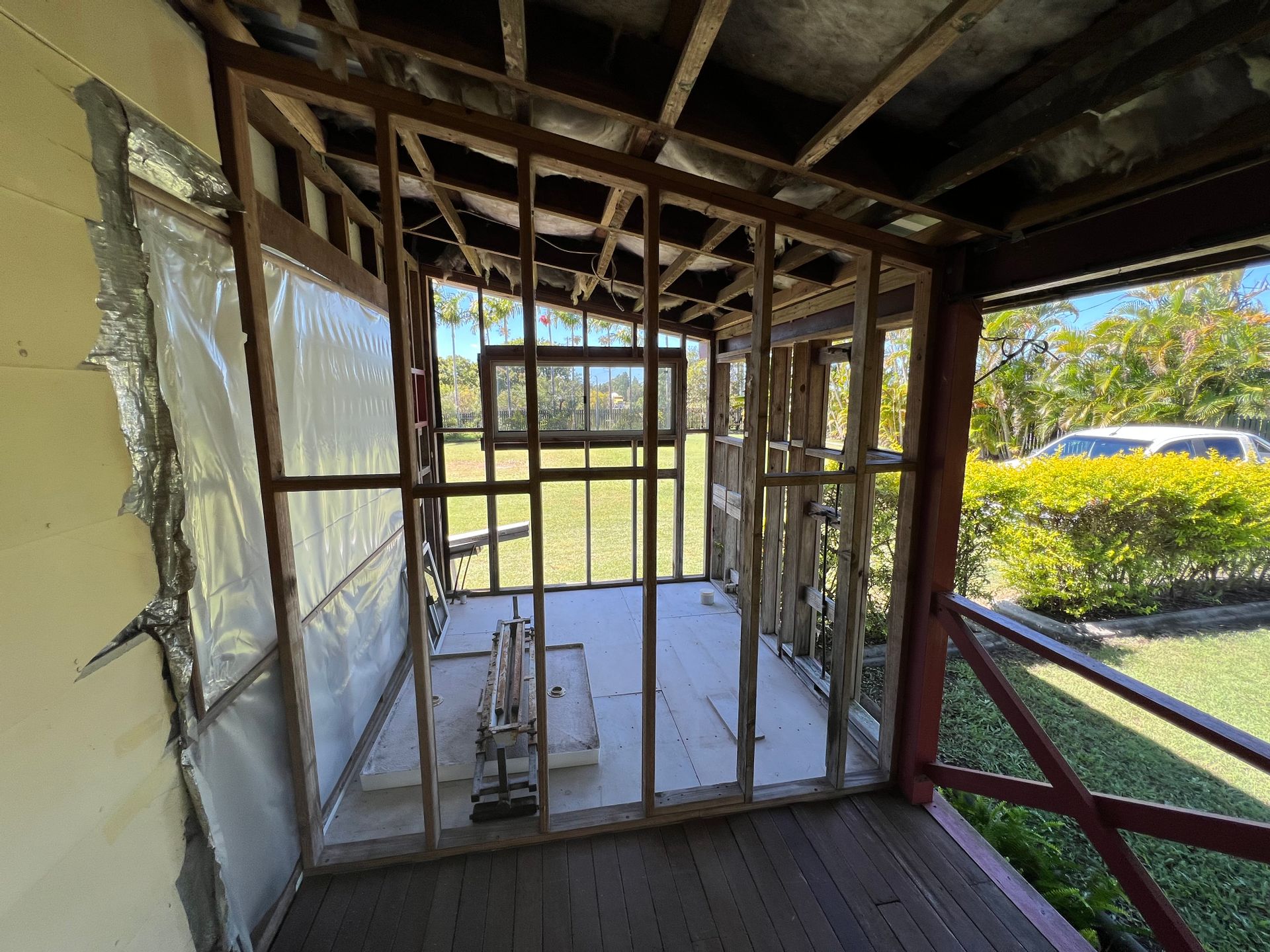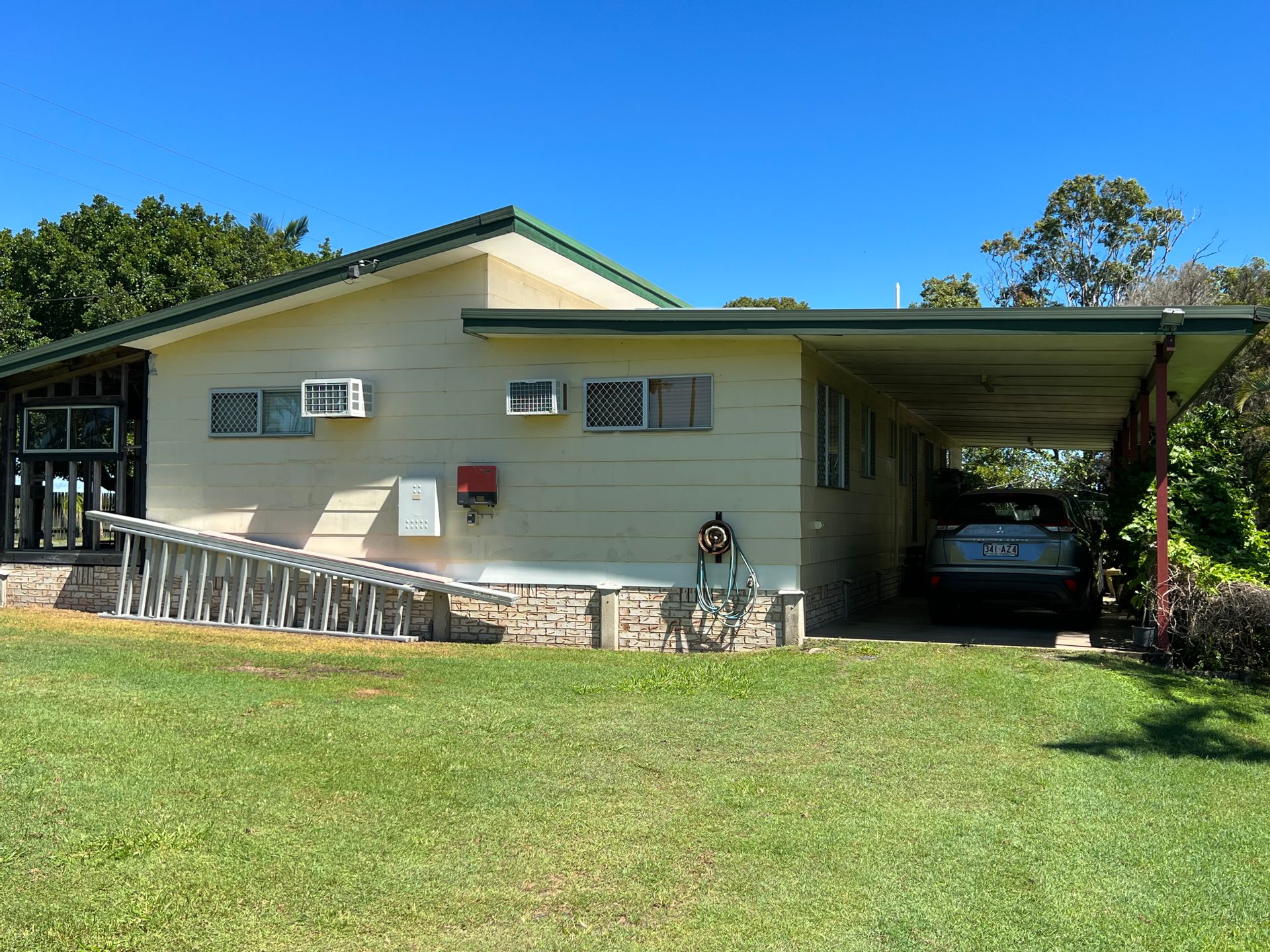 From the dining room you can access the back veranda, which is also huge, this is where the current owners park the car. At the opposite end are laundry facilities. The veranda is shaded by established trees and shrubs.
