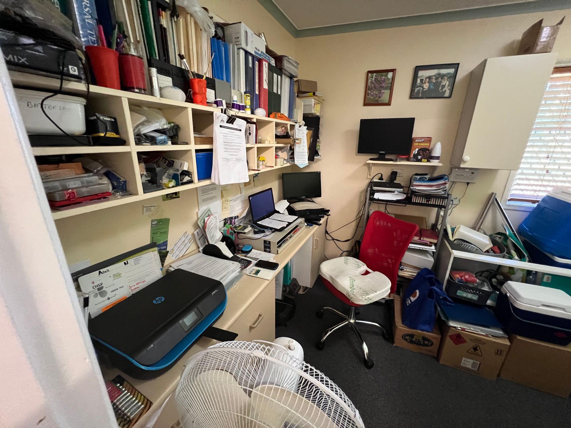 At the rear of the home is a huge open plan kitchen dining room which is big enough to accommodate a large family gathering. The kitchen has electric cooktop and wall oven, plenty of cupboards, and space for two fridges. Off the kitchen is an extra-large study with built in benches and pigeonholes for storage.
