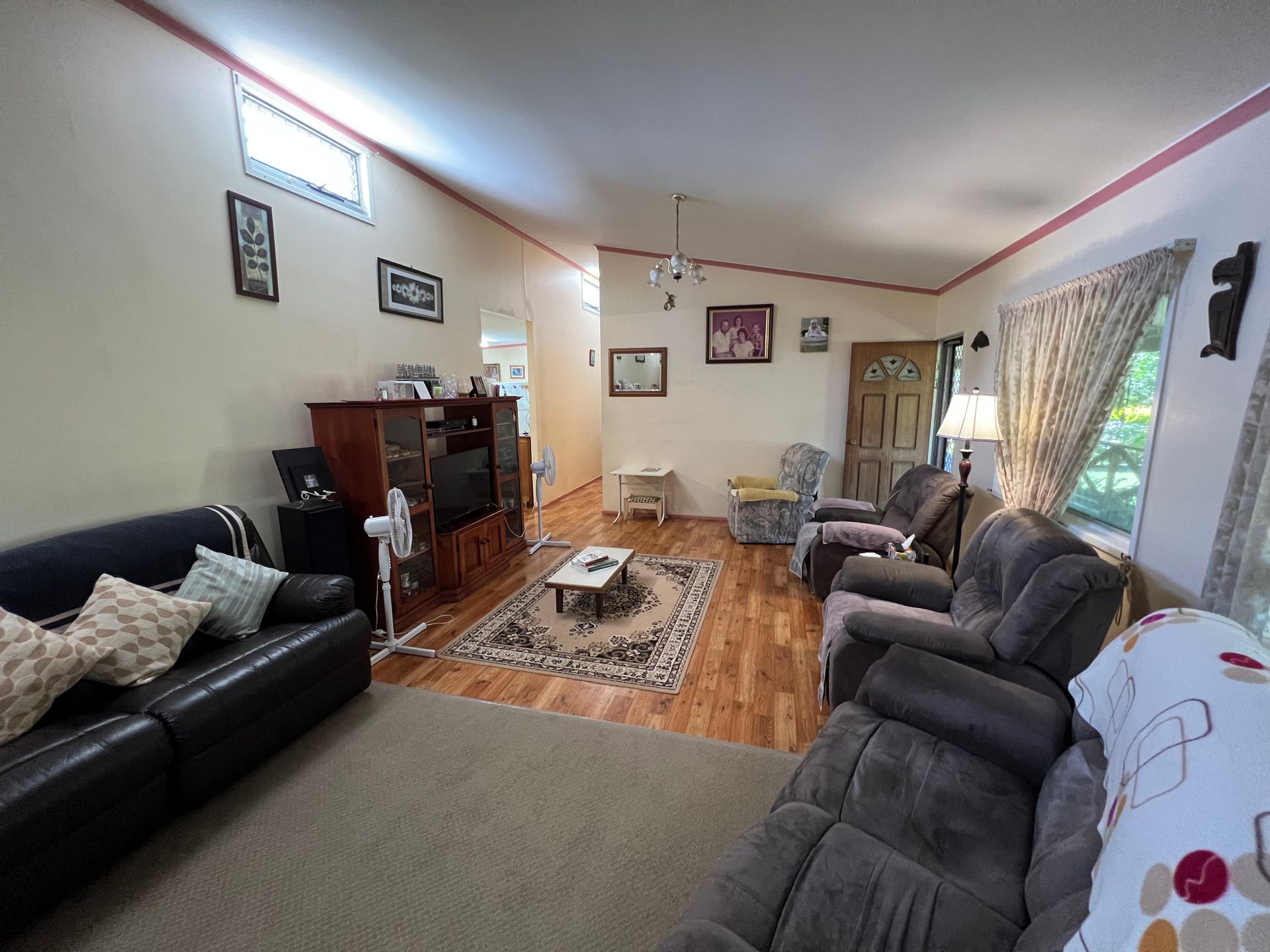 As you make your way towards the house from the front pathway shaded by established trees leads you to a full length 2.5m wide front veranda setting the mood for country living at its best. As you enter the home you can't help but notice the vaulted ceilings with skylight windows above. There is a wood heater in the main living room which is half carpeted making it a nice cosy area for those cooler winter nights. The other end of the living room has a timber look vinyl flooring which flows throughout the home.
