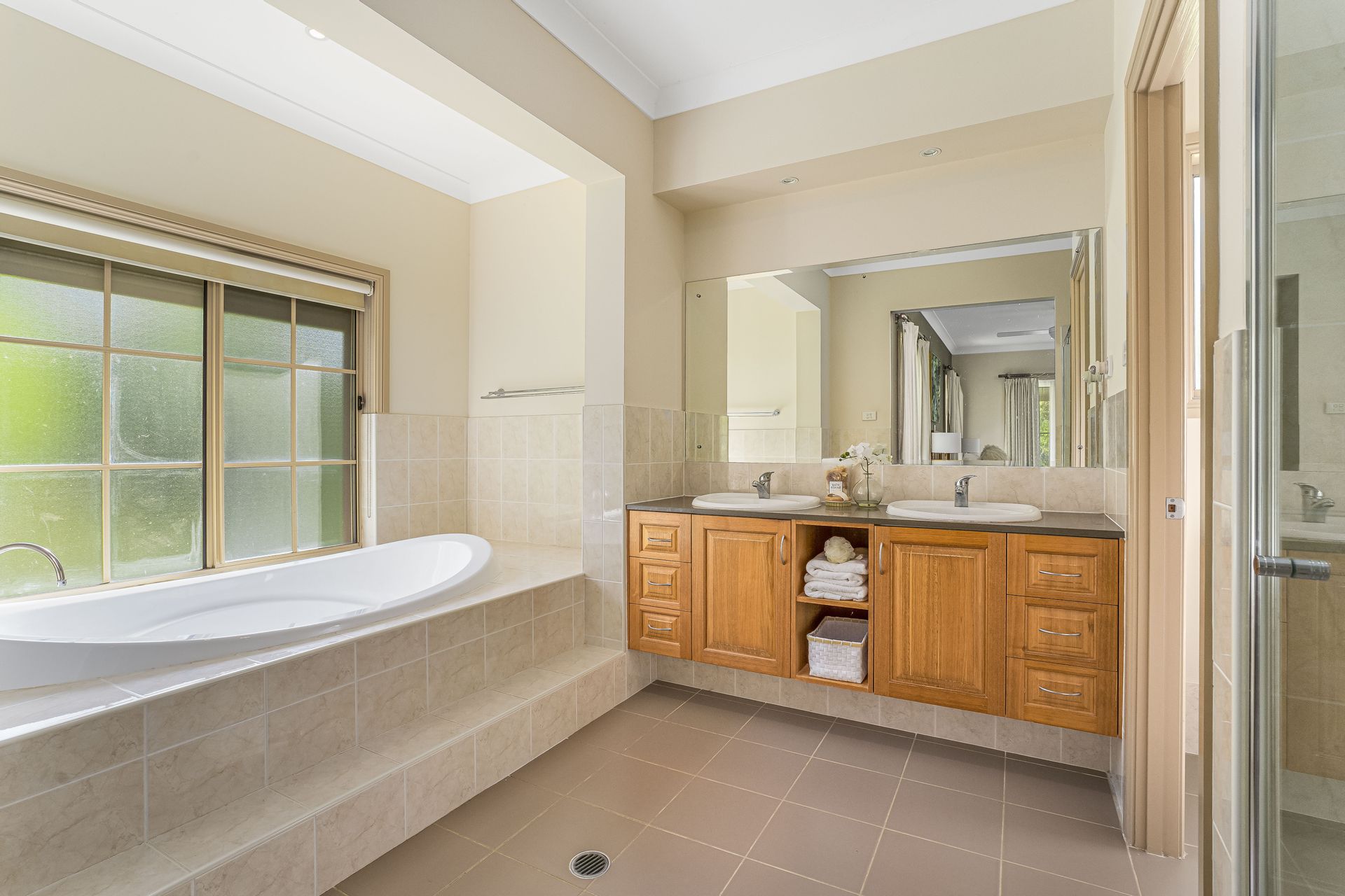 An opulent master bedroom with french doors opening out to the tiled verandah for your cooling breezes, ensuite complete with oval bath, electric shutter and dual sinks plus a sizeable walk-in-robe.