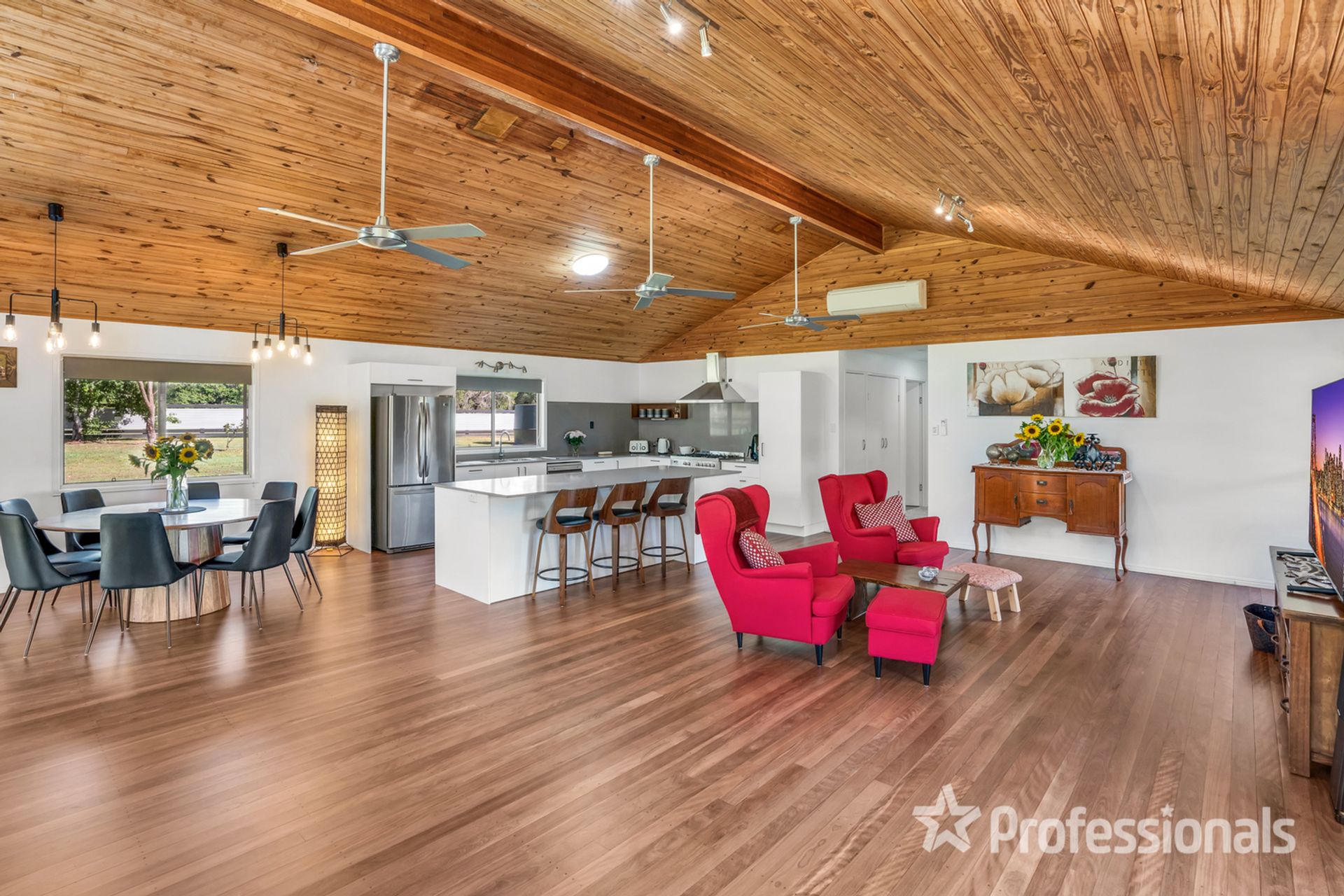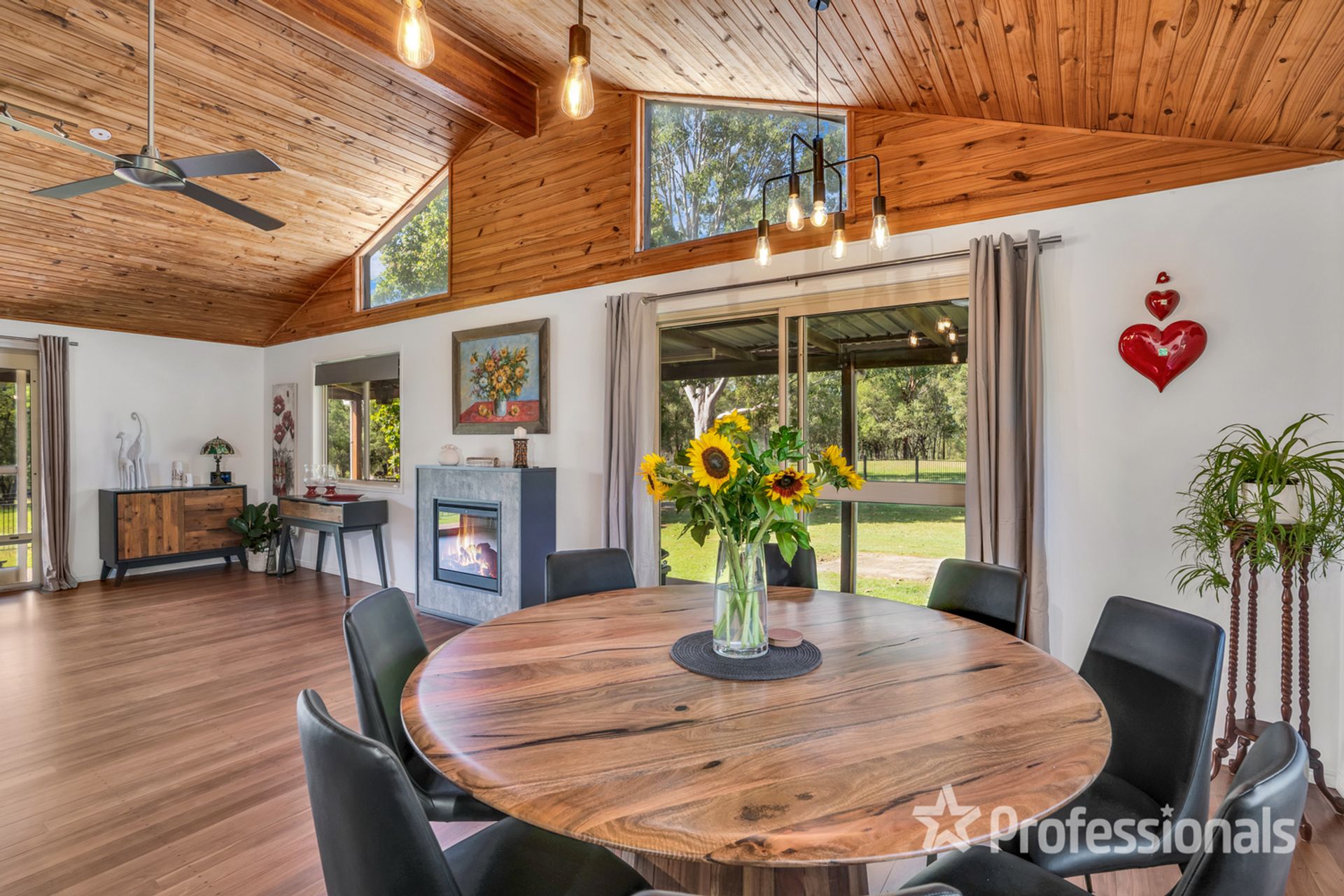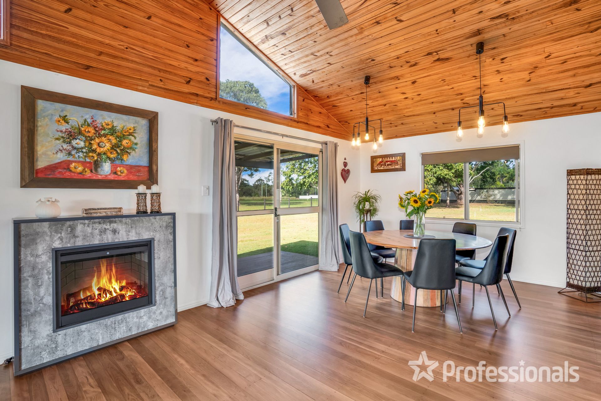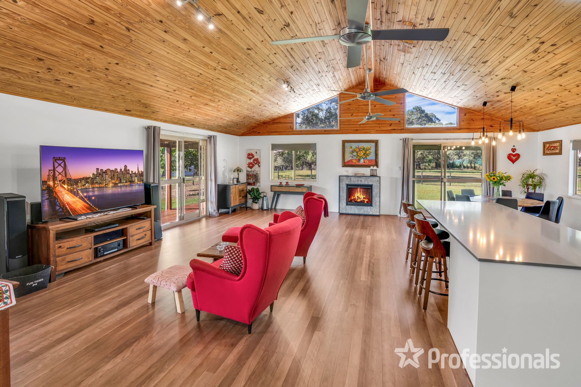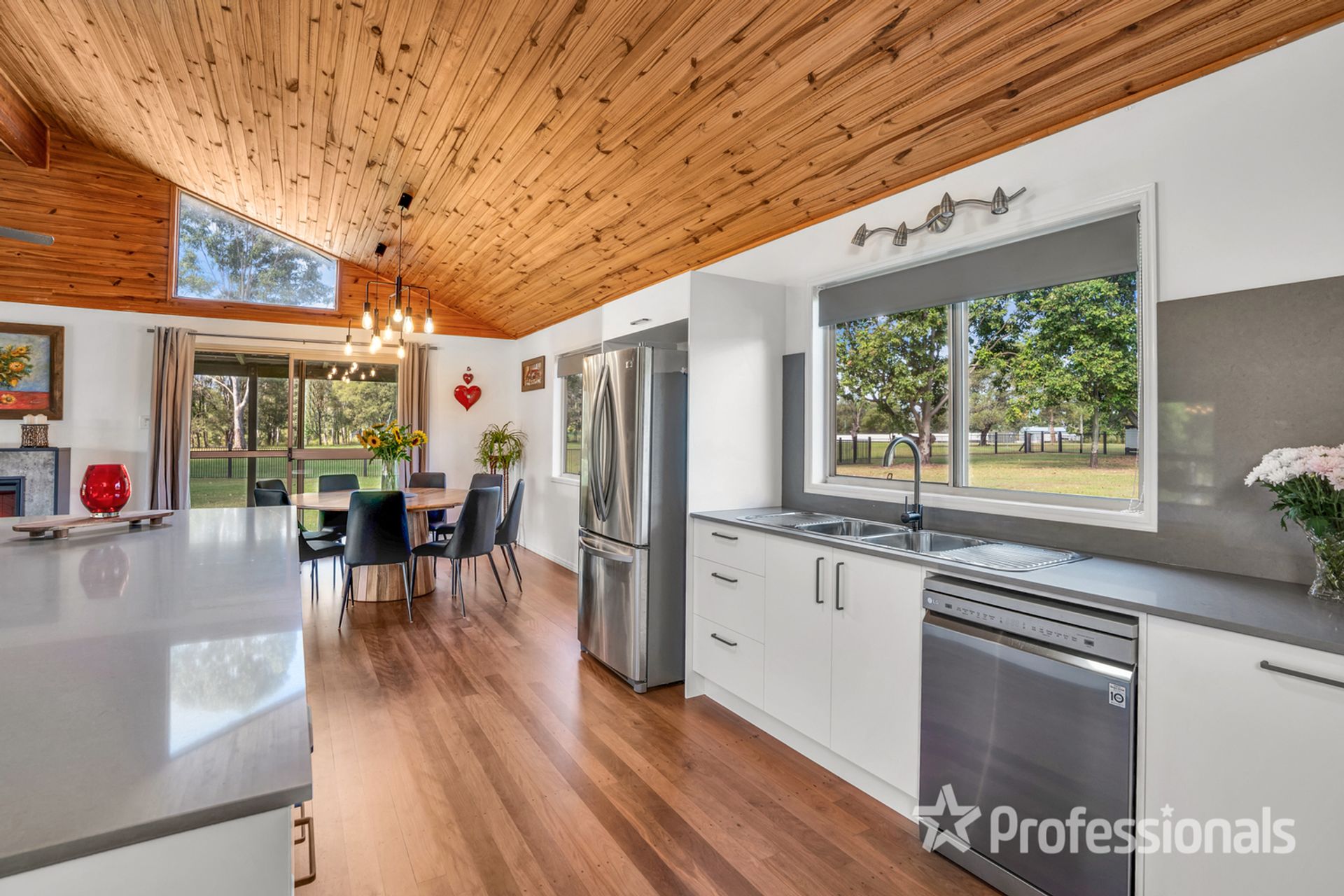 • Open plan living with feature fireplace, cathedral ceilings and gorgeous new timber flooring
