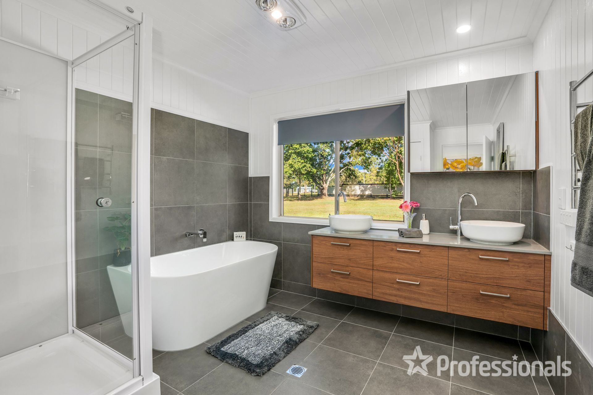 • New bathroom with his and her basins, shower and bathtub