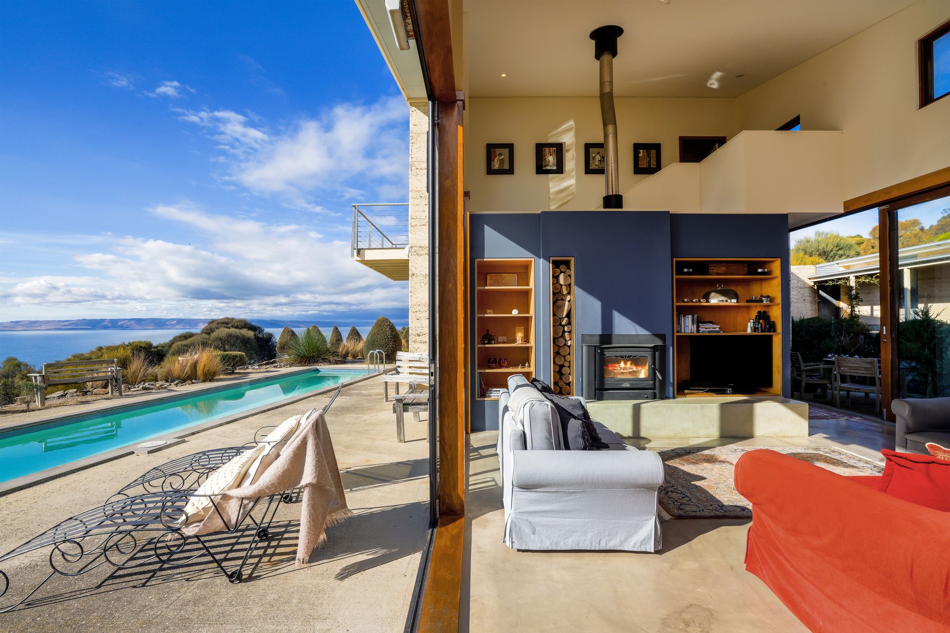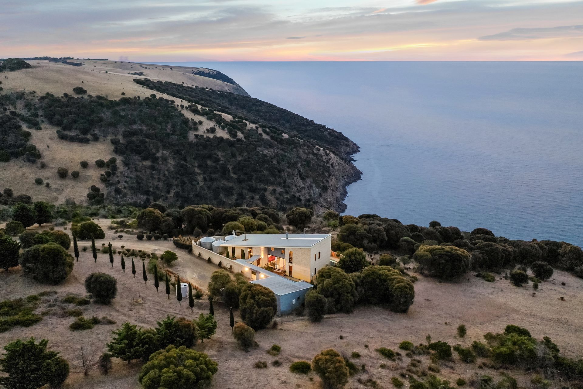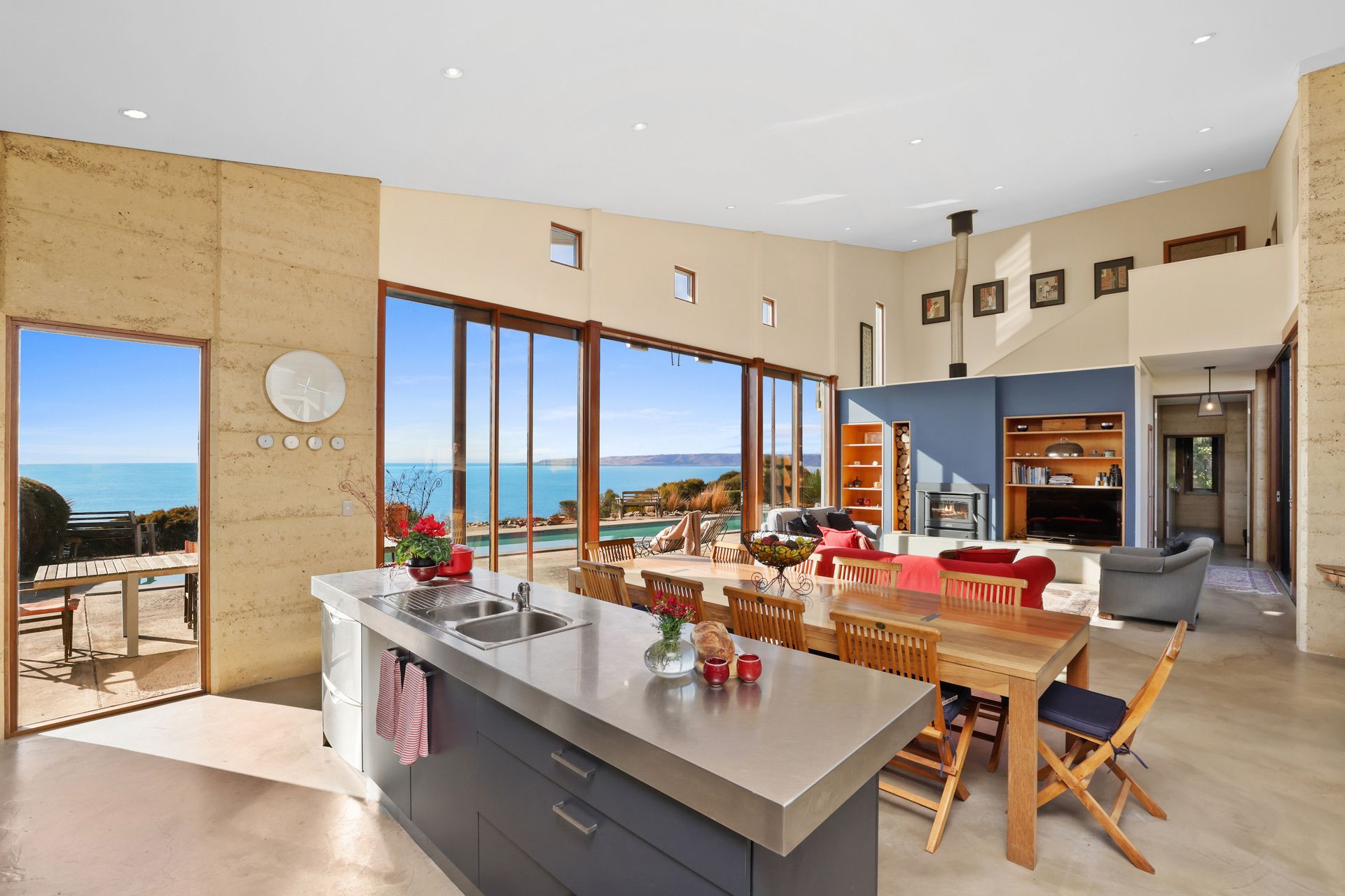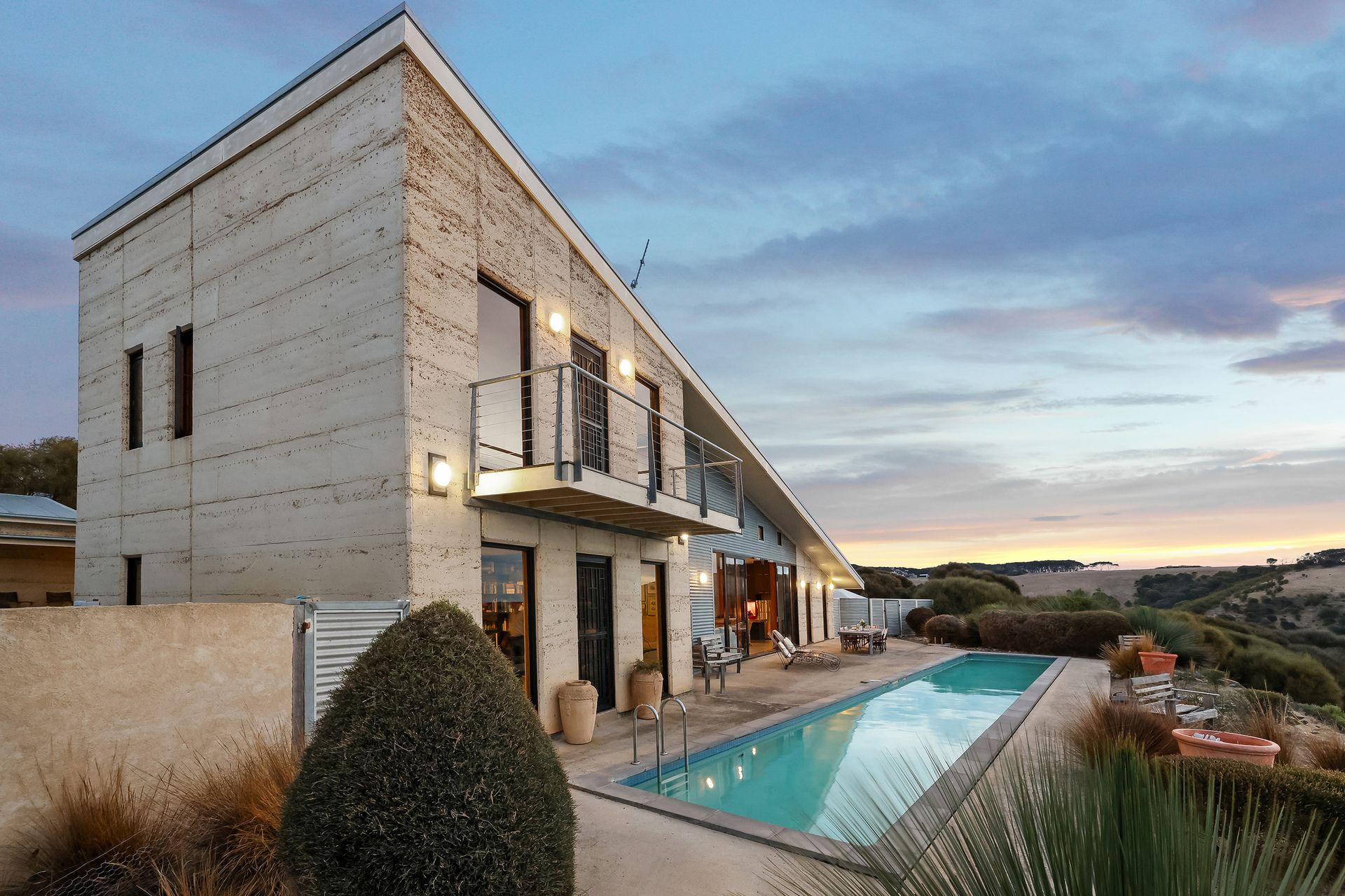 Purposely created for the coastal environment by SA architects Geoff Nairn and Tim Ross of Design Inc. This extraordinary rammed earth constructed residence, on approximately 135 acres, is perfectly positioned facing north, overlooking the vast blue waters of Backstairs Passage to the mainland.