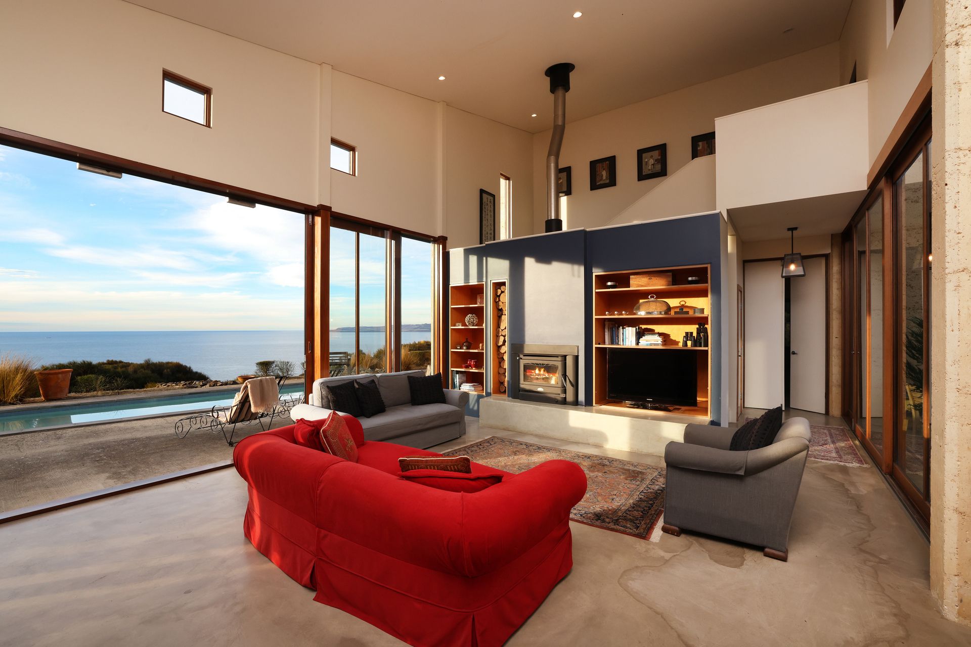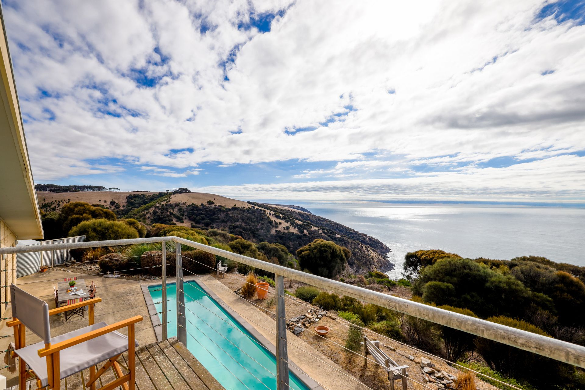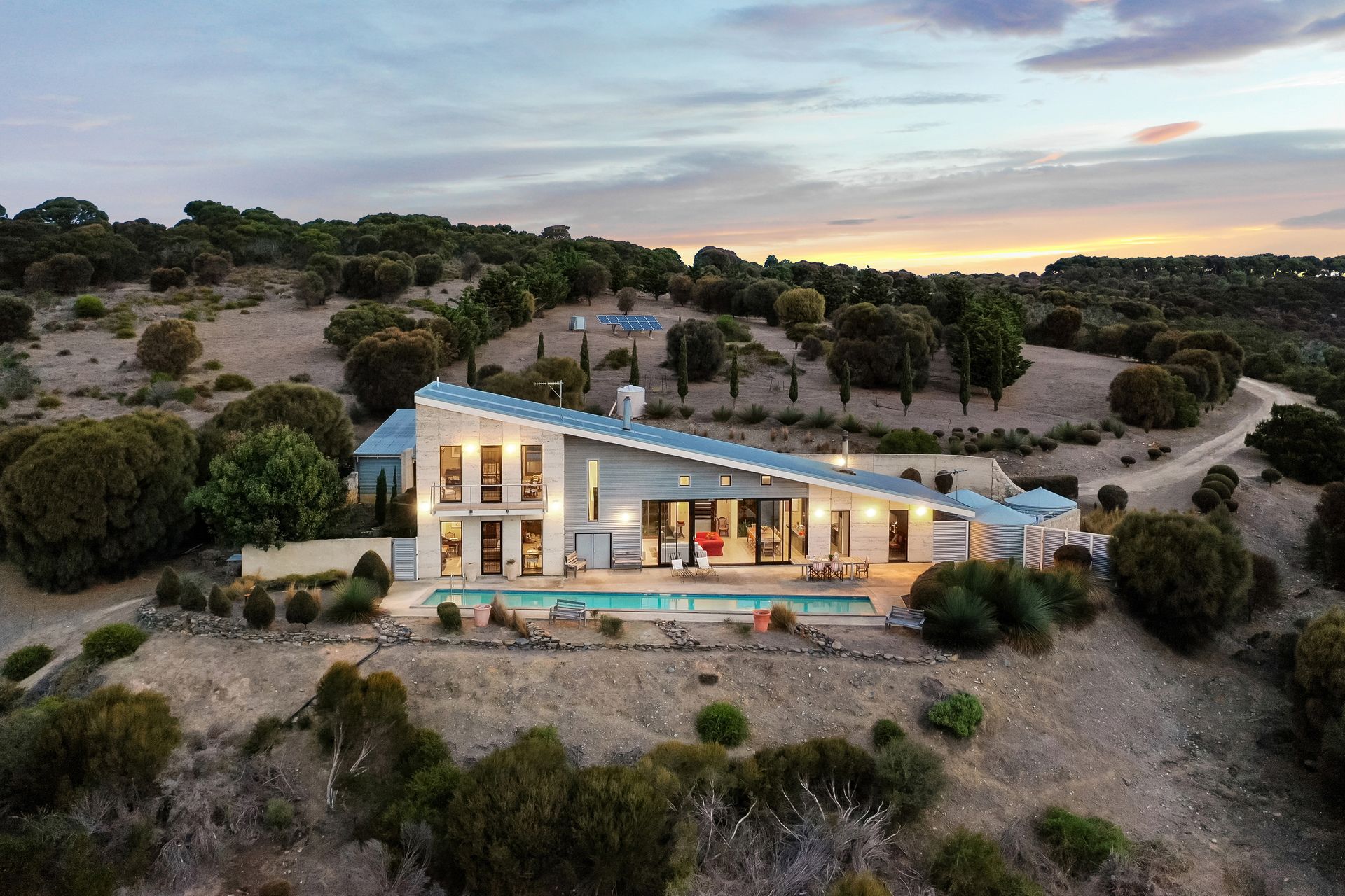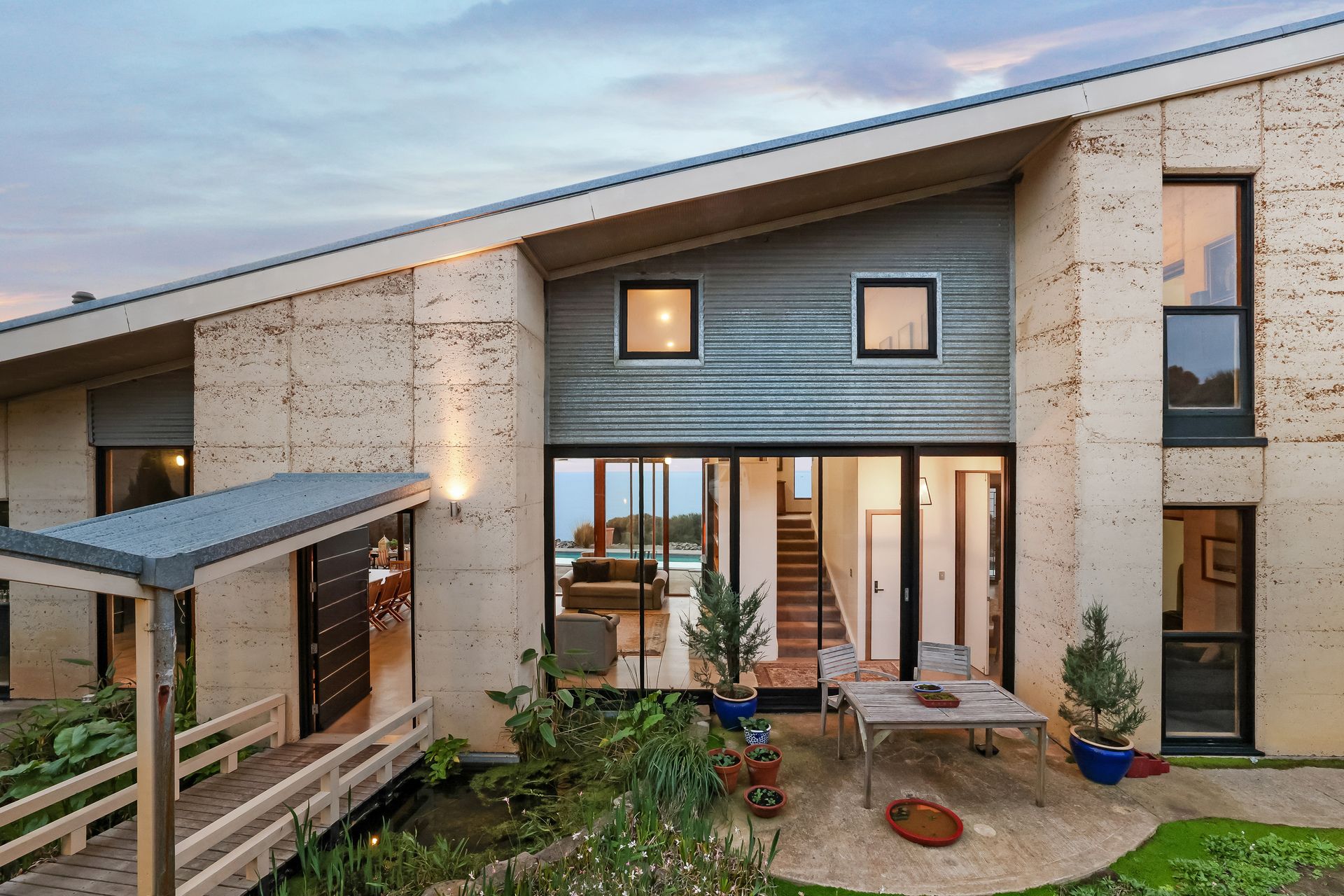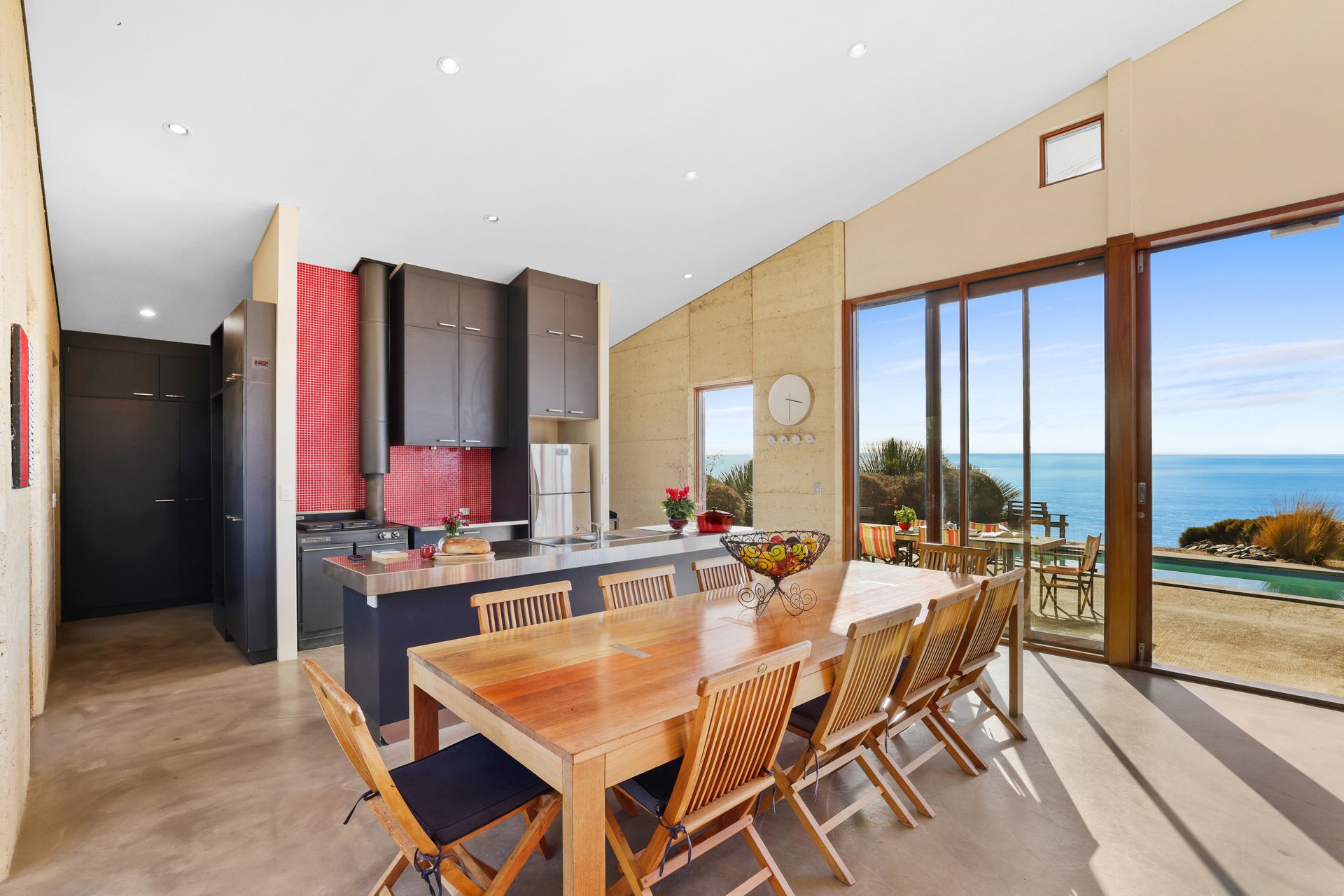 Purposely created for the coastal environment by SA architects Geoff Nairn and Tim Ross of Design Inc. This extraordinary rammed earth constructed residence, on approximately 135 acres, is perfectly positioned facing north, overlooking the vast blue waters of Backstairs Passage to the mainland.
