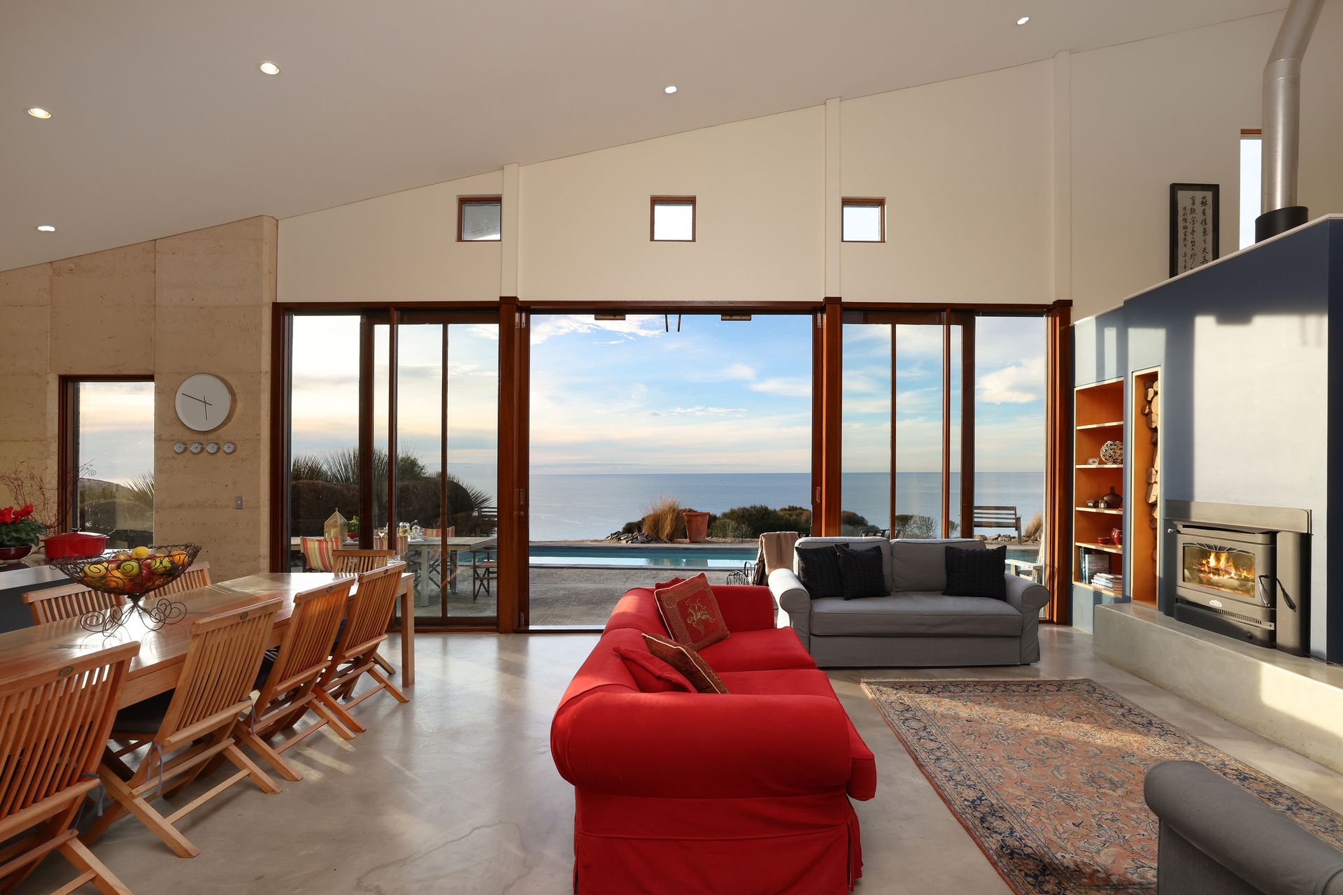 Heating and cooling have been cleverly planned for by utilising the natural environment and elements of the home. Concrete floors are heated throughout the cooler months through a combination of natural sunlight and an underfloor heating system.
