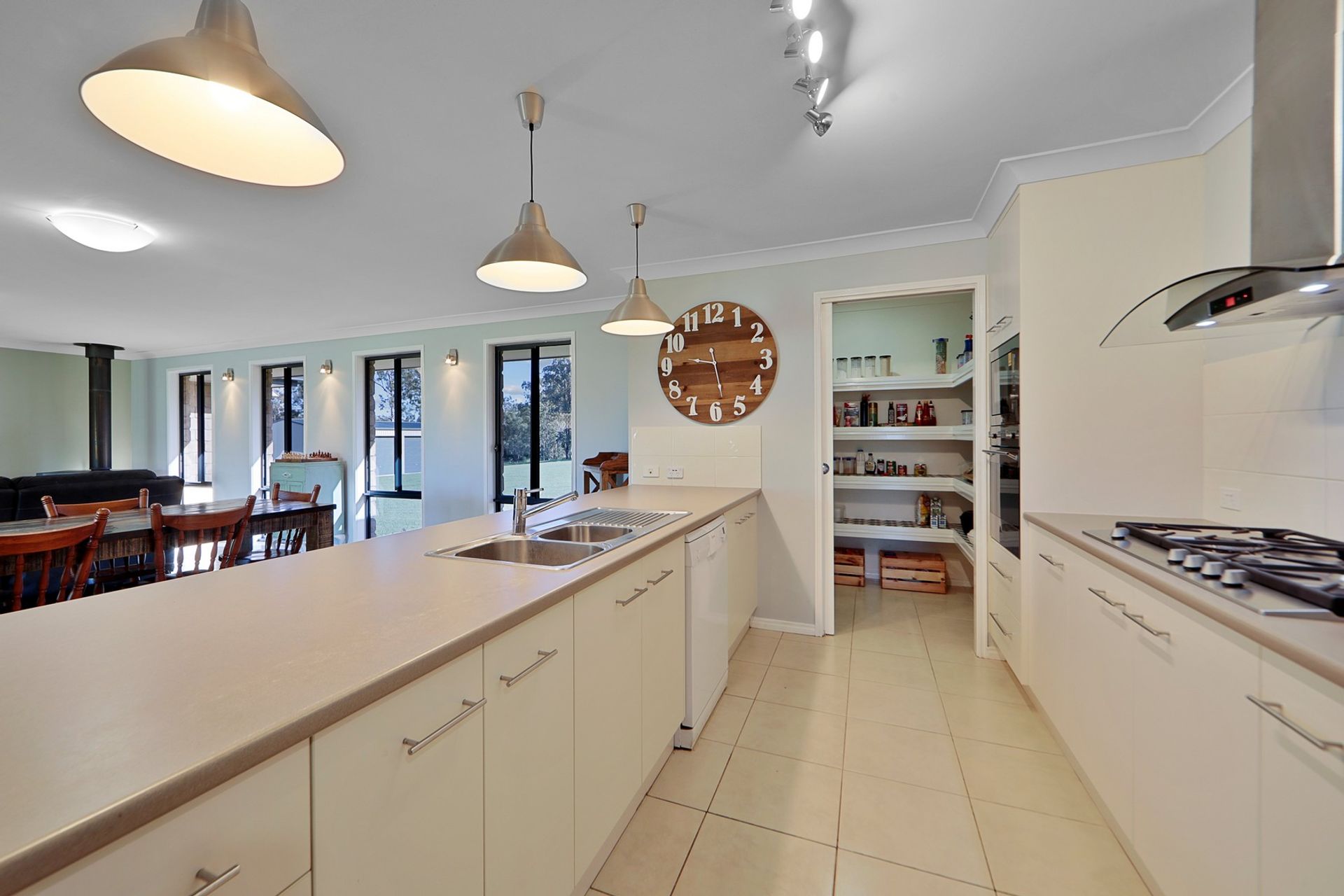 • The kitchen is complete with modern appliances, Gas Stove, Range hood, Electric Wall Oven, Built-in Microwave, Dishwasher as well as a Breakfast Bar & Large Walk in Pantry with shelving.