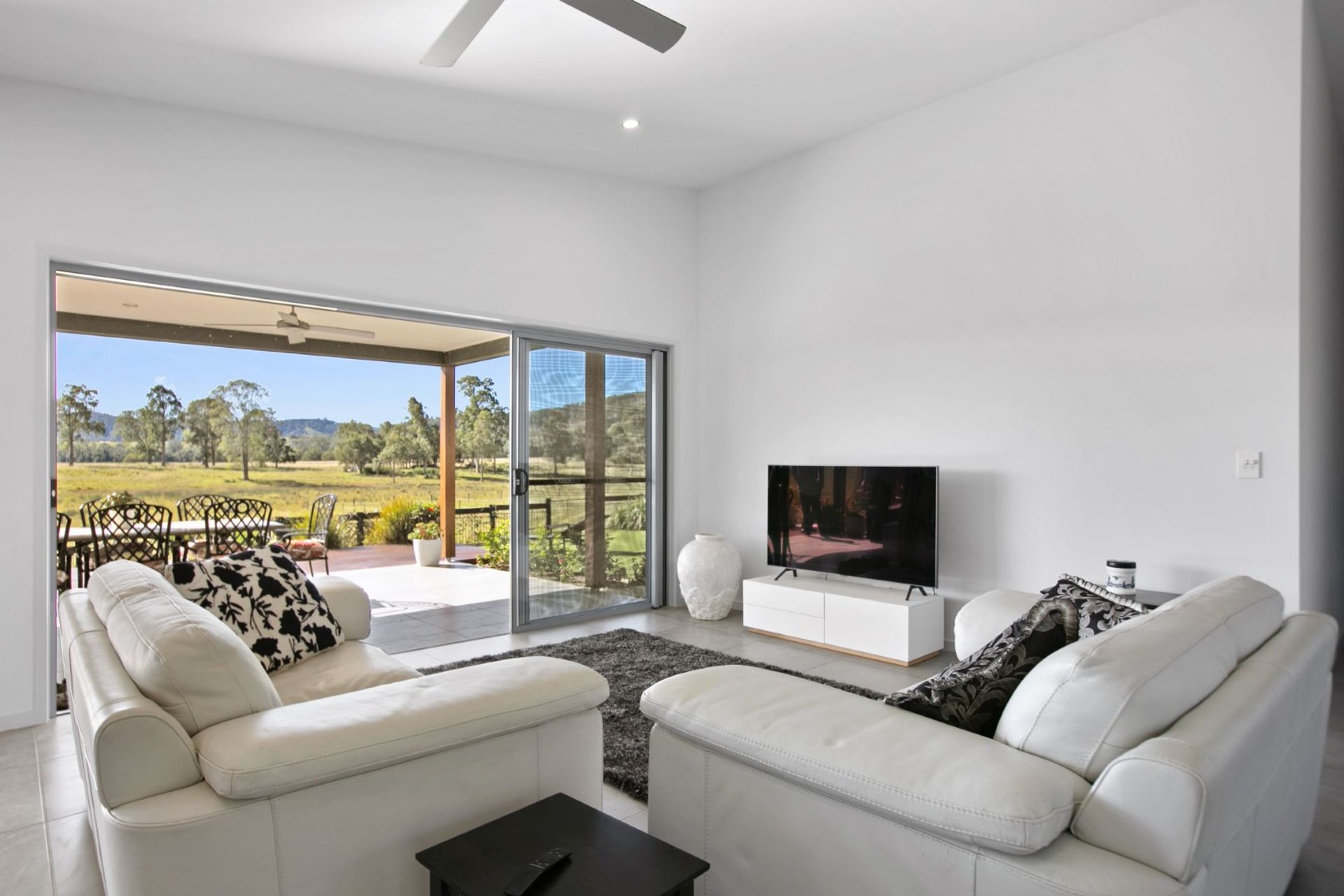 The impressive modern home features high vaulted ceilings, generous sized rooms and living areas as well as tastefully selected glass doors and windows, maximising on the abundance of natural light and offering views over the surrounding countryside.