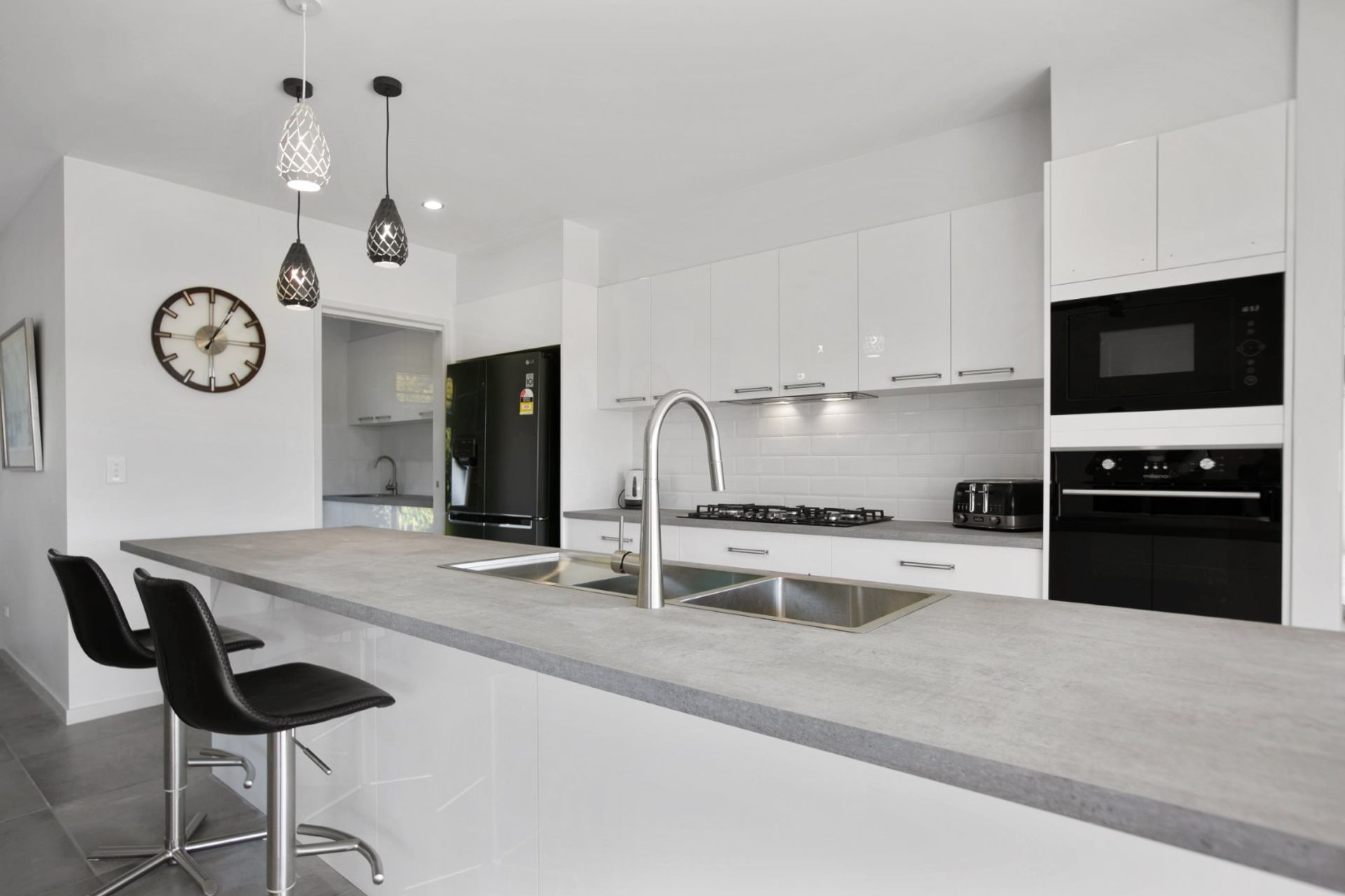 Fully equipped, the kitchen includes stone-look benchtops, two pack cabinetry and all modern appliances including built-in microwave, electric wall over and stainless steel gas hob. Attached to the kitchen is the large walk-in butlers pantry including plenty of room for storage and it's own sink.