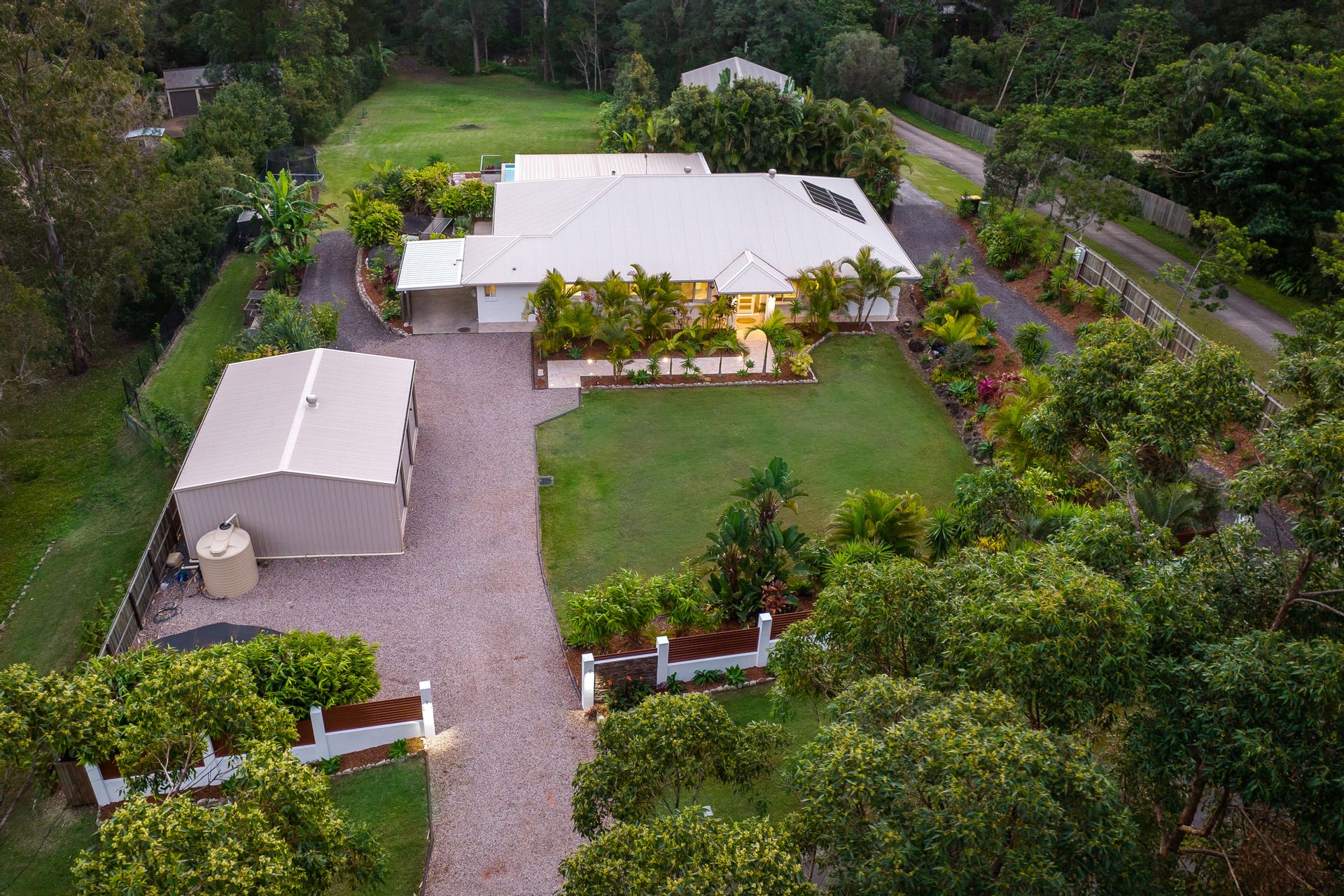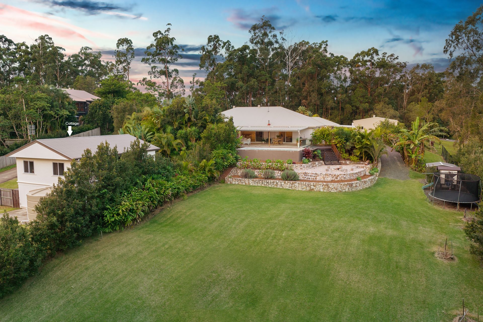 Along with two impeccable residences, new owners can experience outdoor pleasures such as strolls through the beautiful established gardens surrounding the home, harvesting home-grown produce from the fruit trees and vegetable gardens, peaceful evenings watching sunsets beside the fire pit, or outdoor games with the kids on one of the grassy lawn areas. Additional features include 3bay (9m x 8m) car accommodation with remote doors plus a single vehicle carport, ample room for your boat, RV or caravan, gas hot water, 1.5 kW of solar-electric panels, and a Puretek Hybrid G6 UV water filtration system. Water should be plentiful, with a deep dam which pumps water to the gardens, 20,000 gallons of storage at the main house, and 5,000 gallons at the cottage.