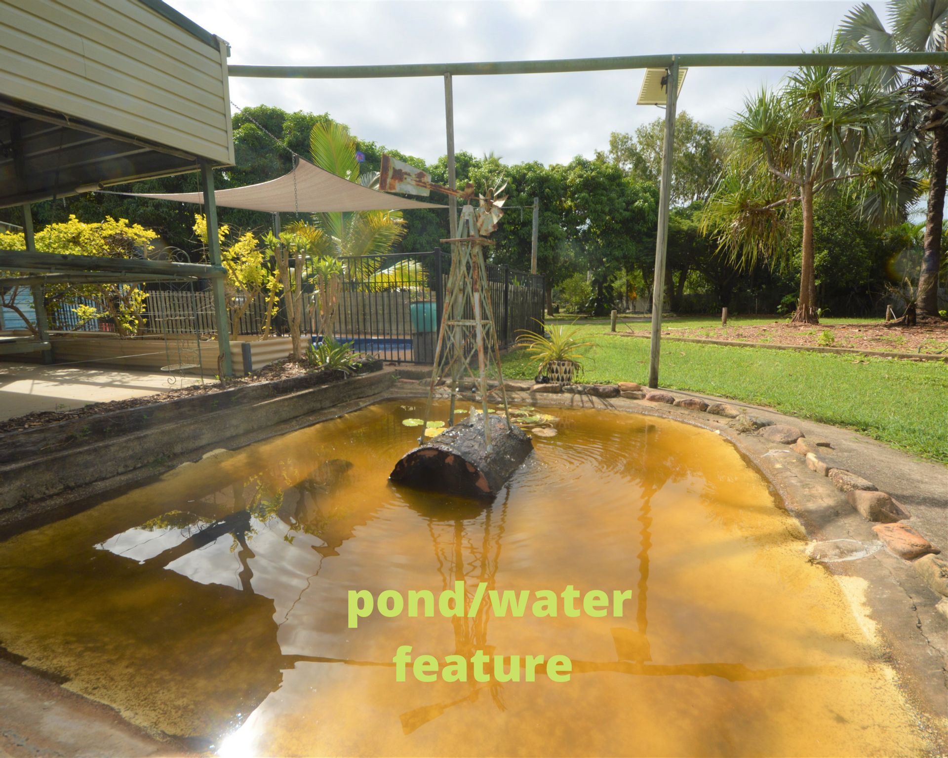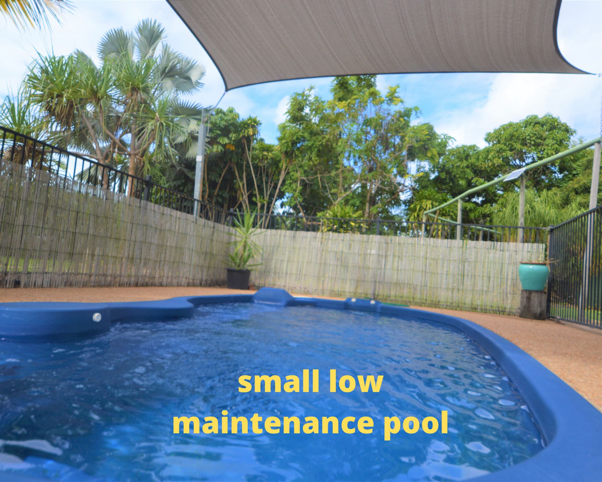 Small and easy to maintain in ground swimming pool with housing for pump, and pond.