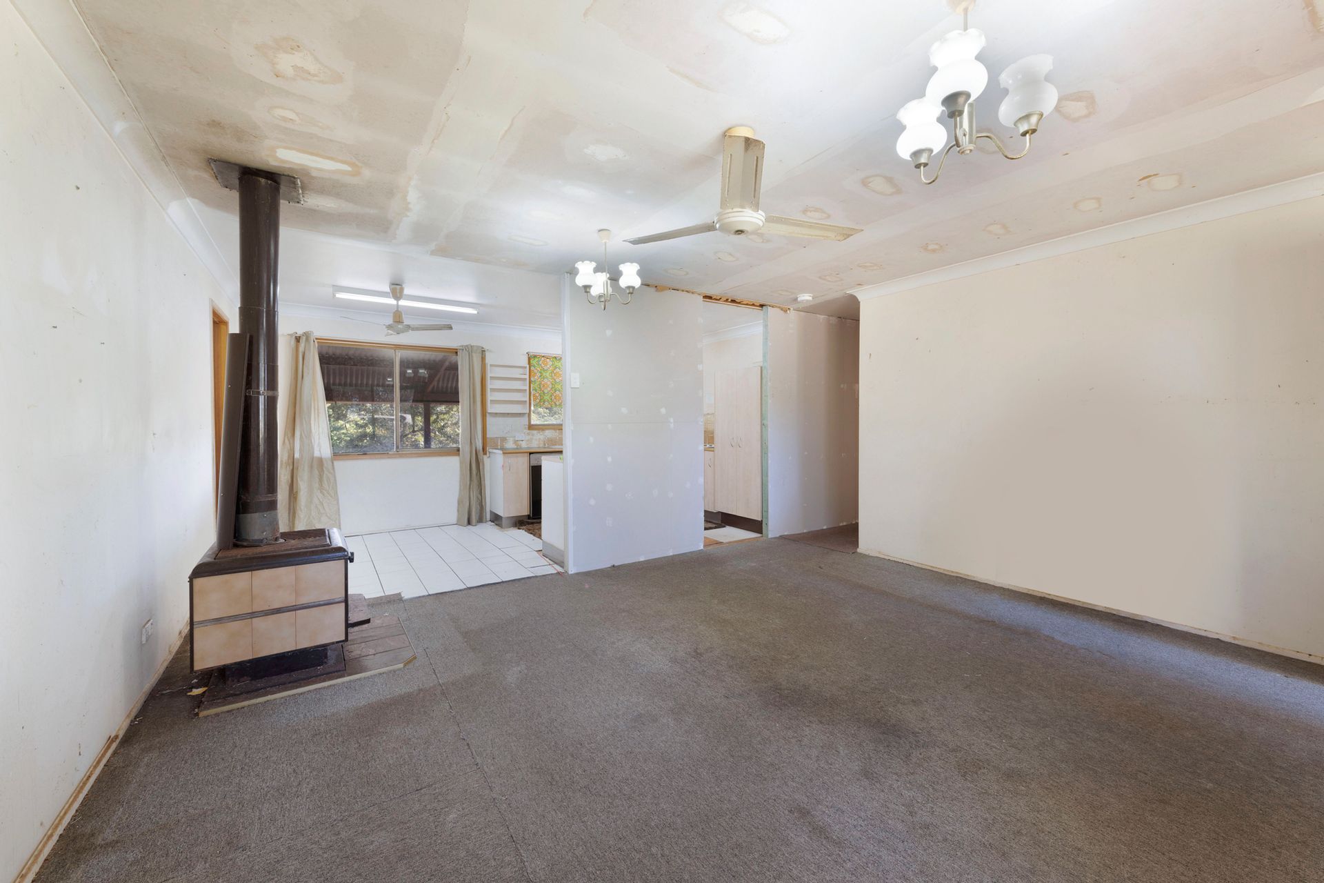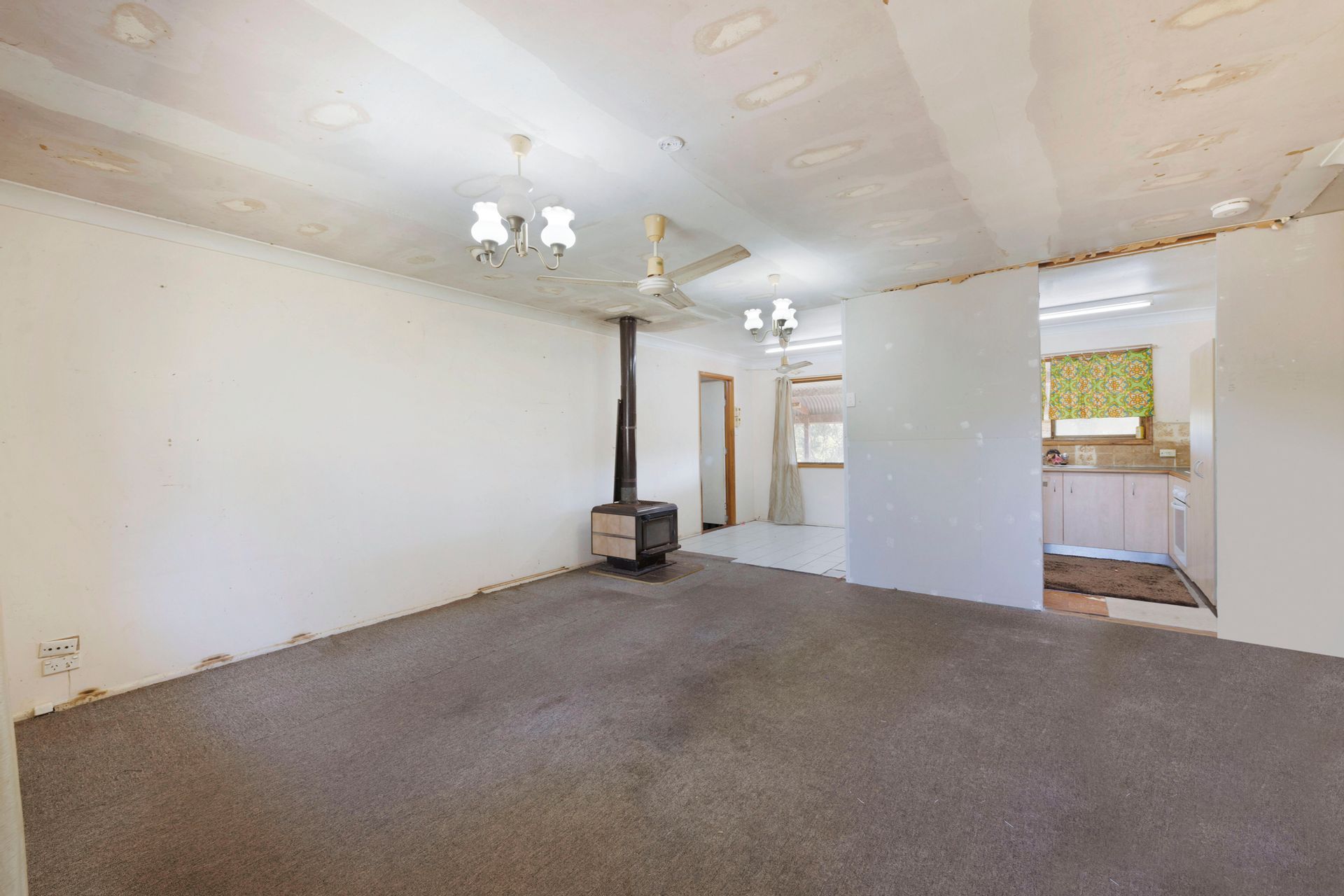 - Open plan Kitchen, Dining, Lounge with Wood Heater & ceiling fan