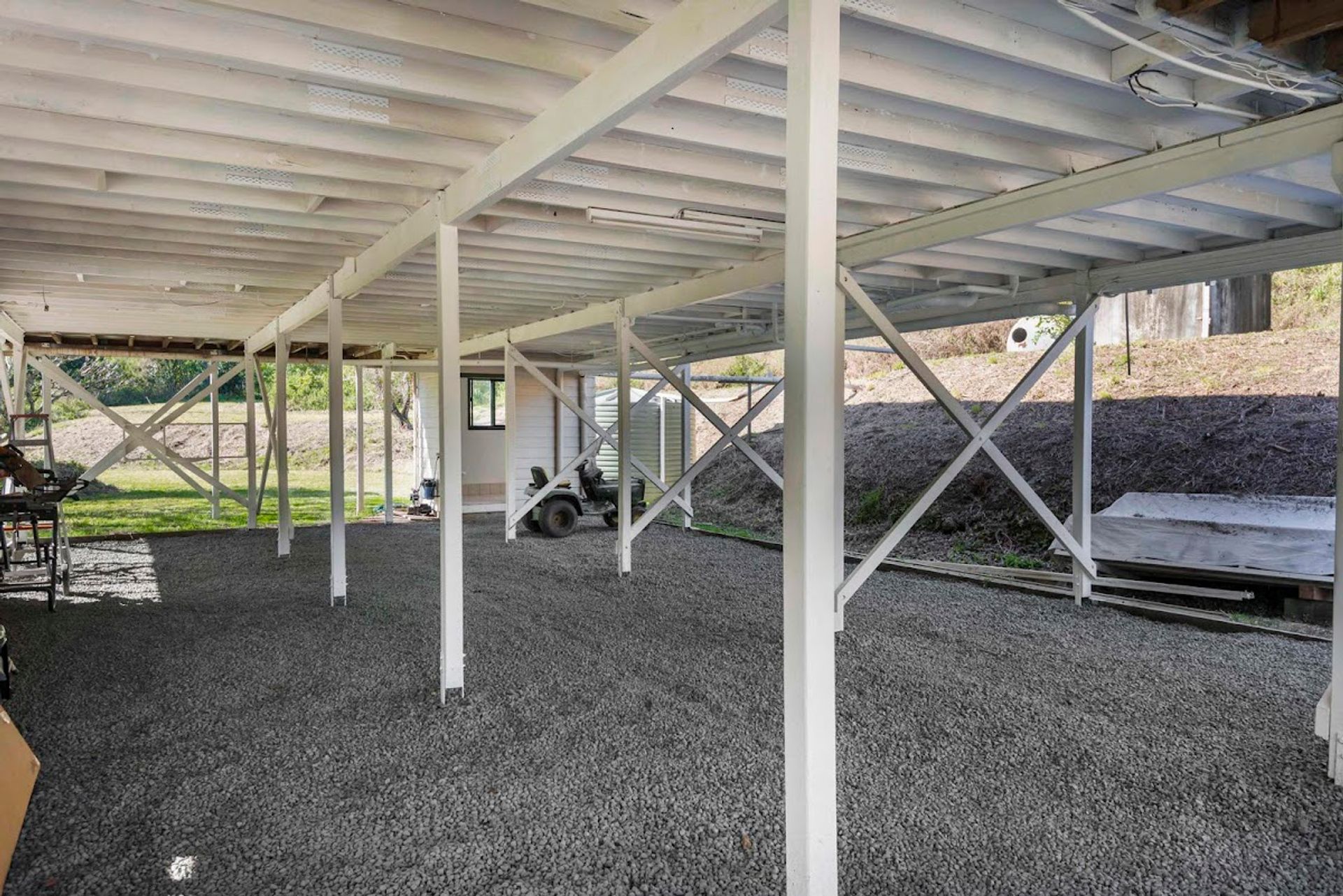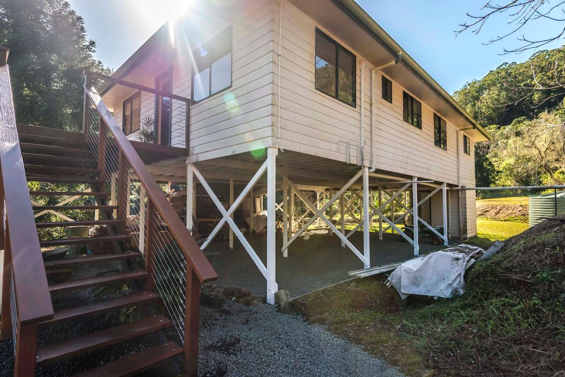 The house is sitting elevated on 2.8m timber poles offering loads of potential below for additional rooms, perhaps a huge garage or just add a pool table & sports bar. The laundry & 2nd toilet are enclosed in the south-eastern corner. There is blue metal spread throughout this area making it a dry usable space all year round. Internally the house feels spacious and bright and it has been well maintained.