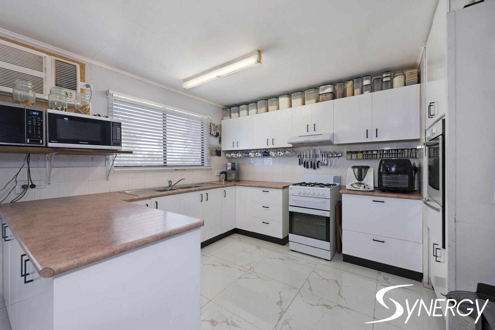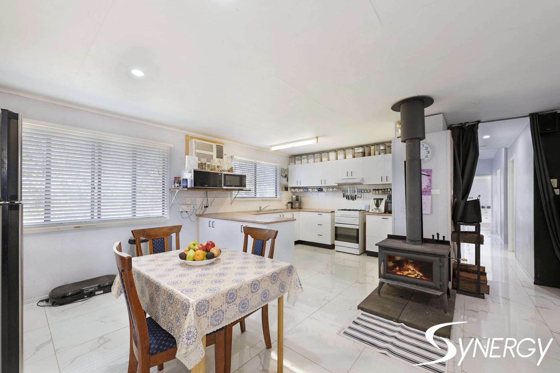 Inside the home you will find white marble gloss tiled through the house and vinyl flooring in the entertaining area. There is a large fireplace in the kitchen and dining area to keep the house heated in the winter months and an abundance of windows through out to keep the home cool in the summer months.