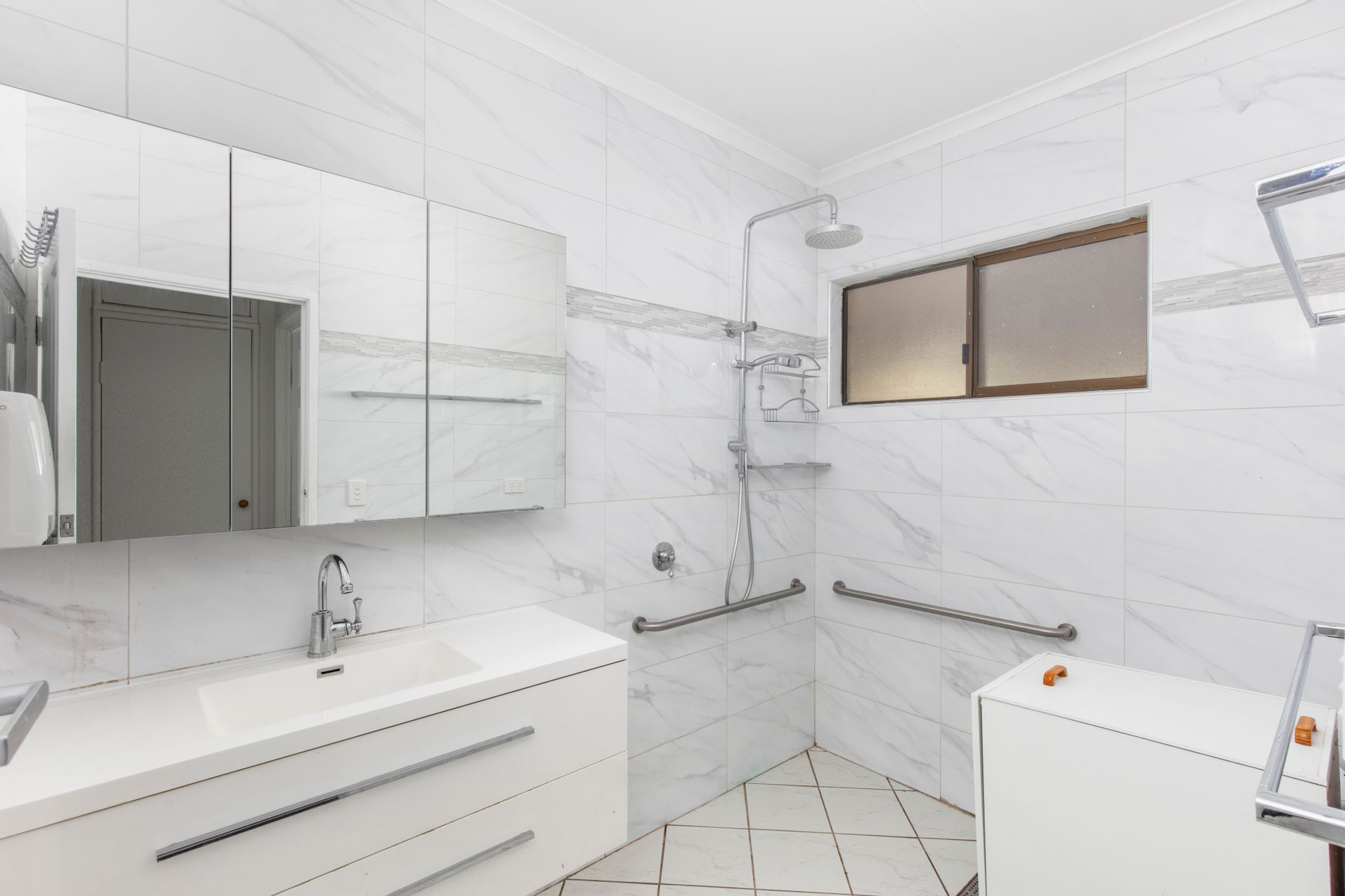 - Fully renovated bathroom with roof-to-floor tiling