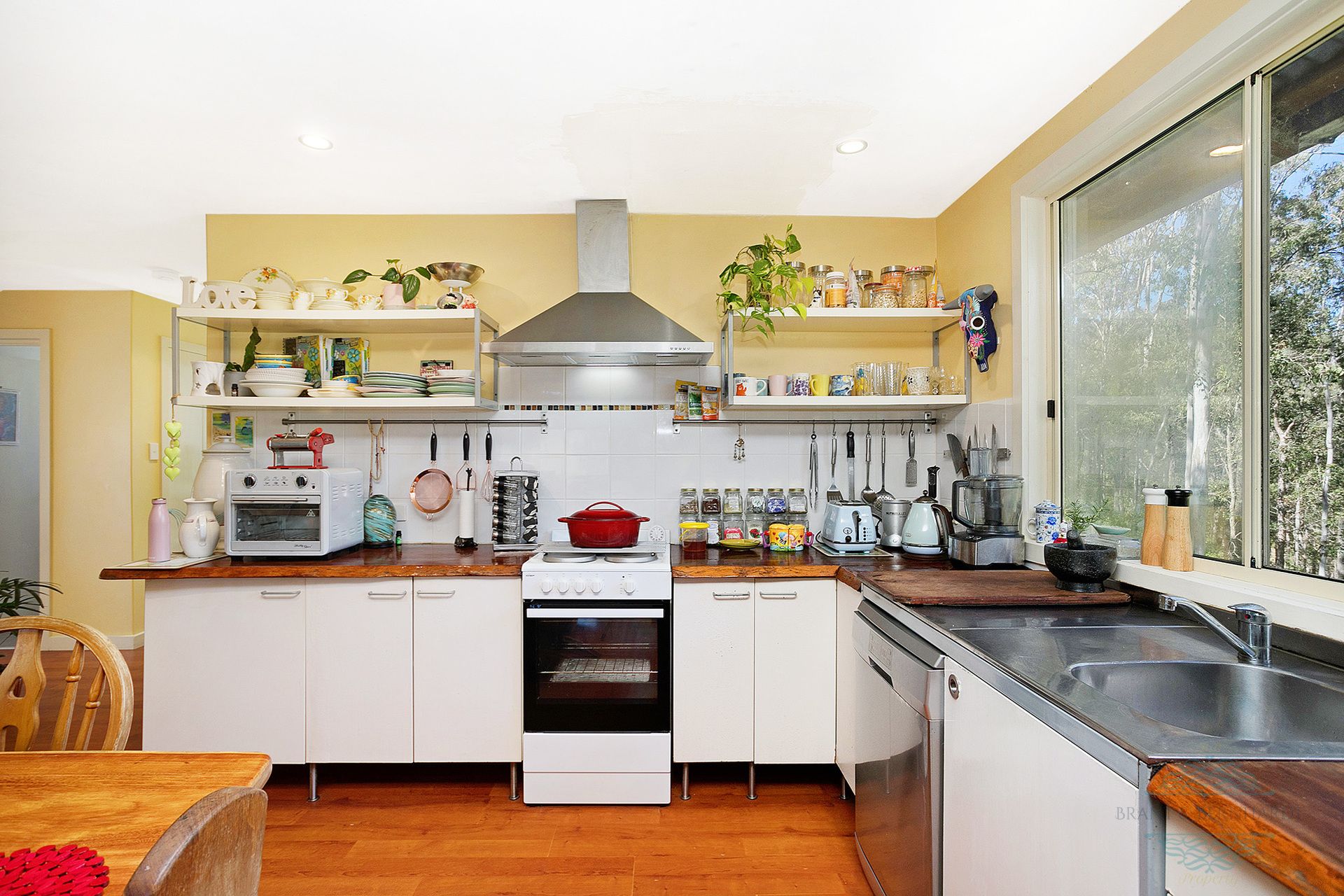 - Country kitchen with dining space, natural raw sawn, timber bench tops, free standing stove, stainless steel dishwasher and timber look floor
