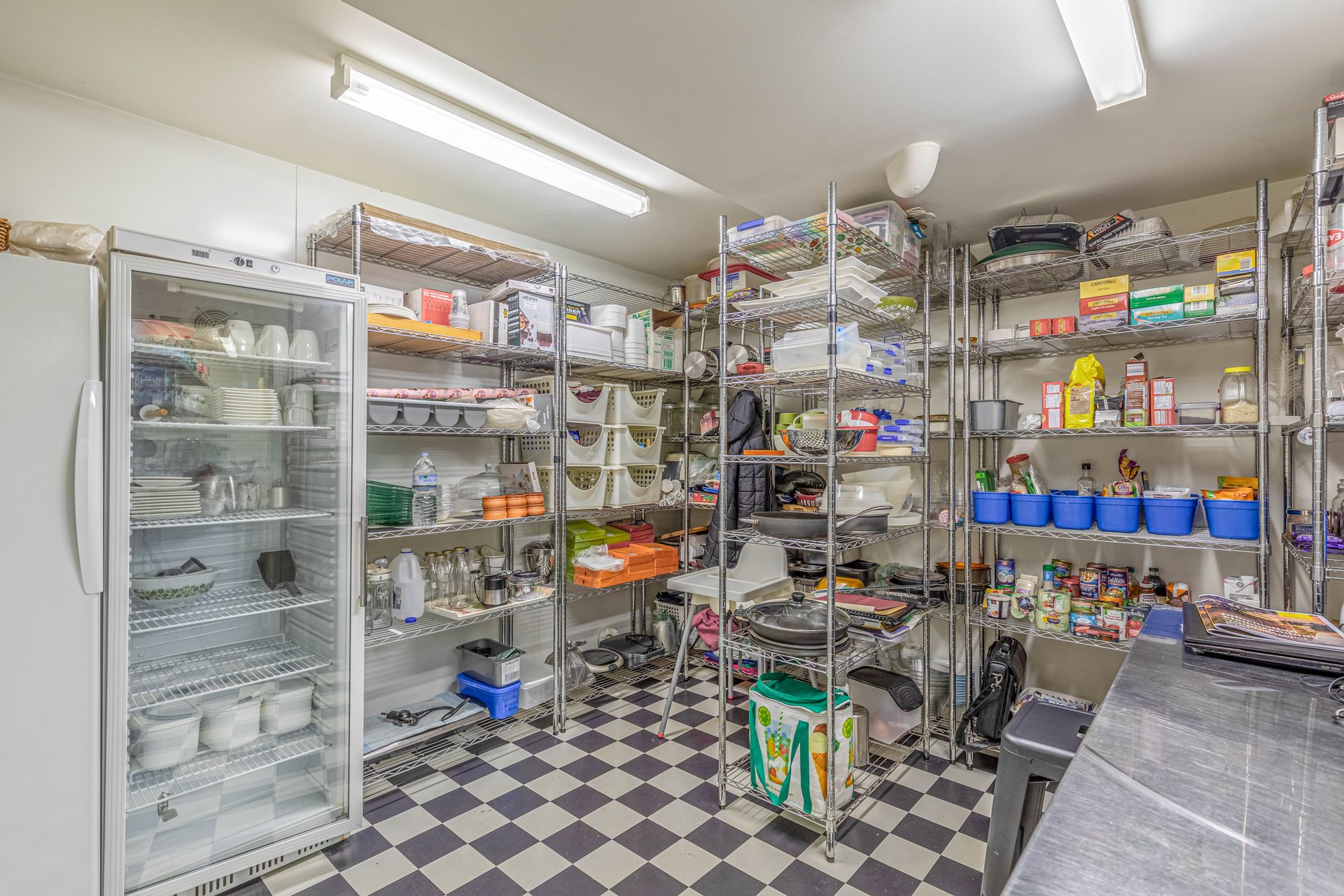 • Large pantry with wire rack shelving and multiple fridges/freezers