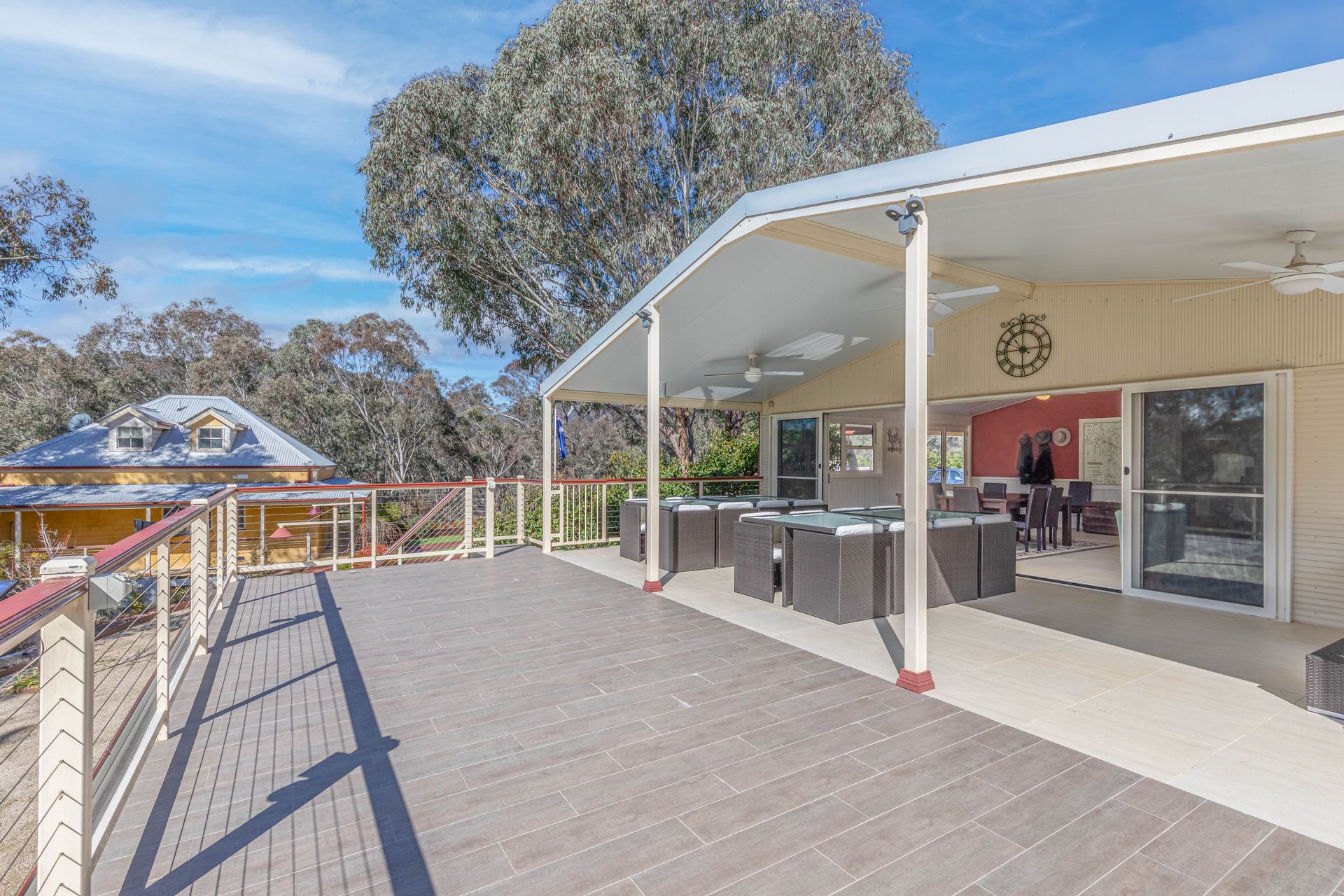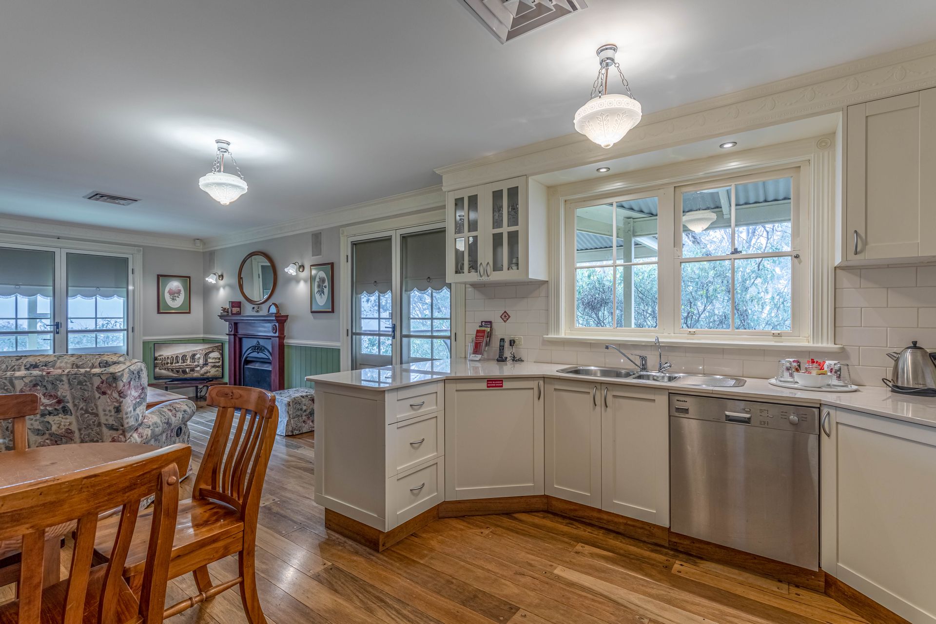 • Large dining room with ceiling fans and Jindara slow combustion wood heater