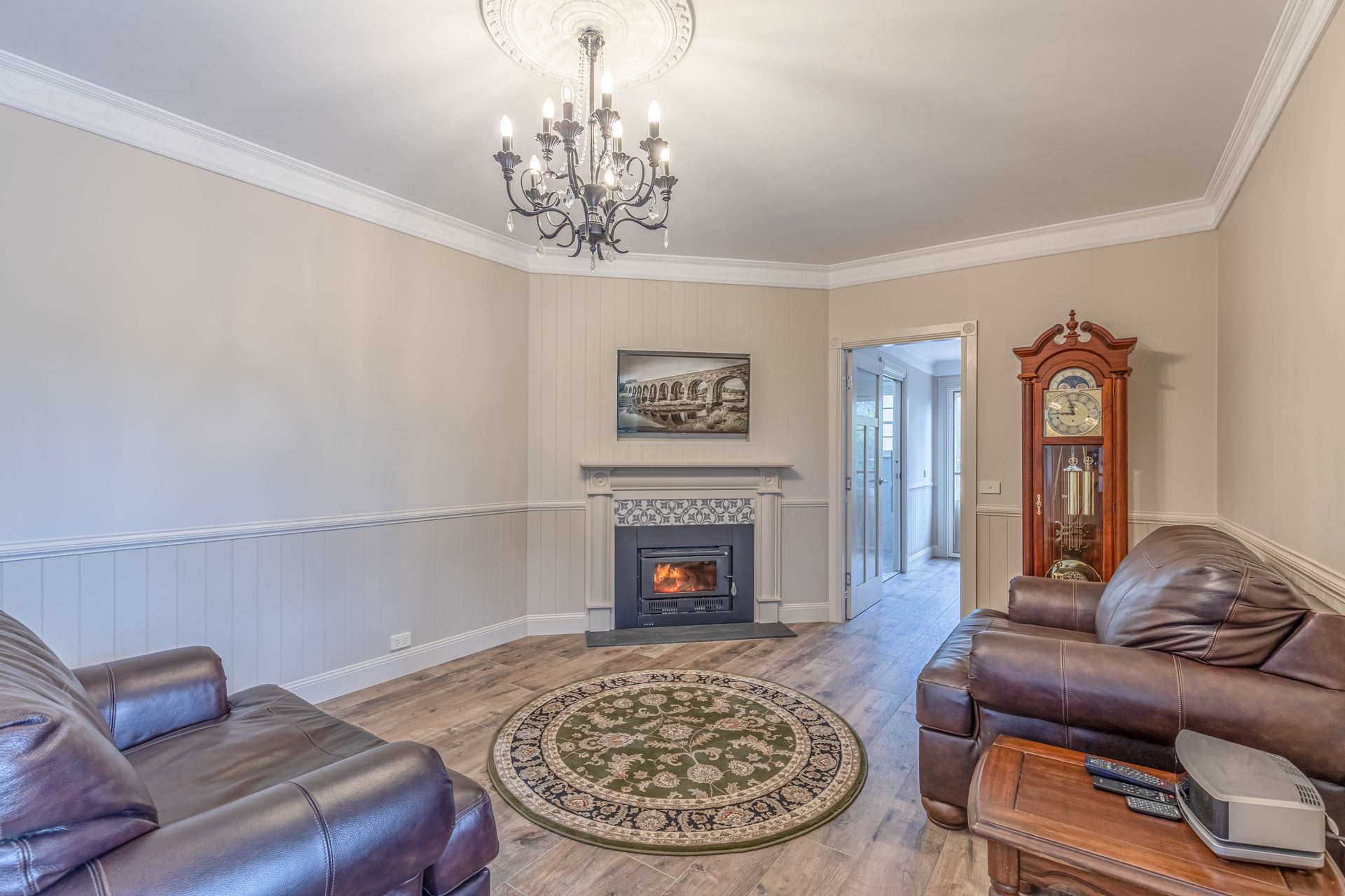 • Separate open plan living area with slow combustion wood fireplace