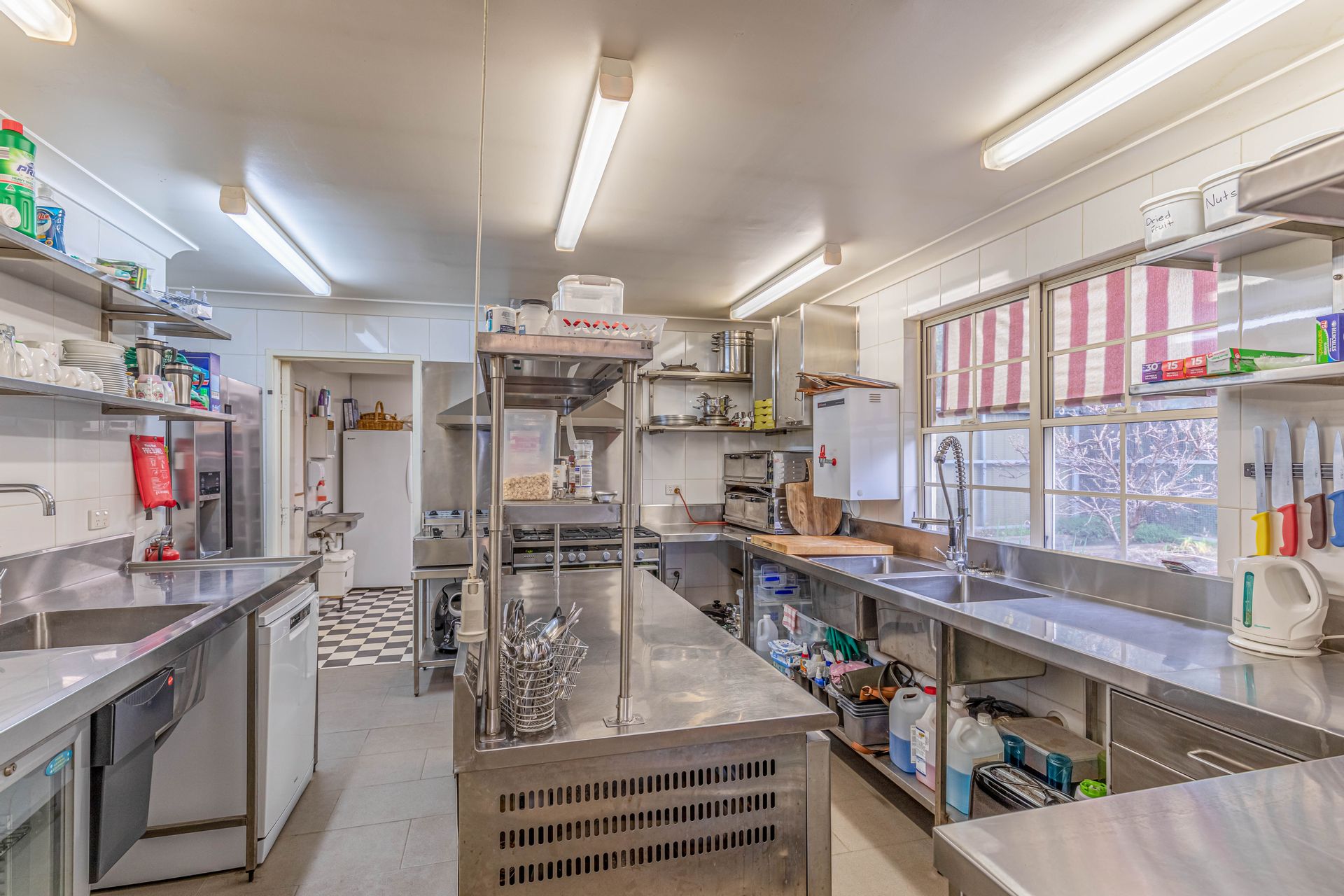 • Commercial grade kitchen with stainless steel workbenches