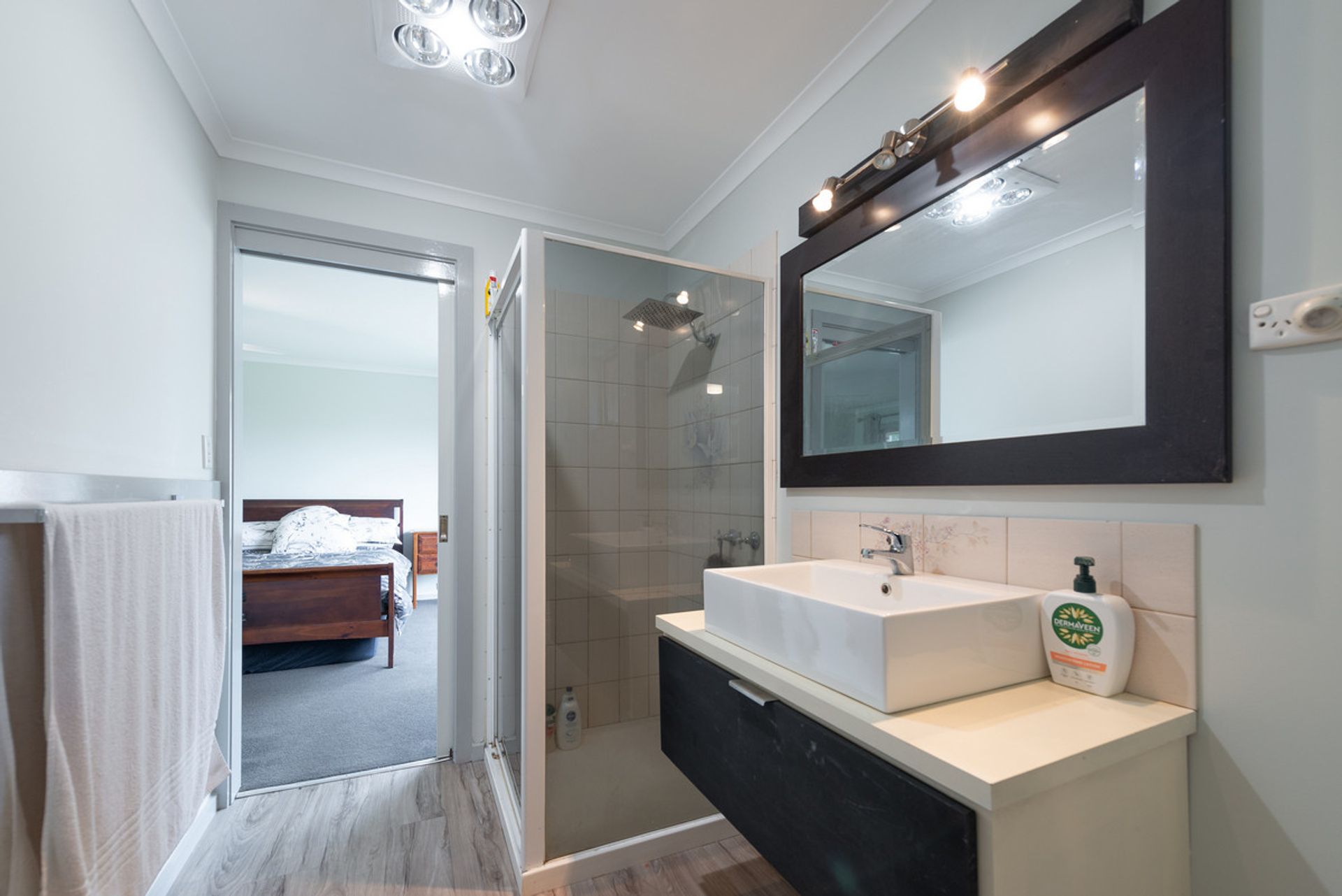 The expansive Master bedroom showcases a calming outlook, walk-in robe, ceiling fan and an ensuite featuring a hung vanity with modern rectangular sink, shower, toilet and IXL tastic. Jack n Jill access to the ensuite from the commodious laundry with generous cabinetry and bench space, ensures there is an accessible bathroom on each floor of the house.