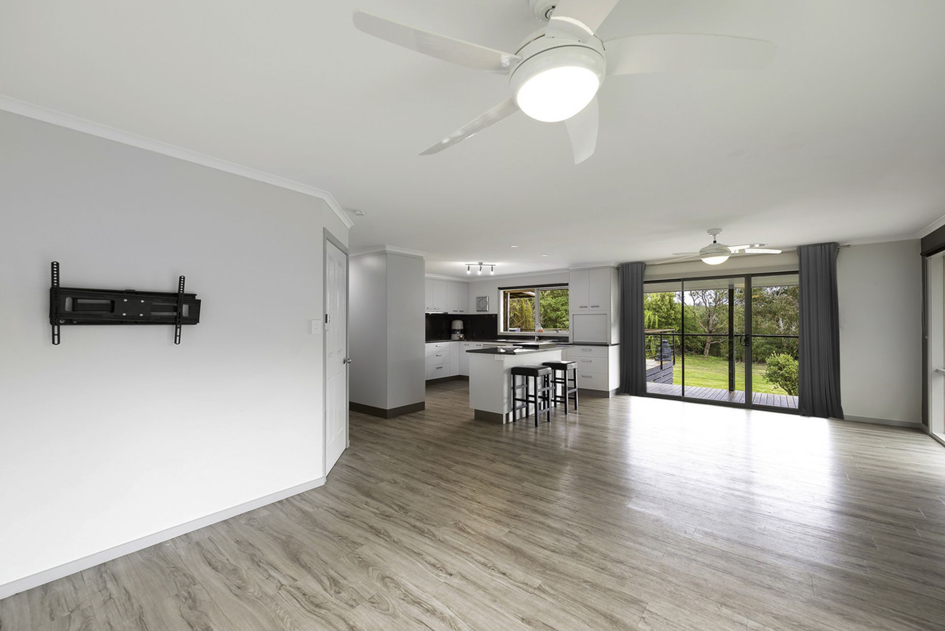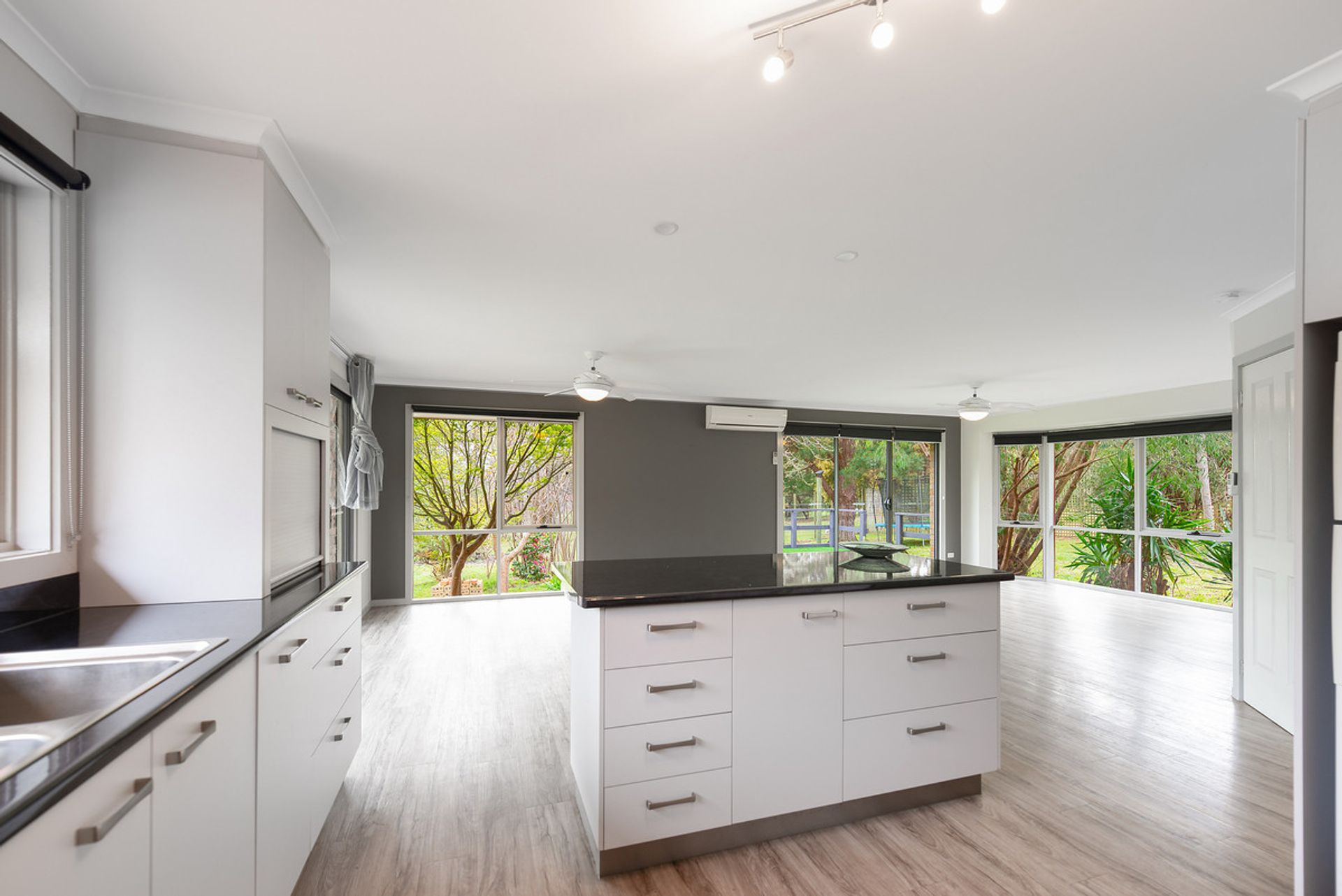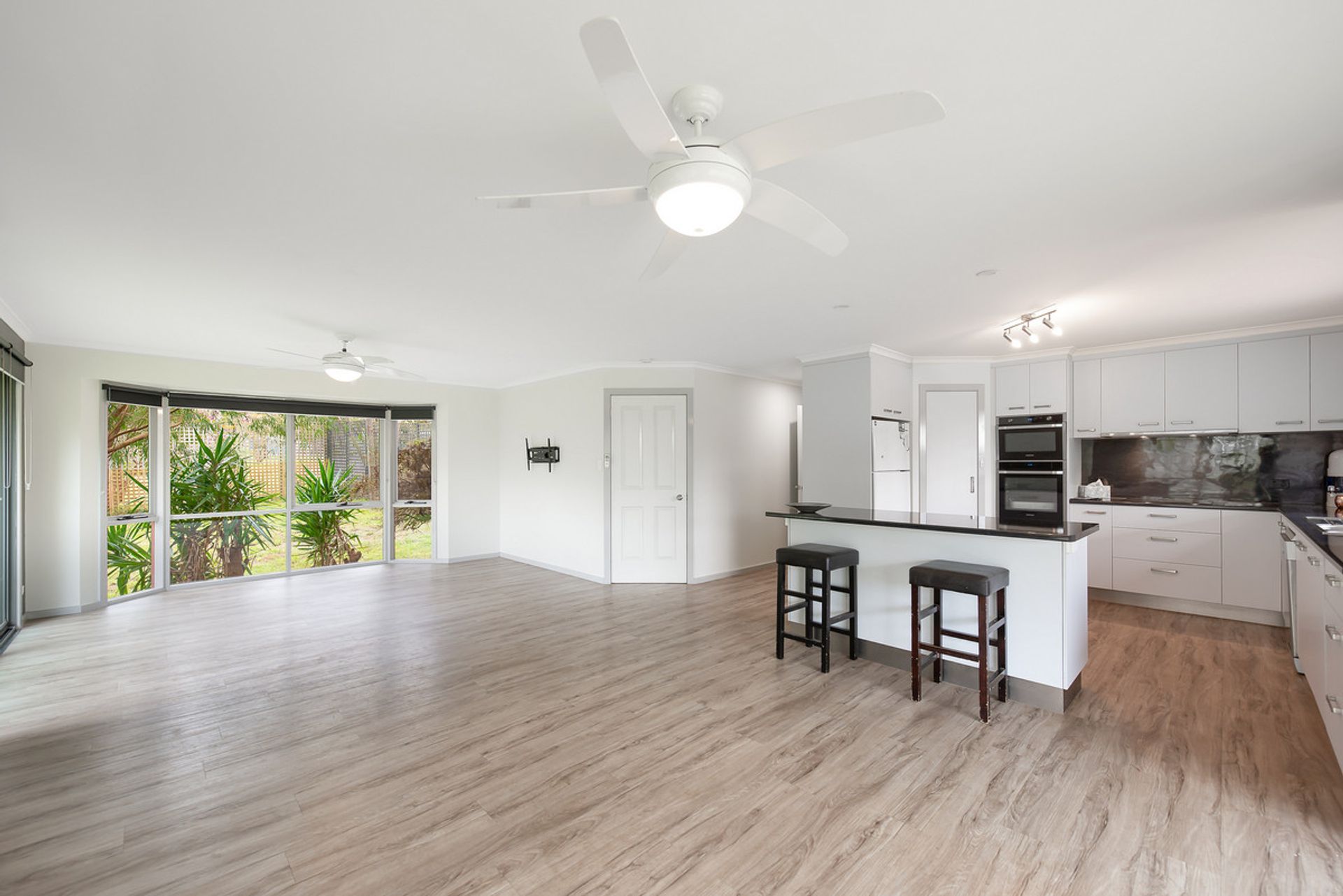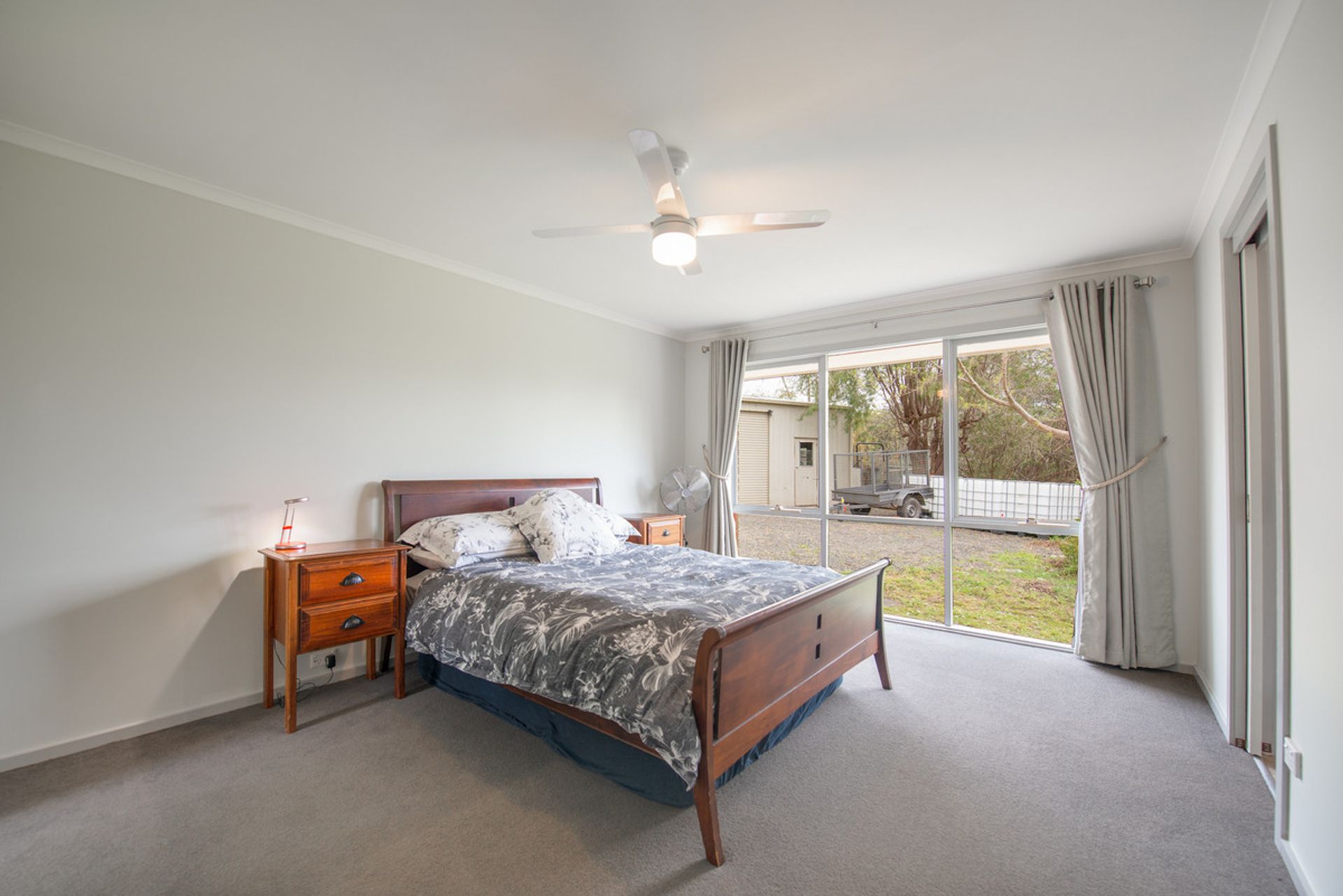 The heart of the home, the adjoining lounge, dining and kitchen are open plan by design delivering an attractive bay window, two ceiling fans, split system, and vinyl floors for practicality. Large windows draw in loads of natural light whilst framing the majestic country surrounds.