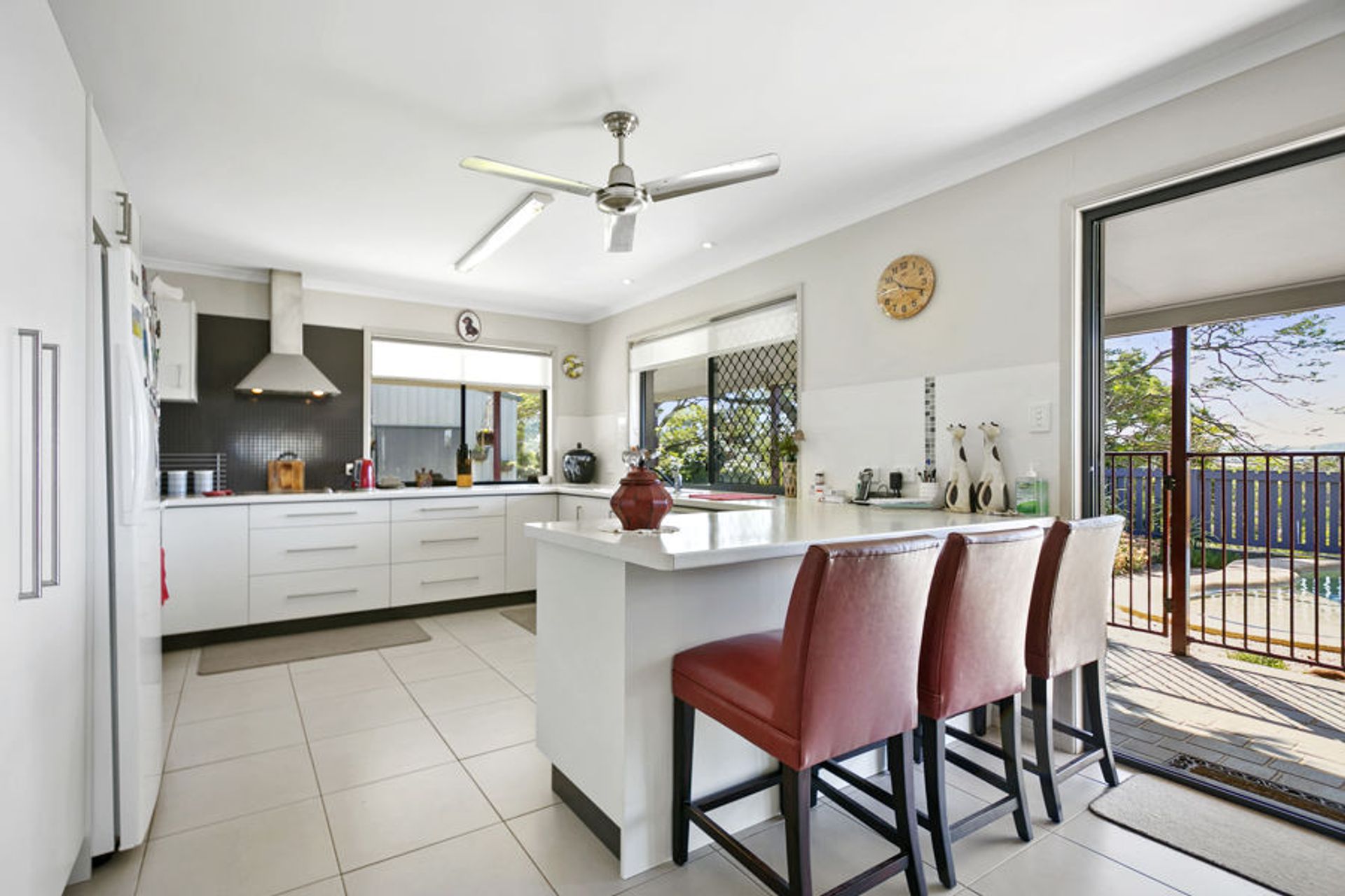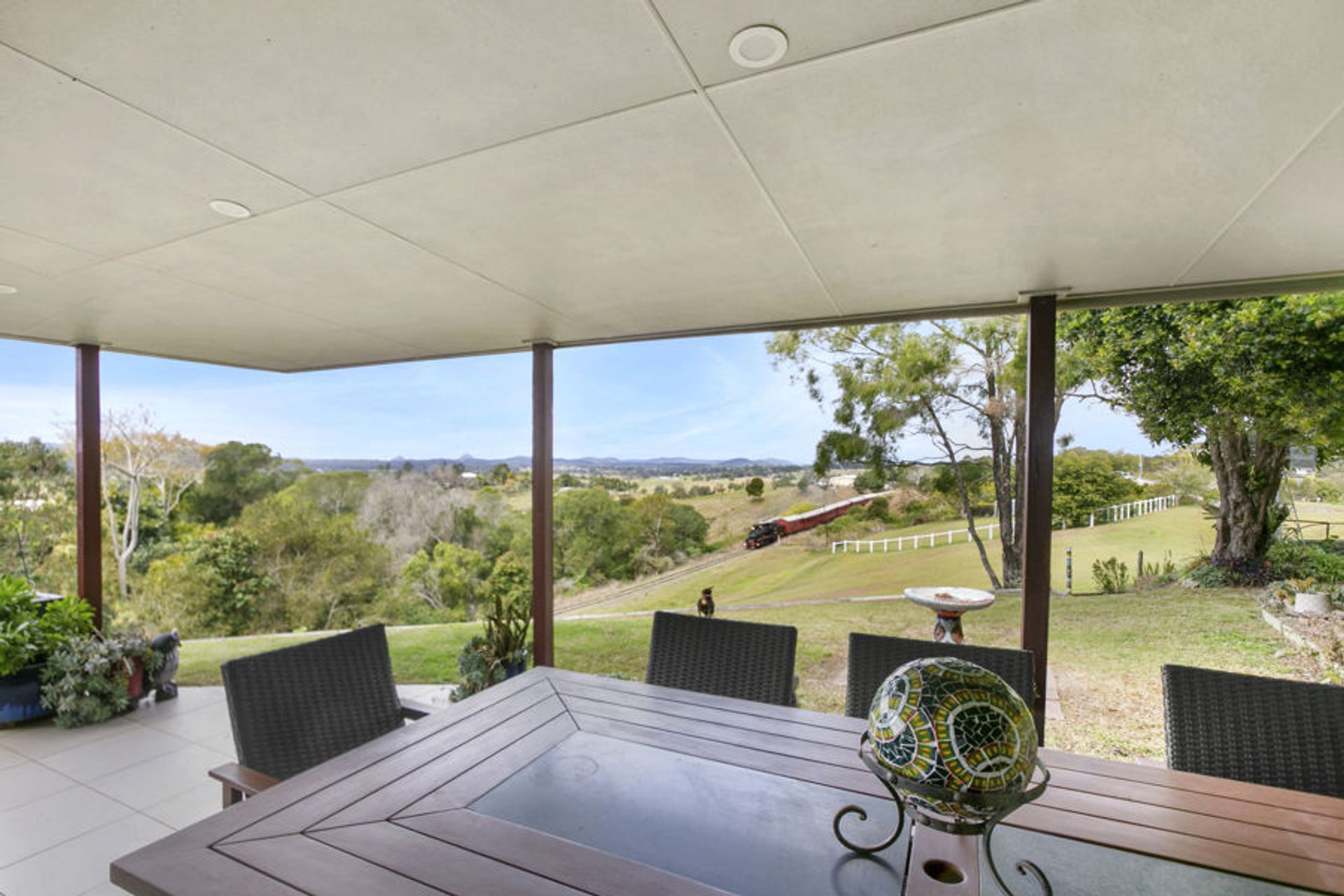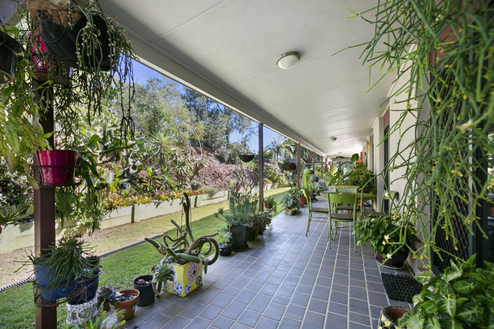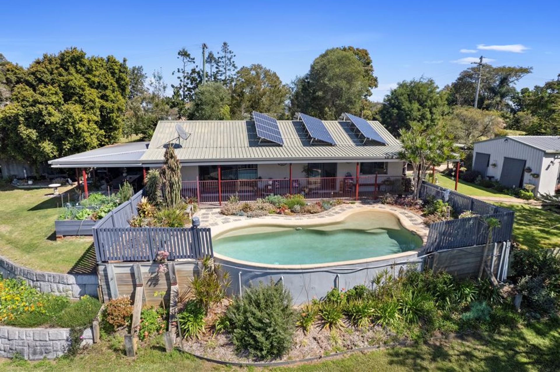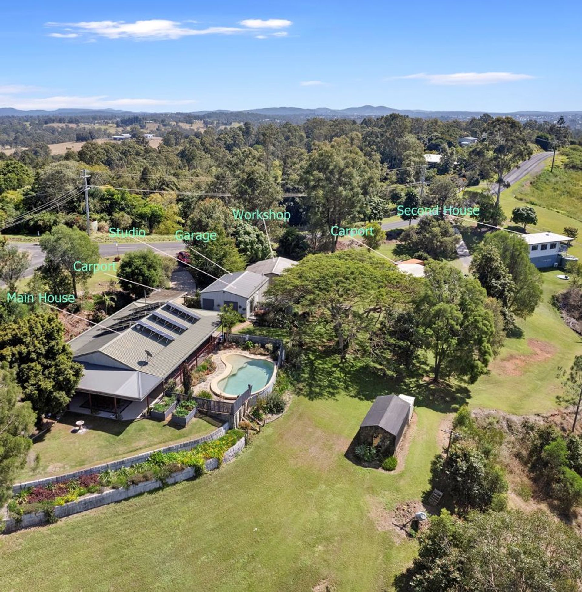 The rendered brick and tile home is a 3 bed home with wrap around verandahs and covered patio. With a sliding door and security screening exit to the patios from every room you will always enjoy the county breeze to keep you cool. Open plan tiled kitchen/dining and living area overlooking the 8 x 4m kidney beach pool with views over the valley.