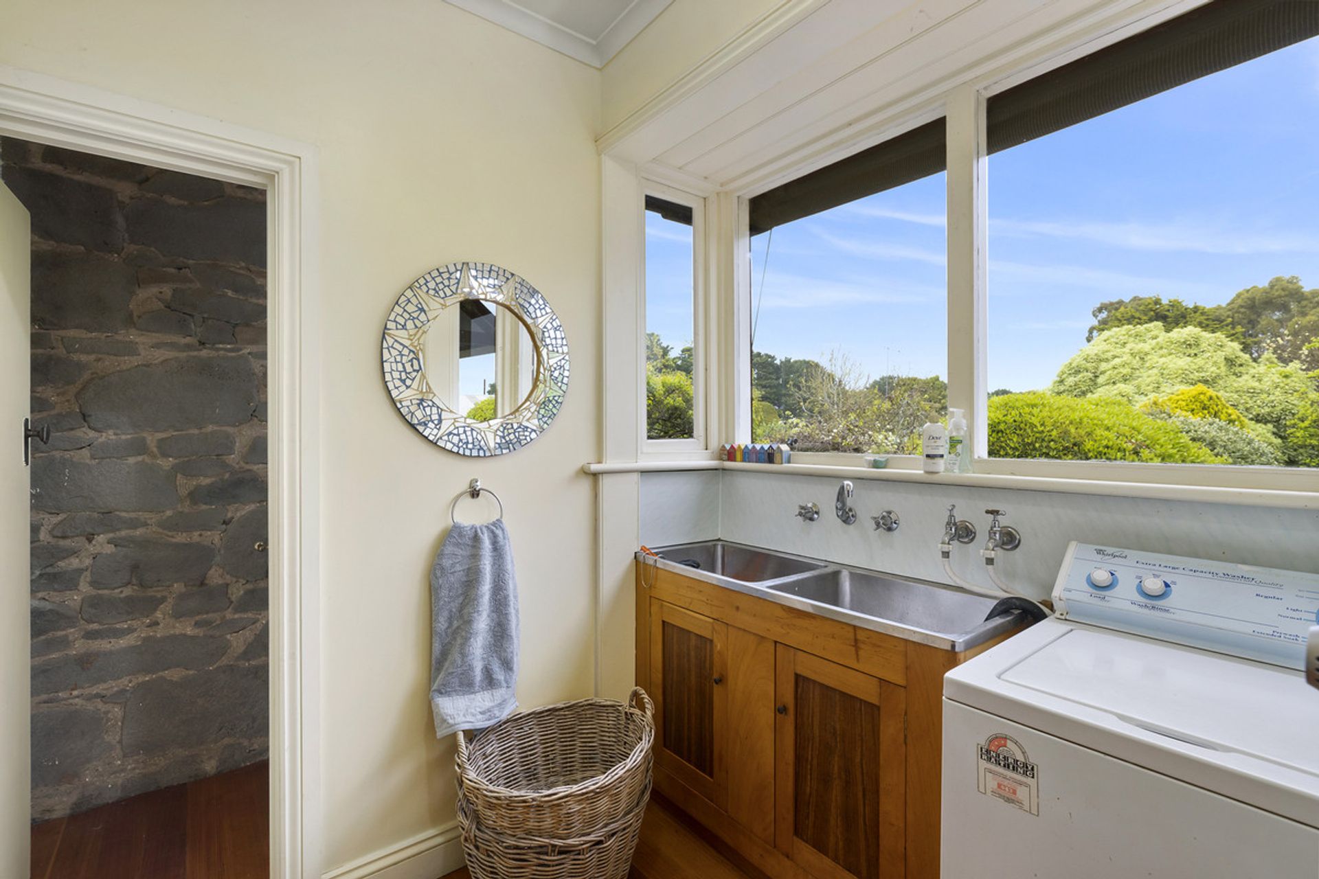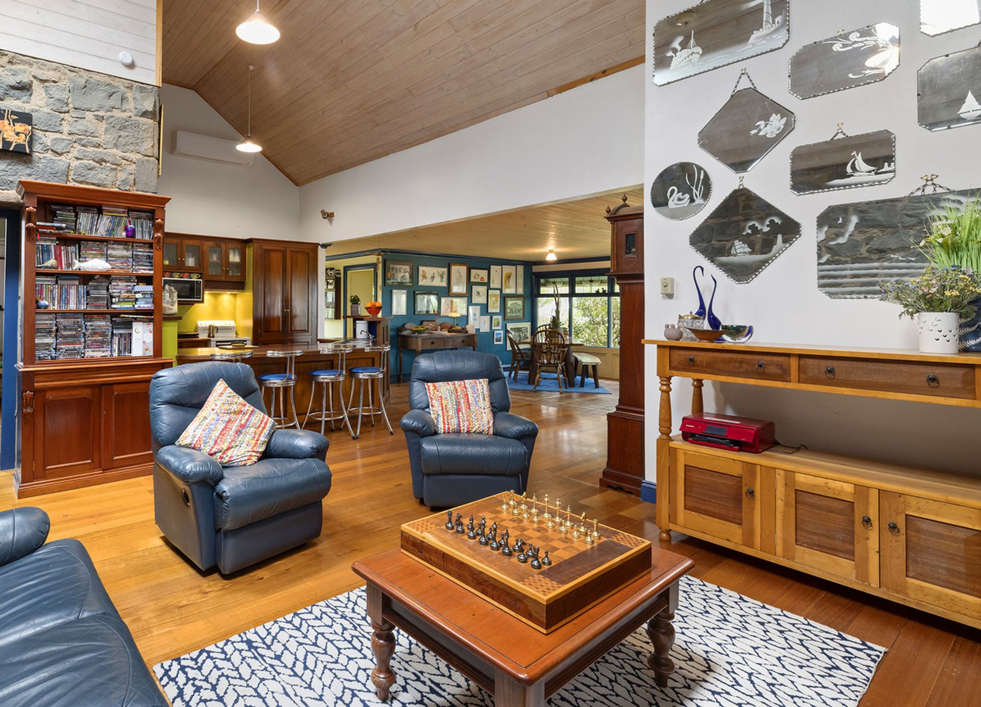 The kitchen is beautifully appointed with craftsman built jarrah cabinetry, hardwood floors with a sit up breakfast bar. Stain glass feature windows, polished floor boards and exposed blue stone walls create a dramatic country warmth to this family home.