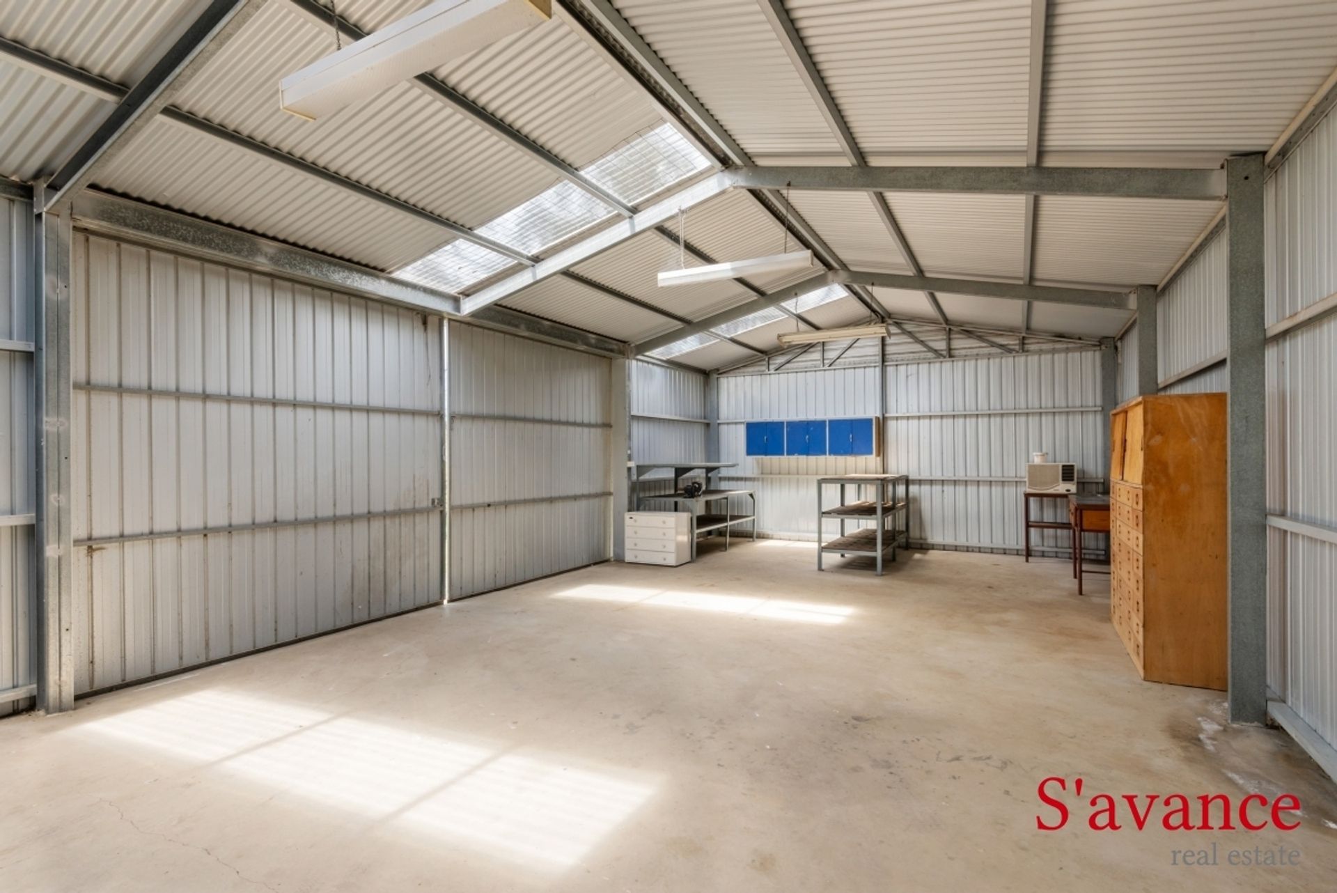 * 12m x 6m shed with high clearance & heavy-duty concrete floor & power. 3 built-in benches.